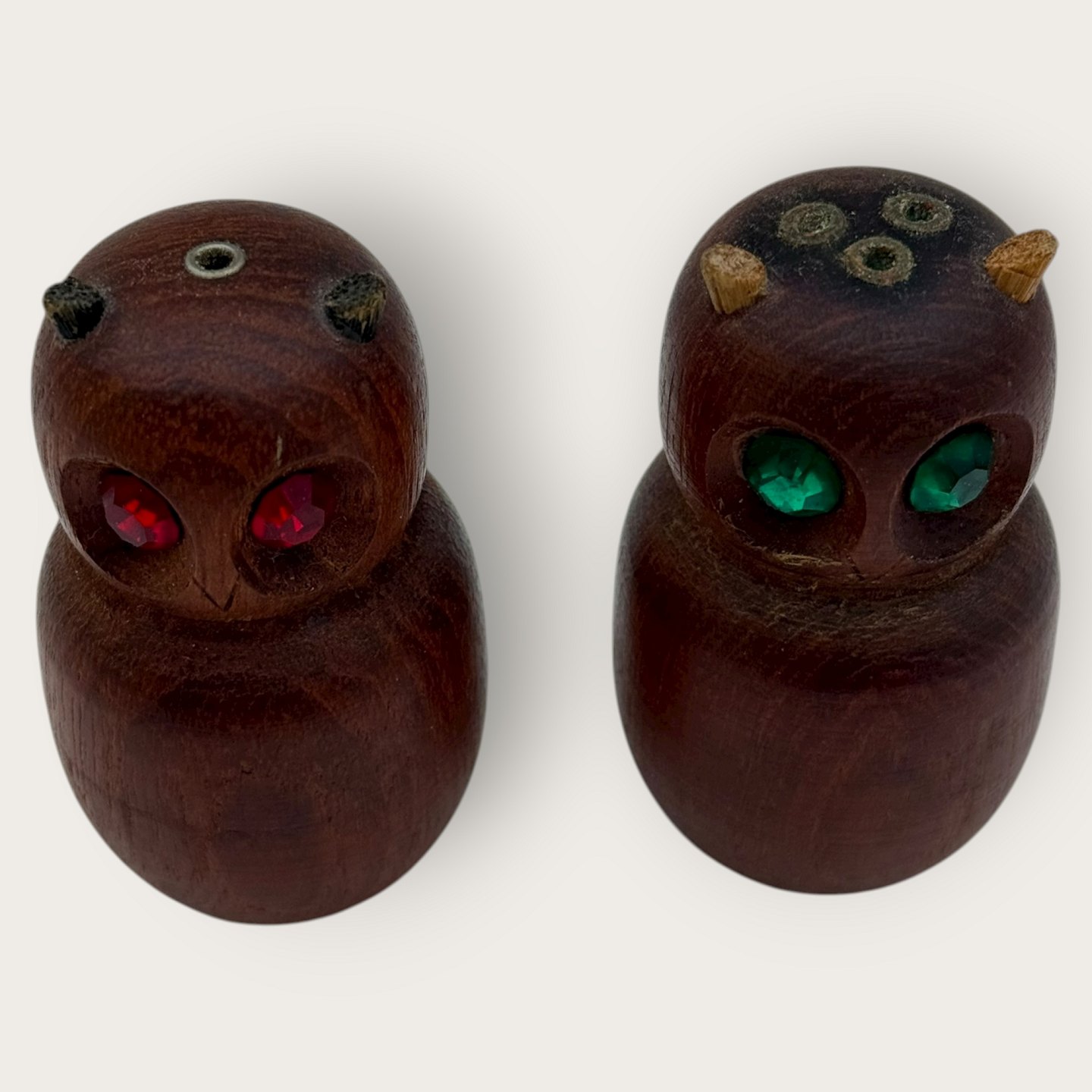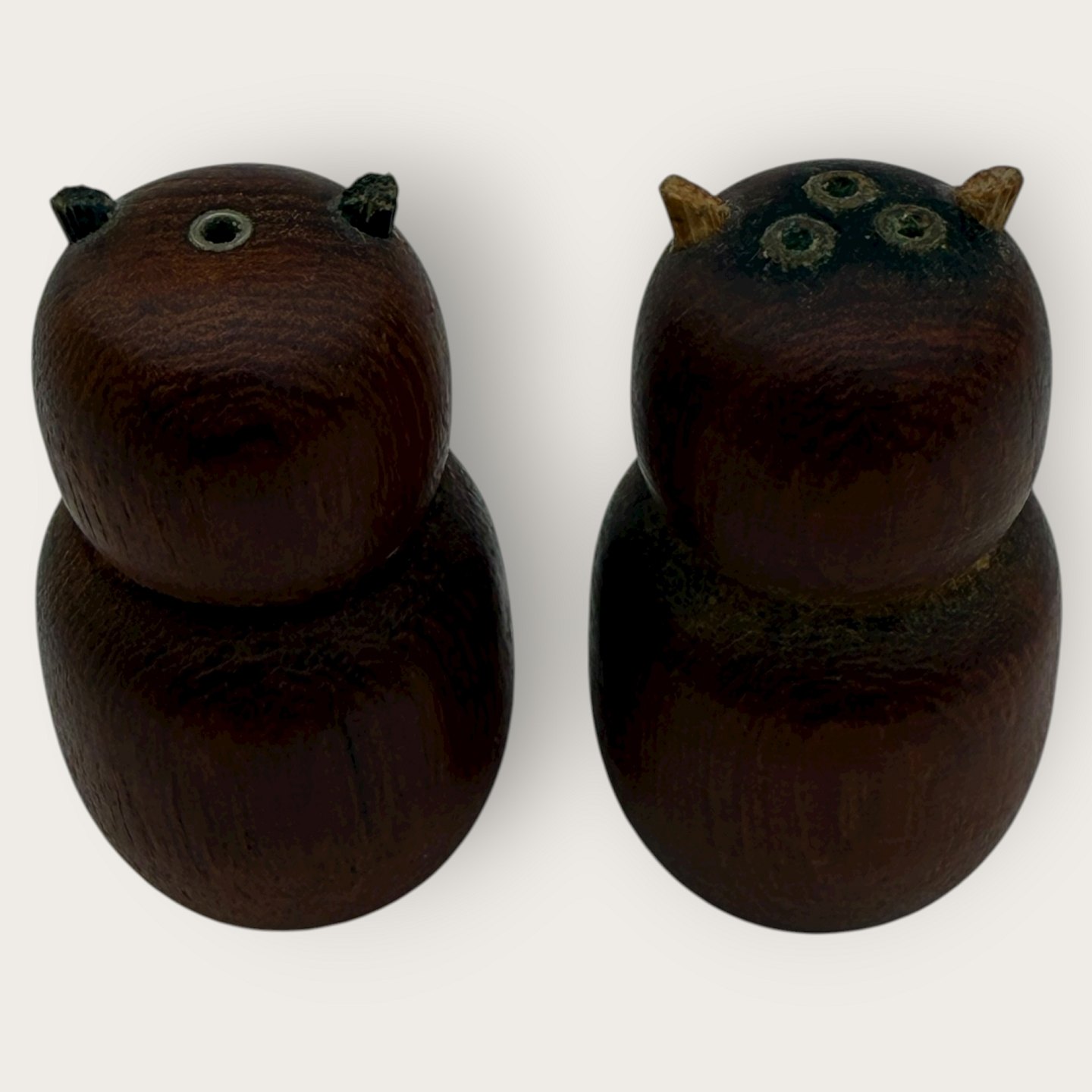 Salt and pepper set in teak wood from the 1960s, birds / owls with green and red eyes, appears nicely patinated and without bottom plugs.Stock: 1