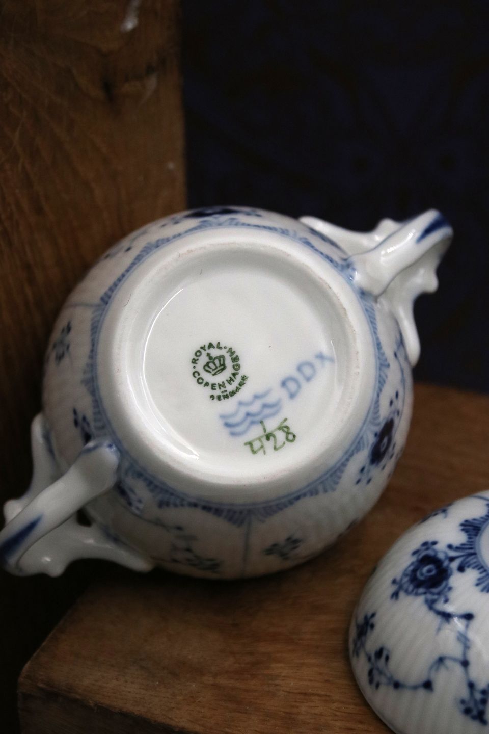 Royal Copenhagen Blue Fluted Plain sugar bowl with lid and handle. Decoration number: 1/428. H: 9.5cm. 1.sort. from 1966.Is complete and in fine condition.