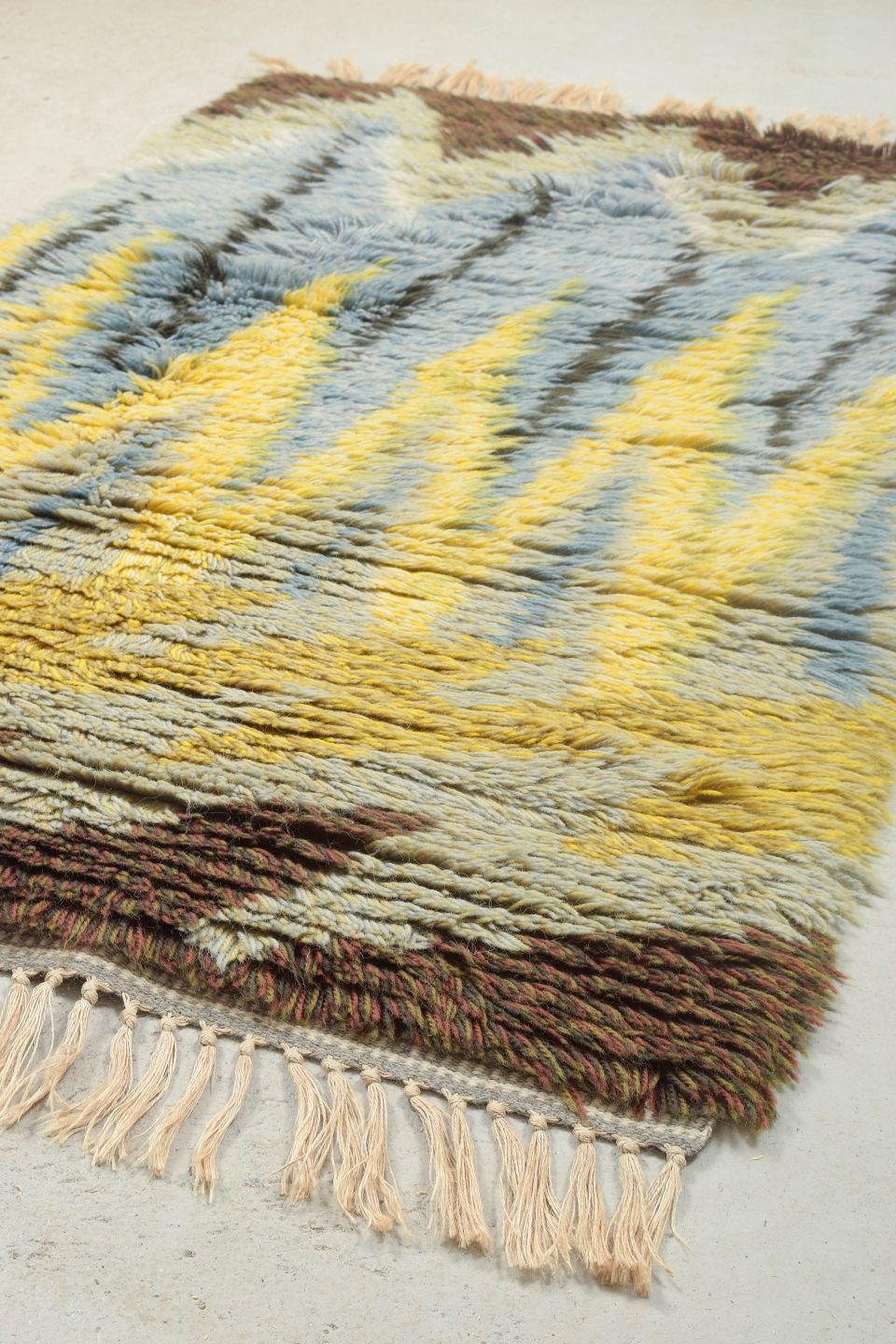 Hand-knotted rya carpet in wool with a zigzag-inspired pattern in shades of yellow, blue, brown, and grey. A distinctive design from the period, using strong contrasts and geometric forms to create vibrancy and movement within the Scandinavian textile tradition.