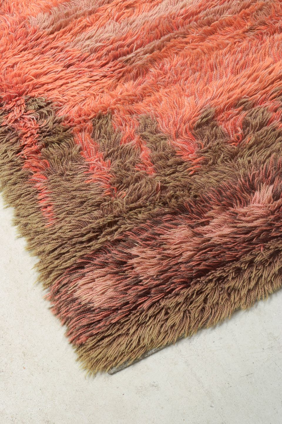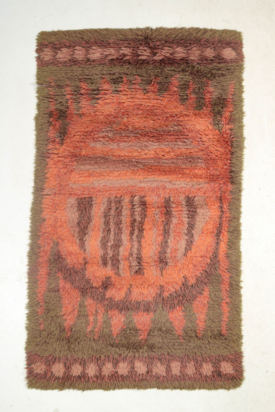 Hand-knotted rya carpet in wool featuring a sun-inspired motif in warm shades of orange, brown, and olive green. A striking and atmospheric design reflecting the period’s fascination with nature, colour symbolism, and organic forms in Scandinavian textile art.
