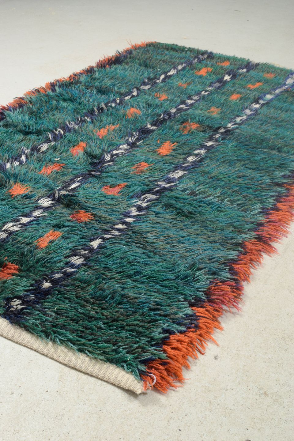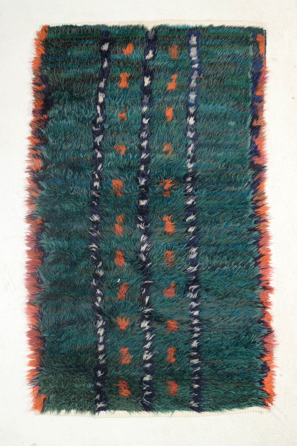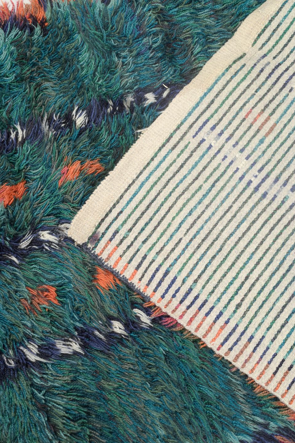 Hand-knotted rya carpet in wool featuring vertical bands and a rhythmic pattern in shades of green, blue, orange, and white. A colourful and textured piece typical of Scandinavian design from the period, combining experimental colour compositions with traditional craftsmanship.