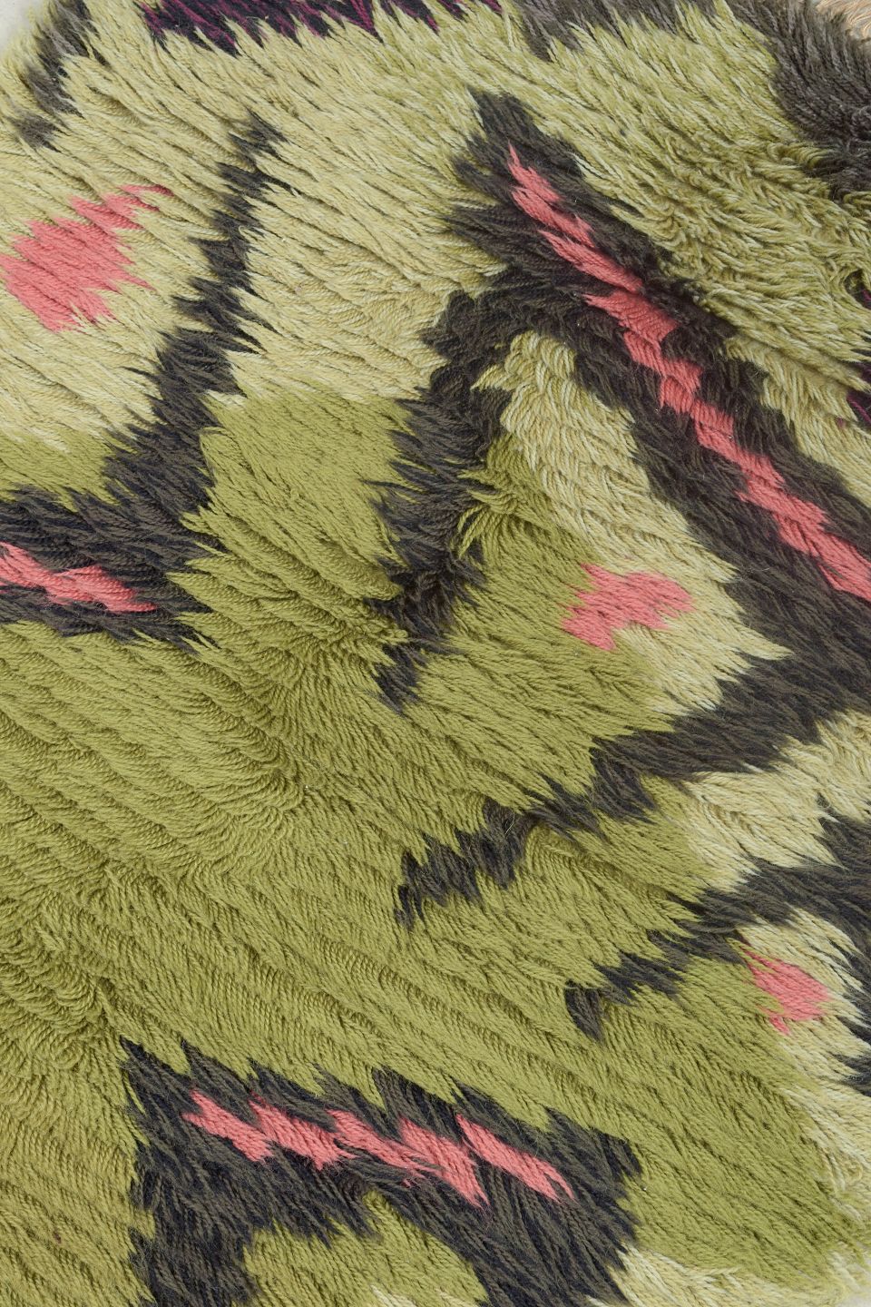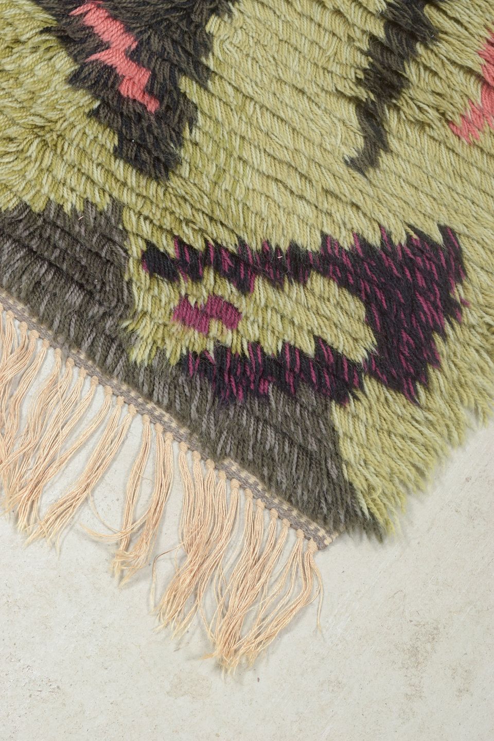 Hand-knotted rya carpet in wool with a graphic pattern in olive green, pink, black, and deep purple. A lively and distinctive design from the period, where bold colours and abstract shapes were used to create dynamic and artistic textiles.