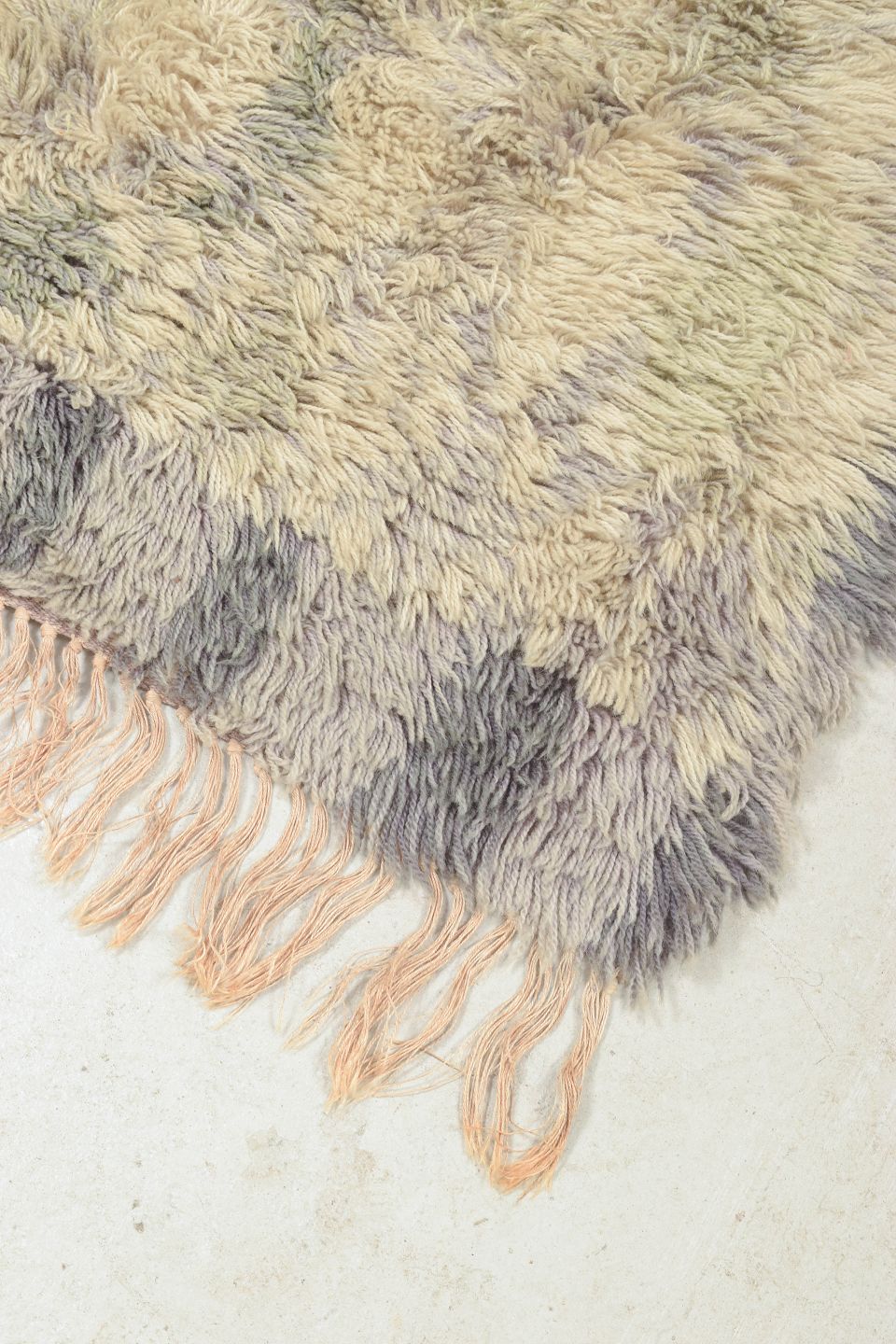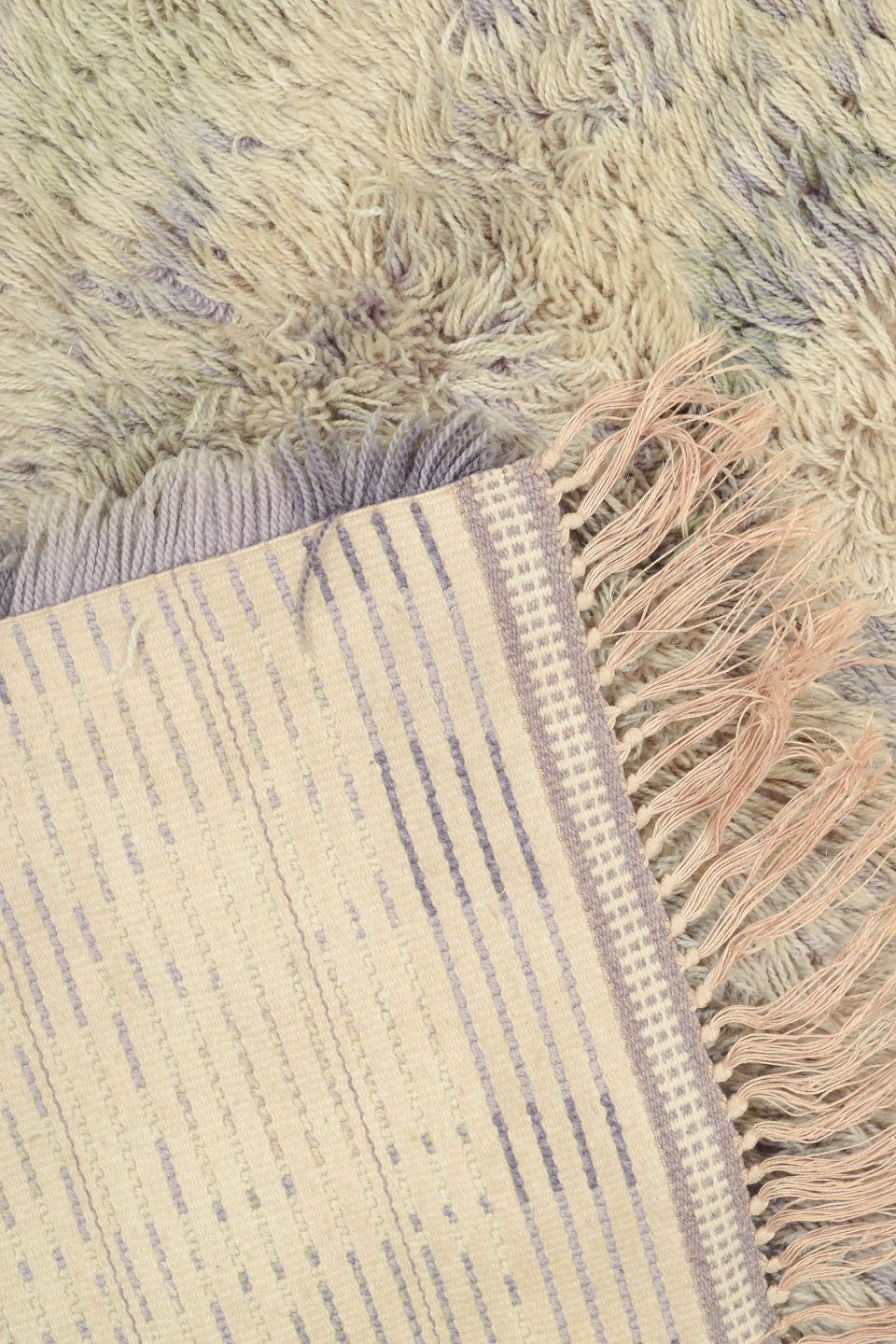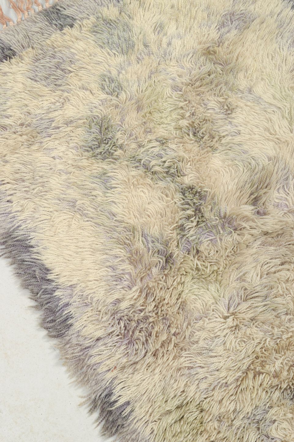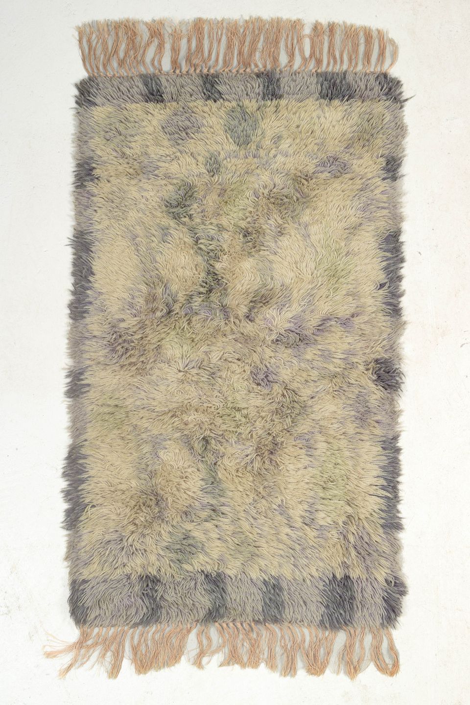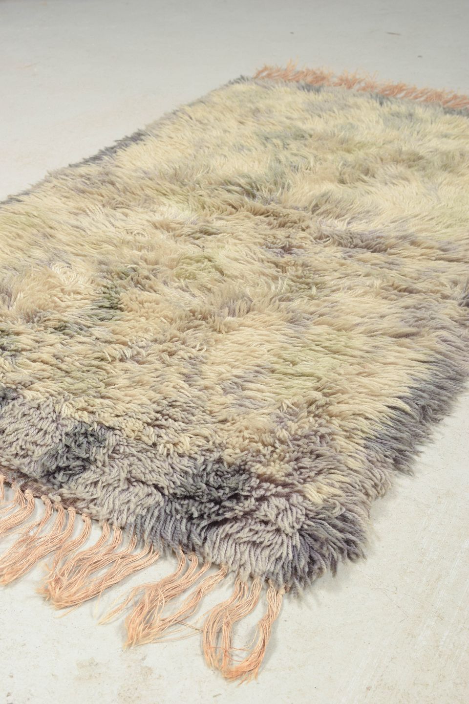 Hand-knotted rya carpet in wool with a soft, high pile in shades of grey, beige, and subtle lilac. A subdued and elegant design typical of Scandinavian textile art from the period, where natural tones and textures were used to create calm and balanced interiors.