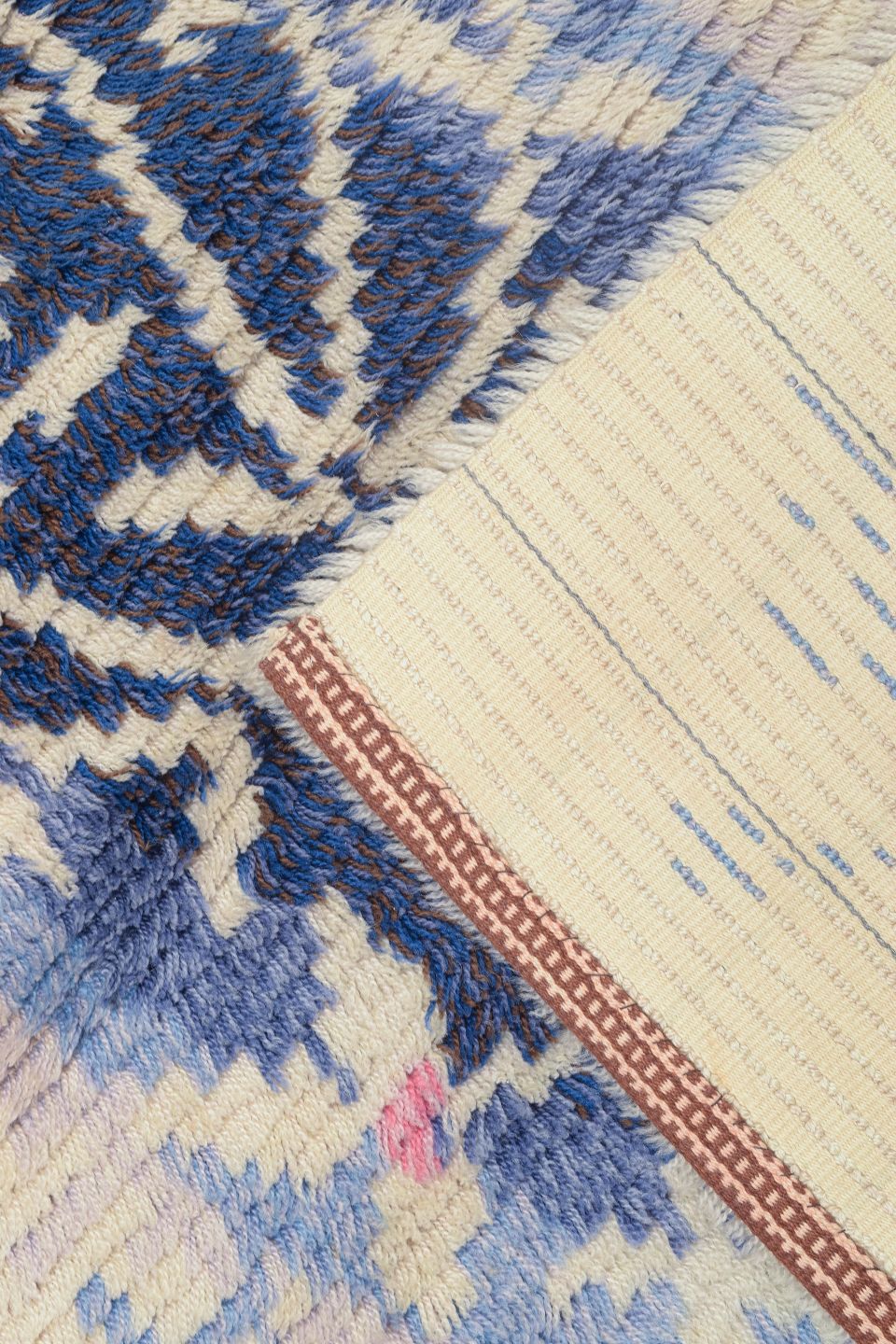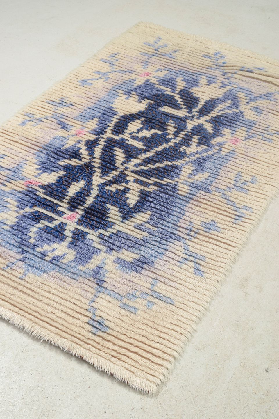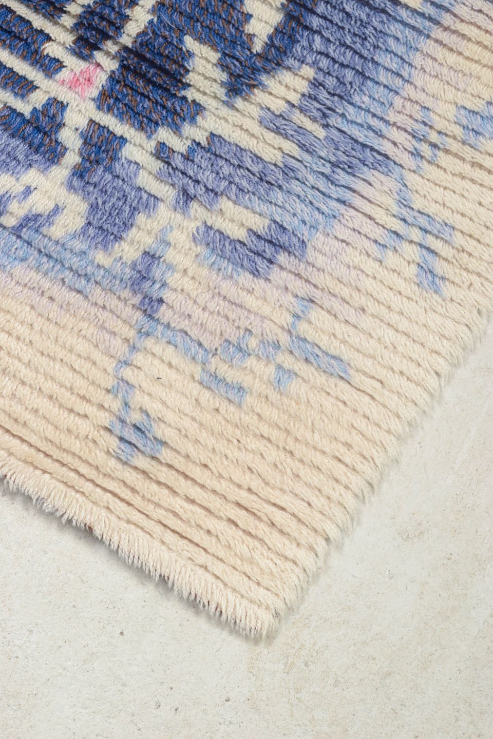 Hand-knotted rya carpet in wool with a floral-inspired motif in blue and pink tones on a light background. An elegant and decorative textile typical of Scandinavian design from the period, where natural motifs and soft colour transitions created warmth and harmony in interior spaces.