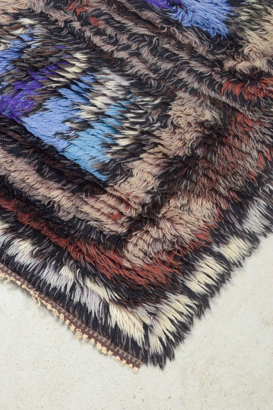Hand-knotted rya carpet in pure wool with a geometric pattern in shades of blue, purple, brown, and beige. A characteristic design from the period, using contrast and rhythmic forms to create depth and movement within the textile.