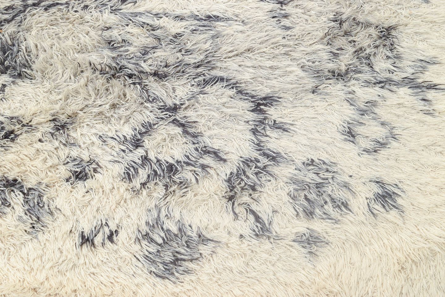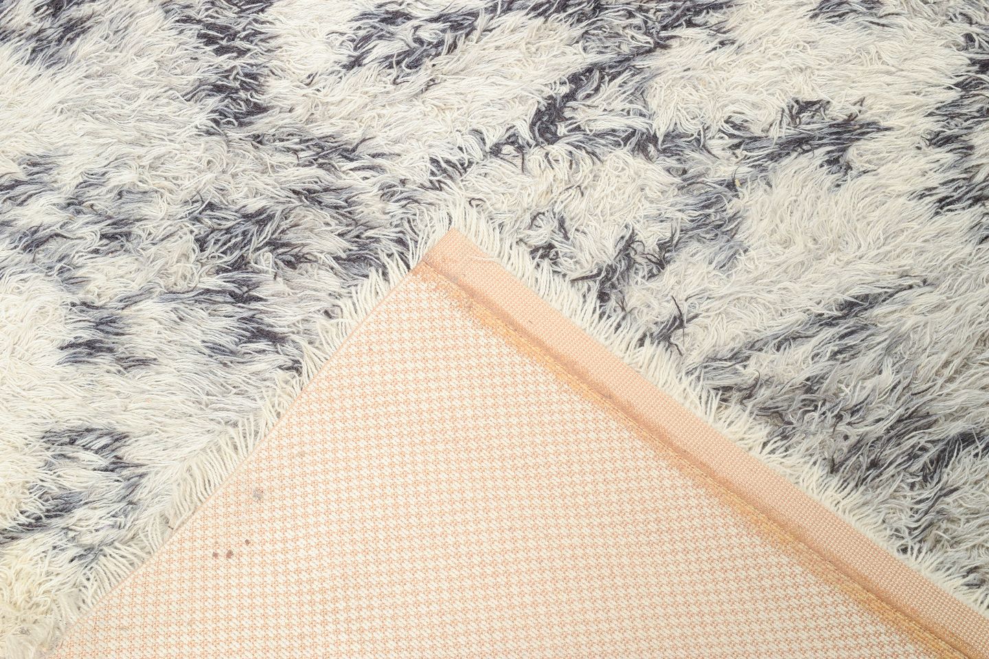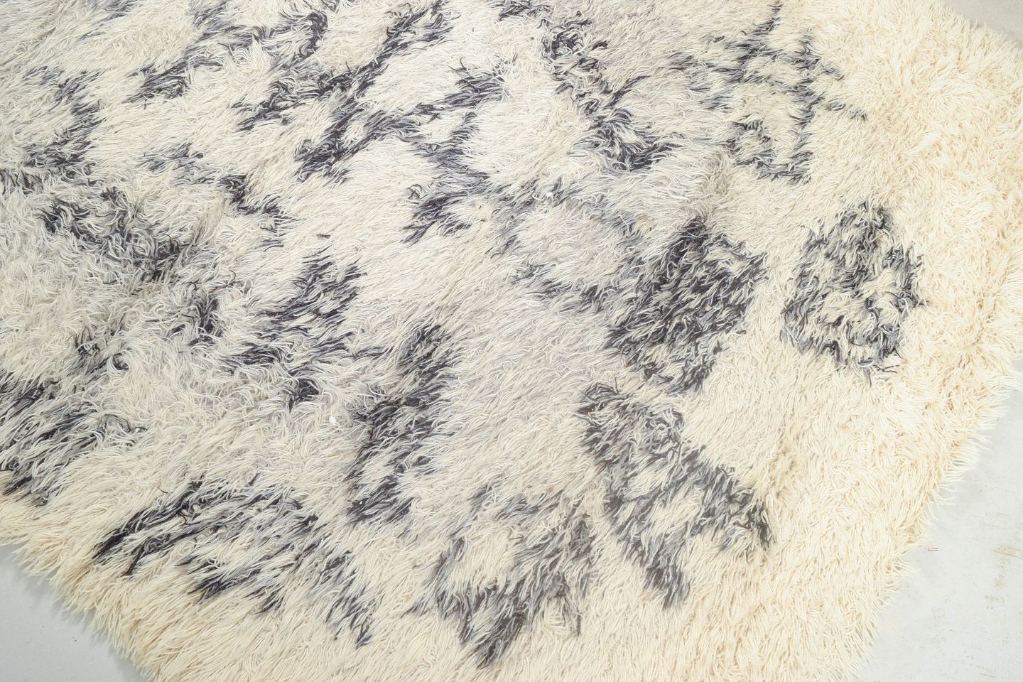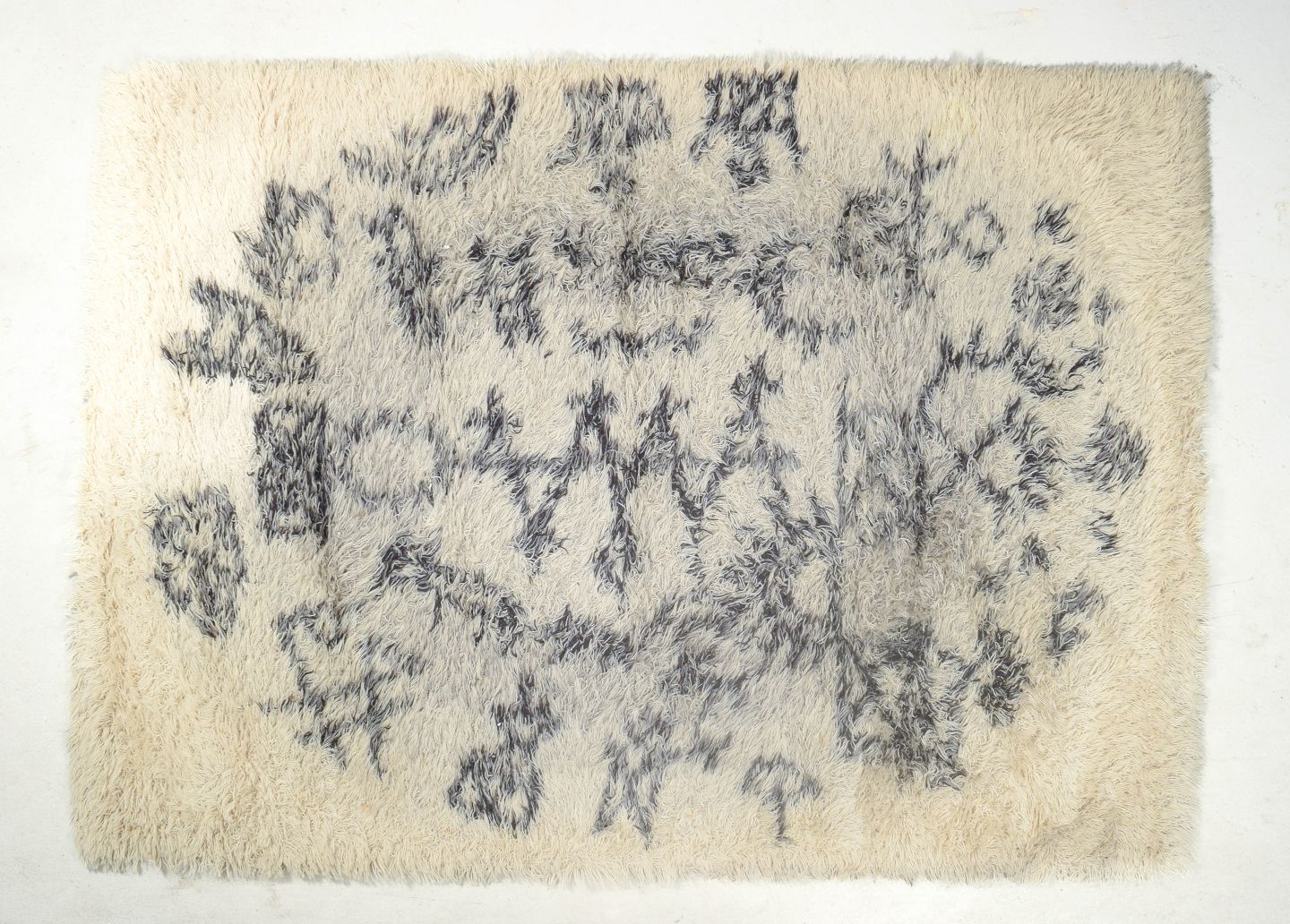 Large hand-knotted rya carpet in wool with an abstract pattern in black and grey on a light background. “Vikingstad” design by Clara Salander, a characteristic example of Swedish textile art from the period, combining craftsmanship, texture, and modernist form.