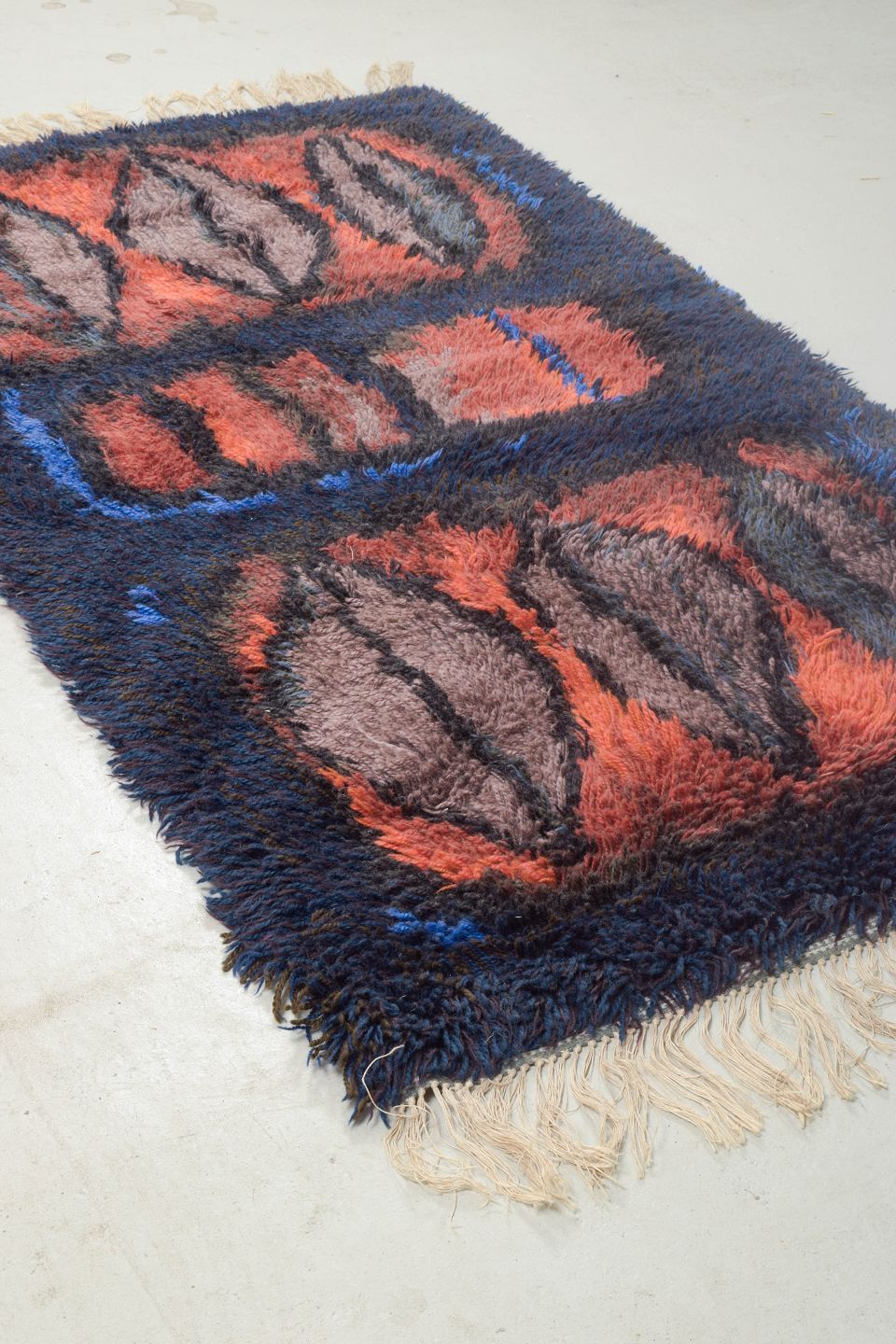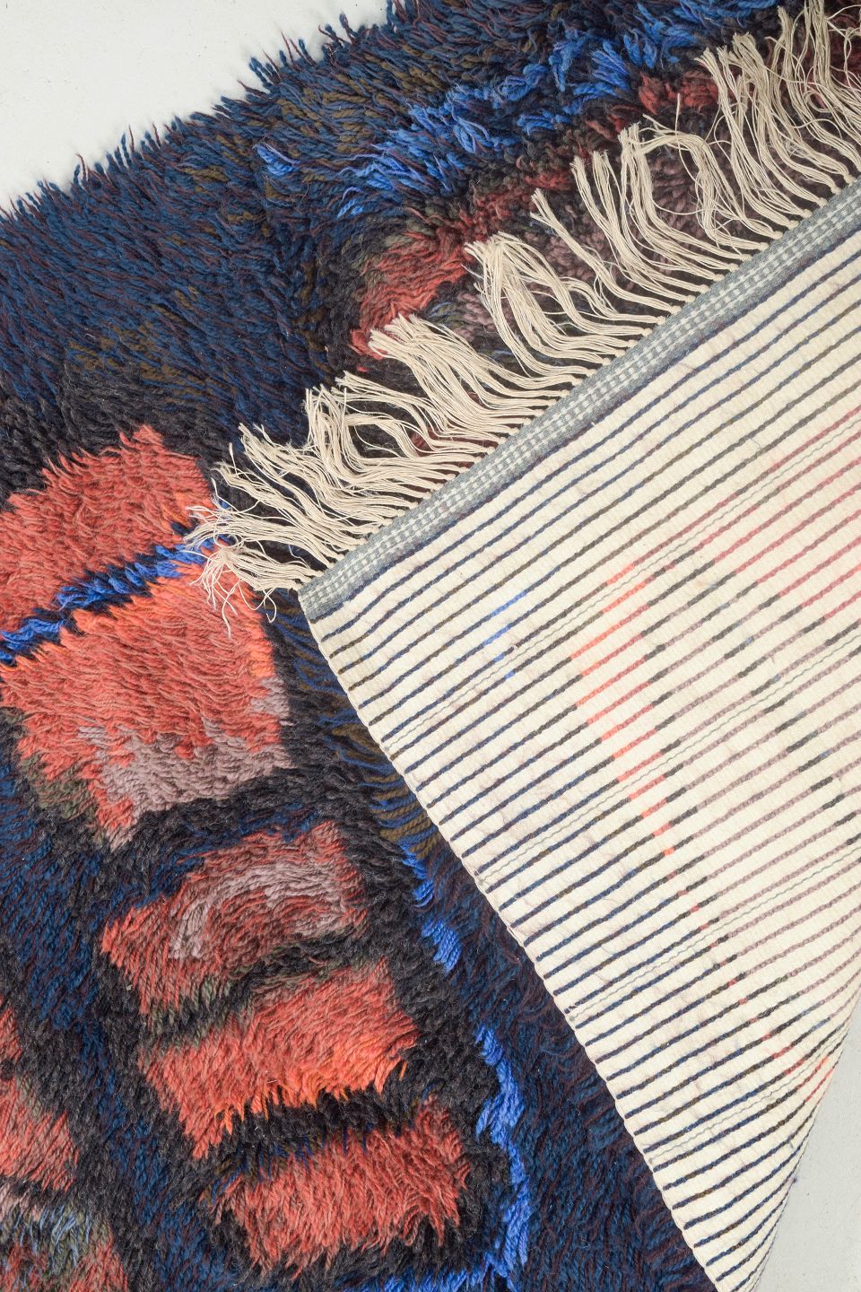 Hand-knotted rya carpet in pure wool with a geometric, almost sculptural pattern in warm red, black, and blue tones. Designed by Evy Viola Wiklund in 1967, this piece is a fine example of Swedish textile art from the period, where colour contrasts and organic forms were central elements.