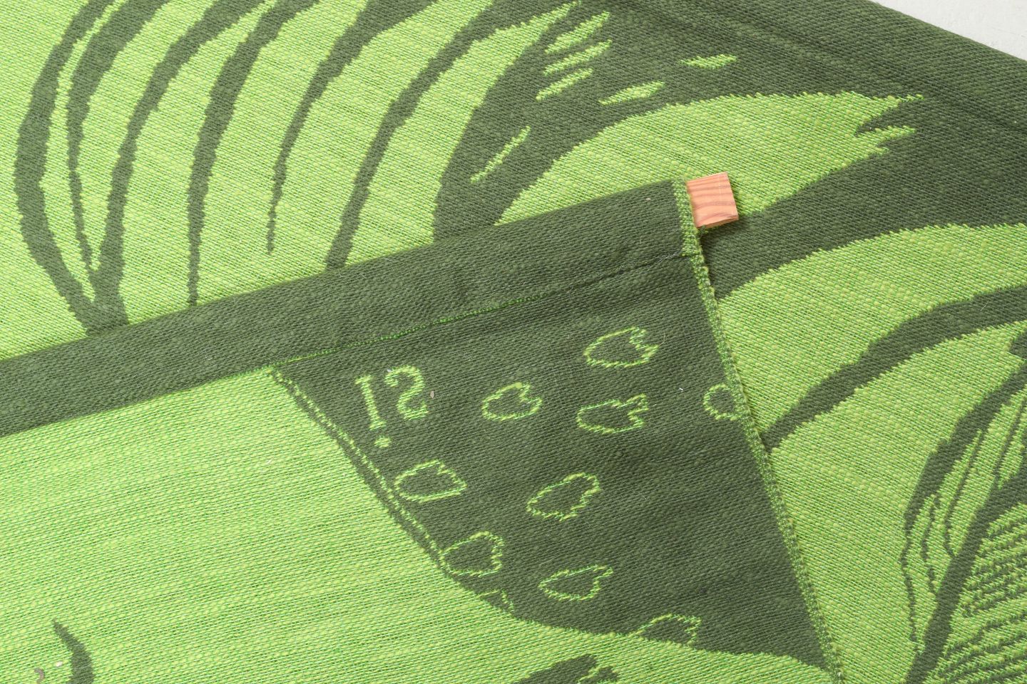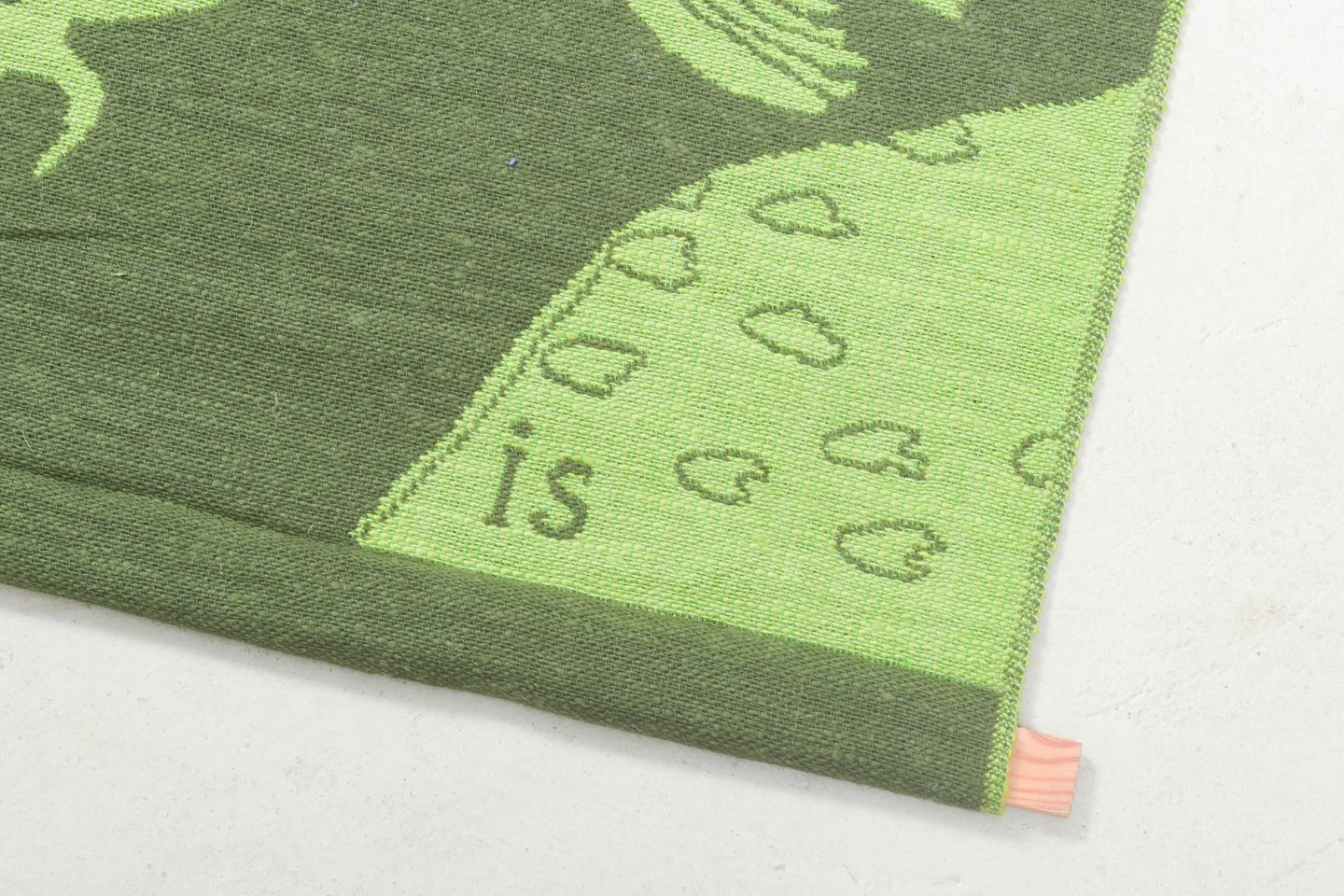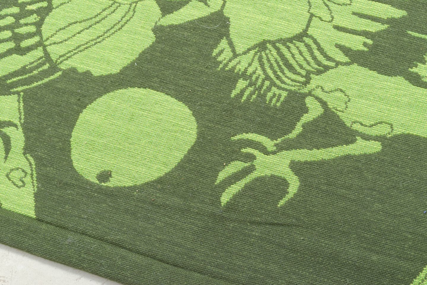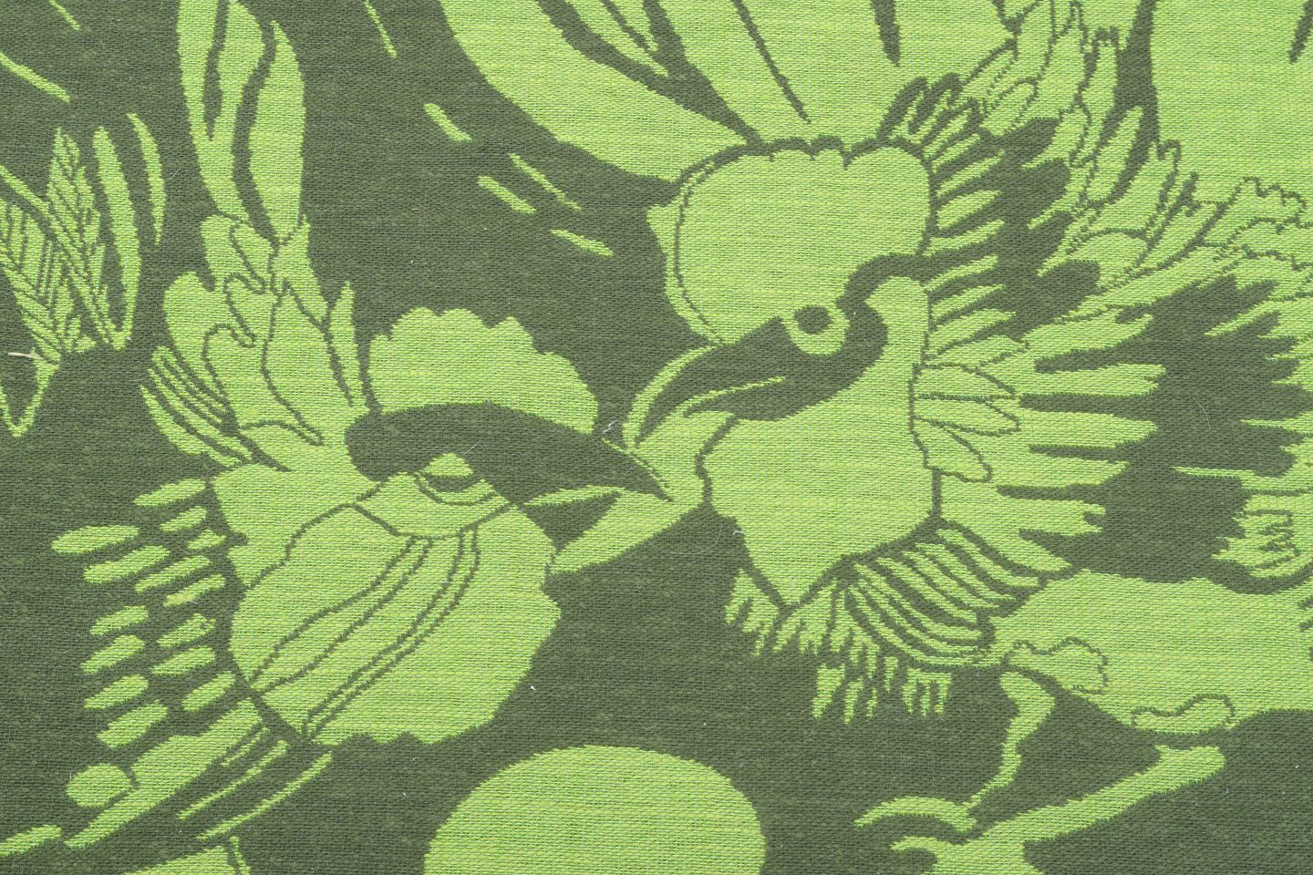 Hand-woven Swedish wall tapestry in pure cotton depicting two roosters in motion in shades of green. Signed “IS” in the weave. A decorative and characteristic work by textile artist Ingegerd Silow.