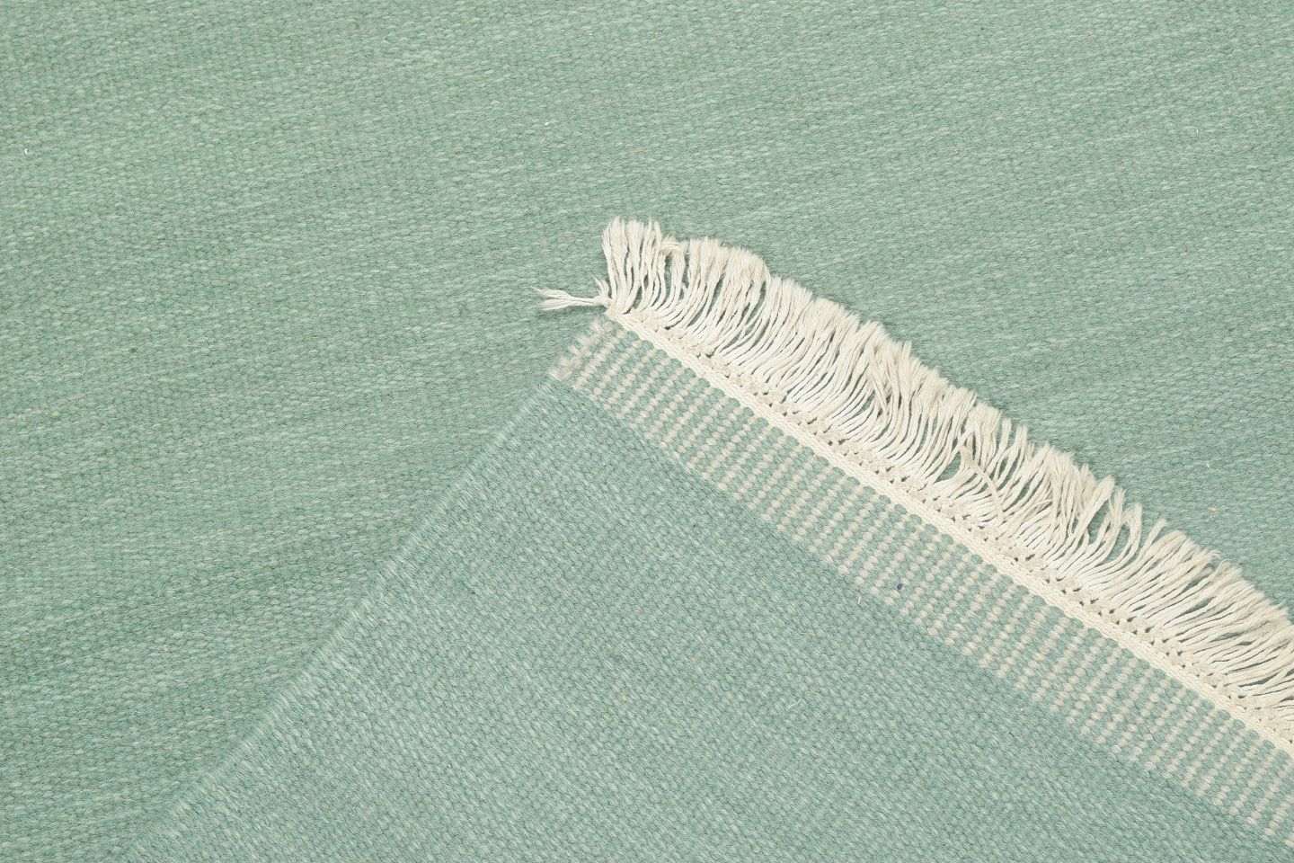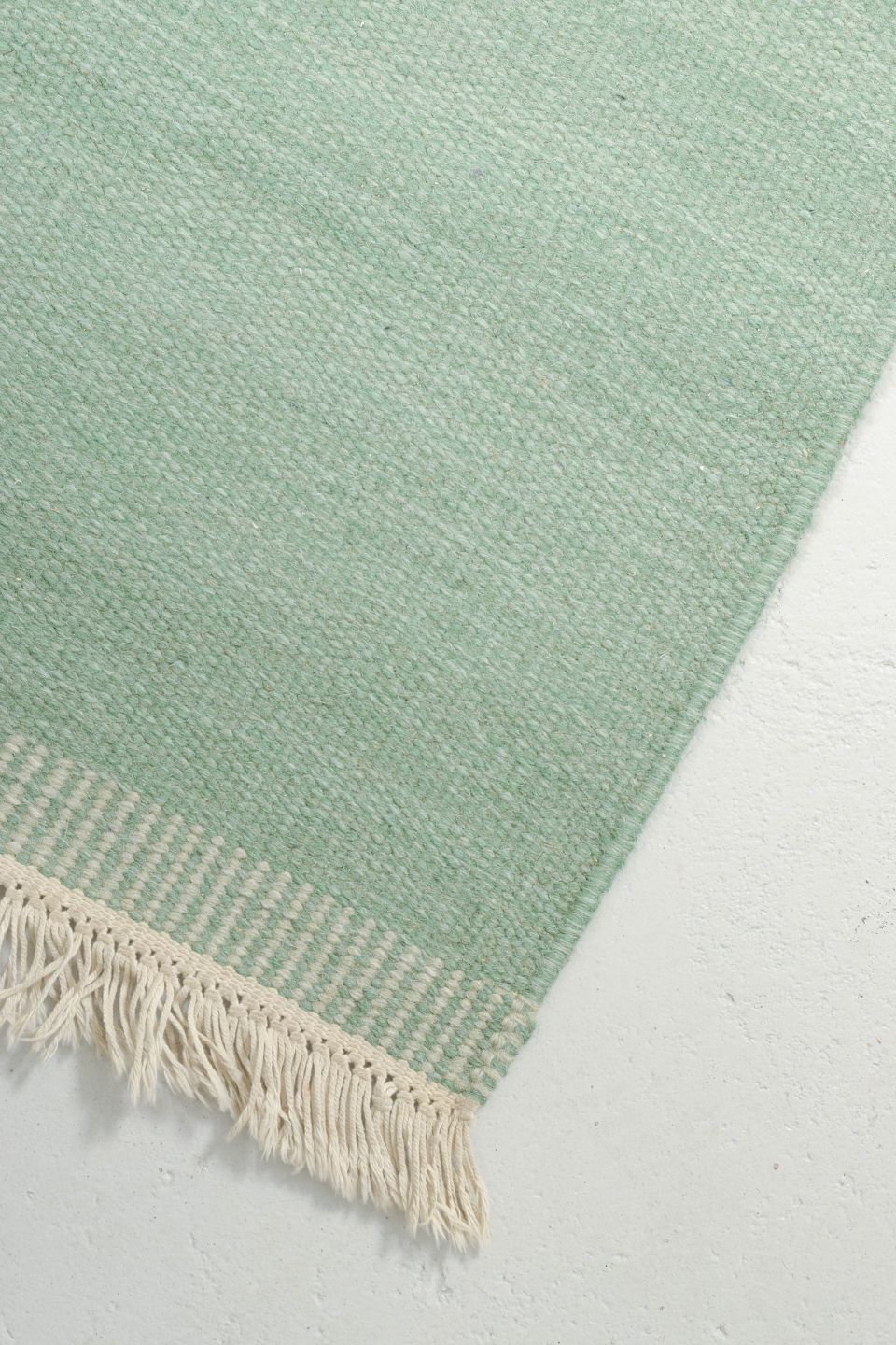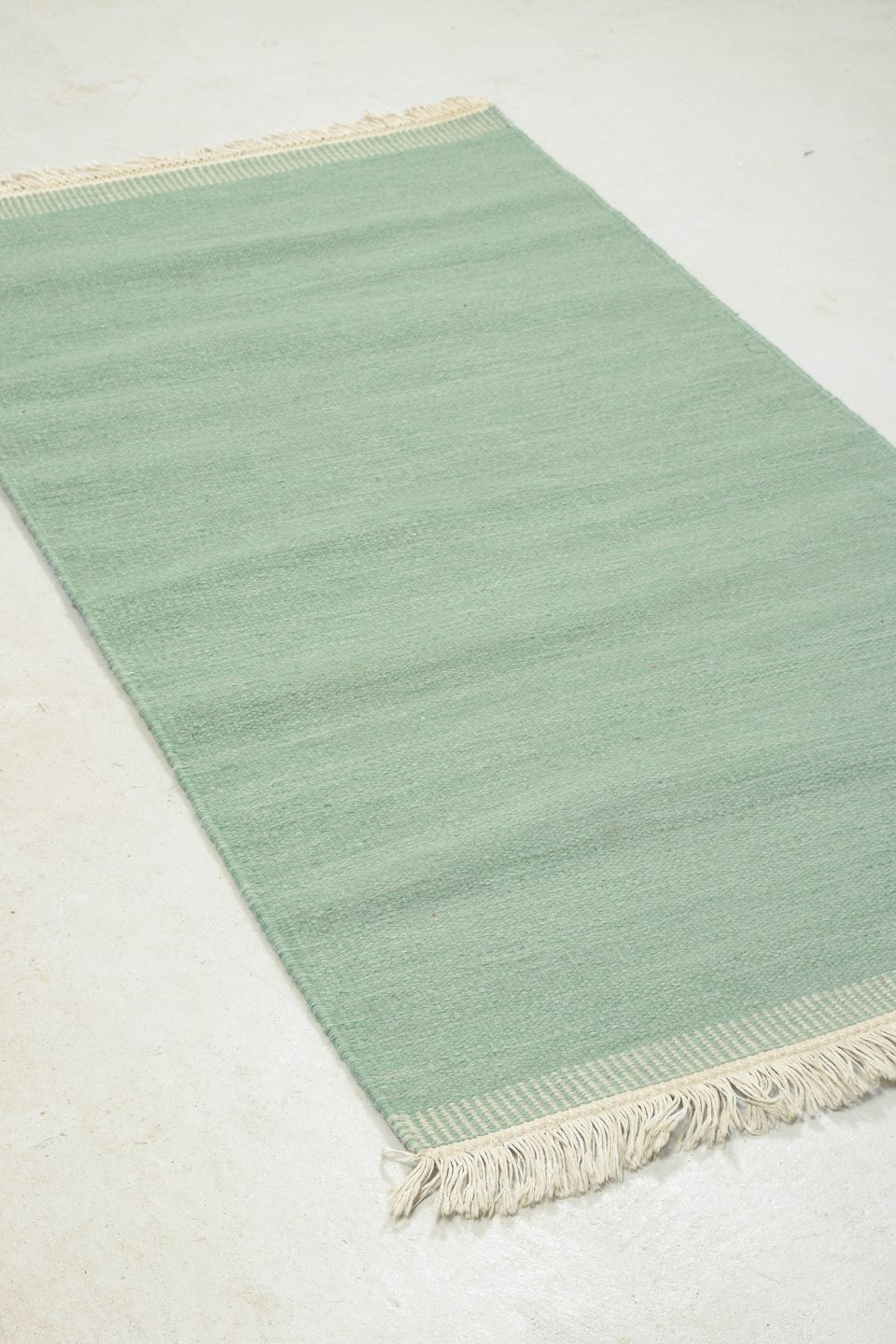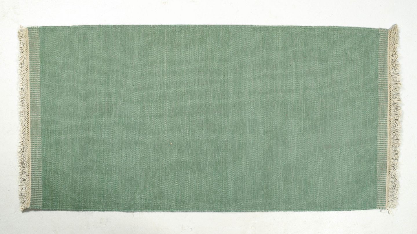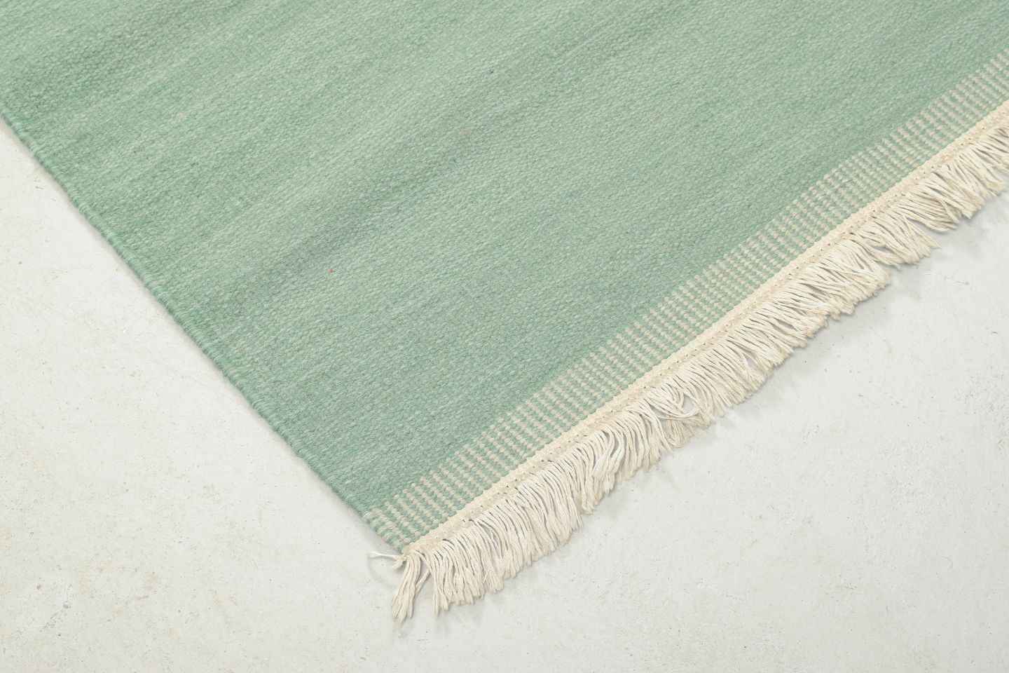 Handwoven rölakan rug in wool, featuring a solid muted green tone with fringes at both ends. A refined example of Swedish textile tradition, combining simplicity with fine craftsmanship.