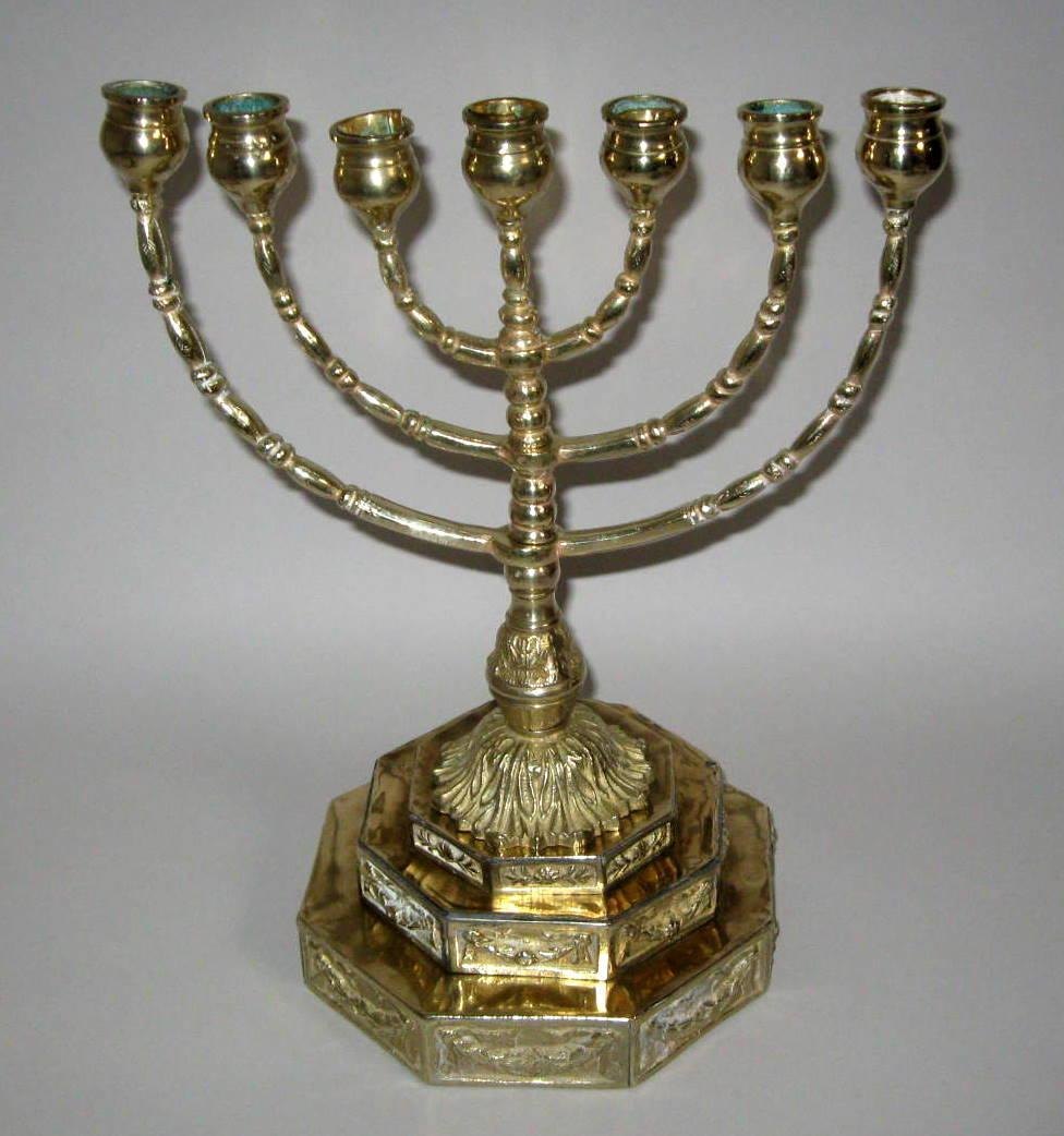 7 armed candlestick in brass / bronze, ca.1900. With octagonal foot with decorations in the form of festoons. Profiled stemm. The candlestick entailes symbolism from both the old and the new testament.Item number: 6439