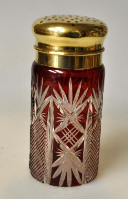 Antique Bohemian sugar bowl, 19th century. Crystal with brass lid. H.: 12 cm.Item number: 28498
