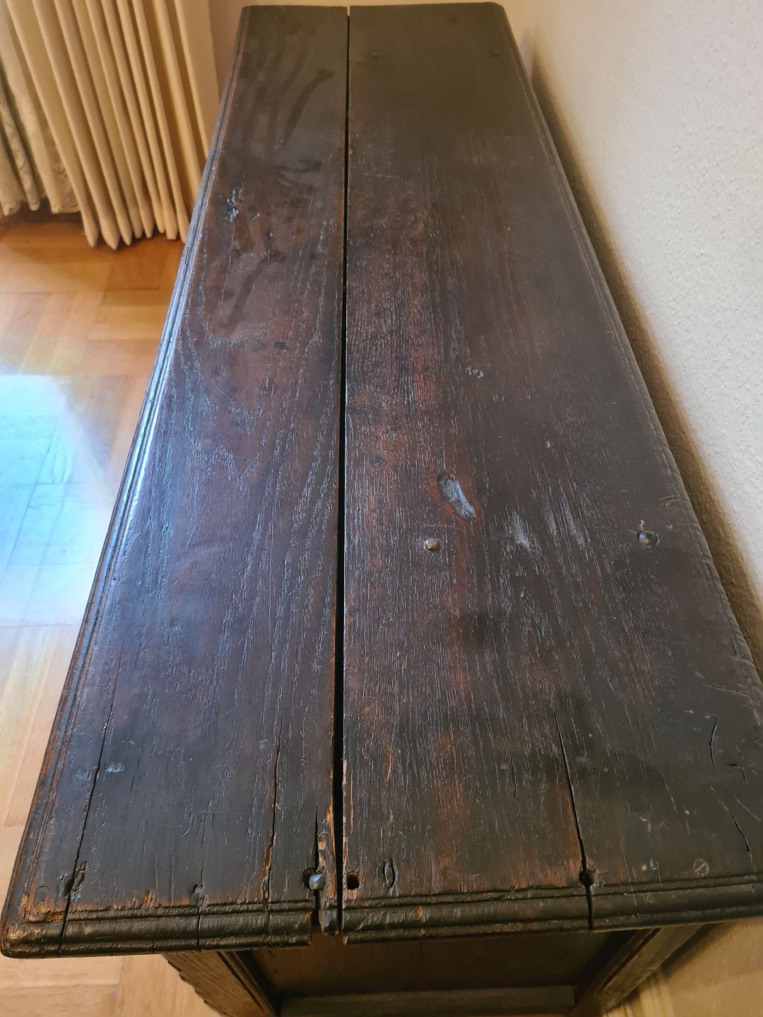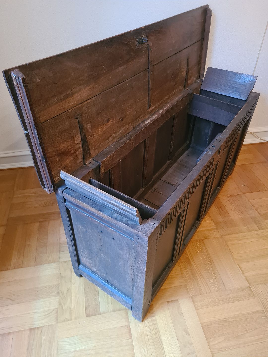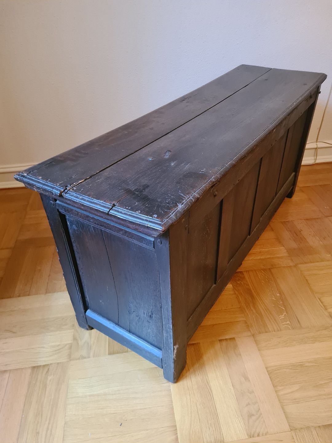 Brudekiste fra 1800 tallet i eg. Fremstår god, robust og ganske pæn for alderen. Højde 62 cm. Bredde 138 cm. Dybde 44 cm.