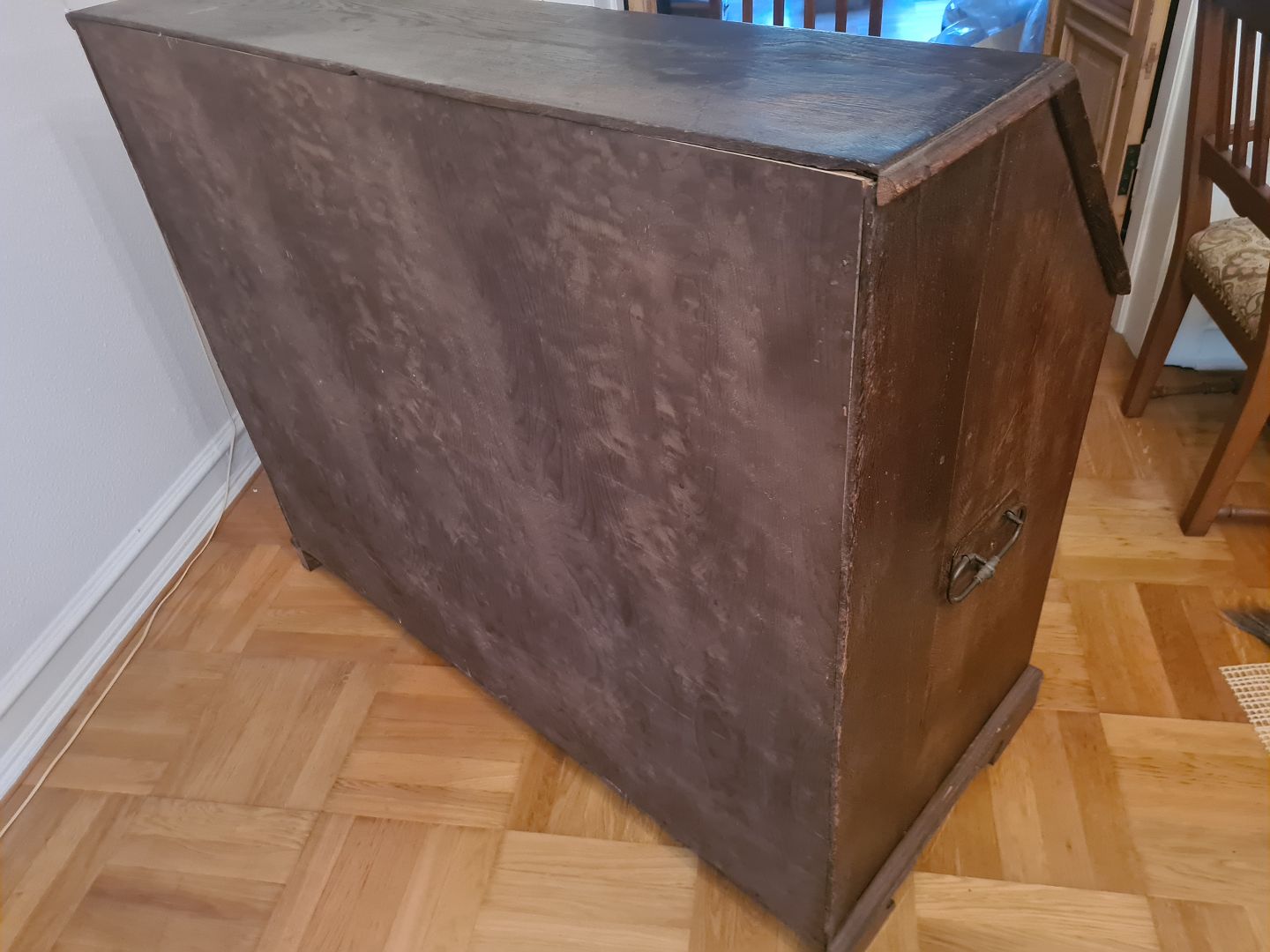 Chatol fra 1800 tallet i eg og med hemmelige skuffer. Fremstår pænt, funktionsdygtigt og velholdt. Højde 109 cm. Bredde 130 cm. Dybde 59 cm.