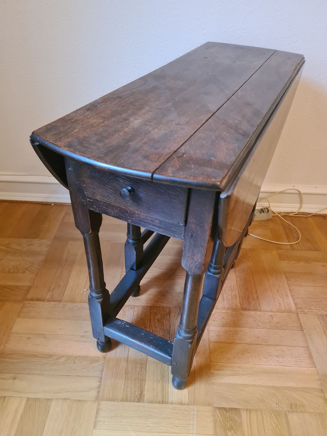Klapbord fra 1800 tallet i eg og med skuffe. Pænt, velholdt og udmærket funktionsdygtigt. Højde 70 cm. Længde 87 cm. Bredde 34 cm.
