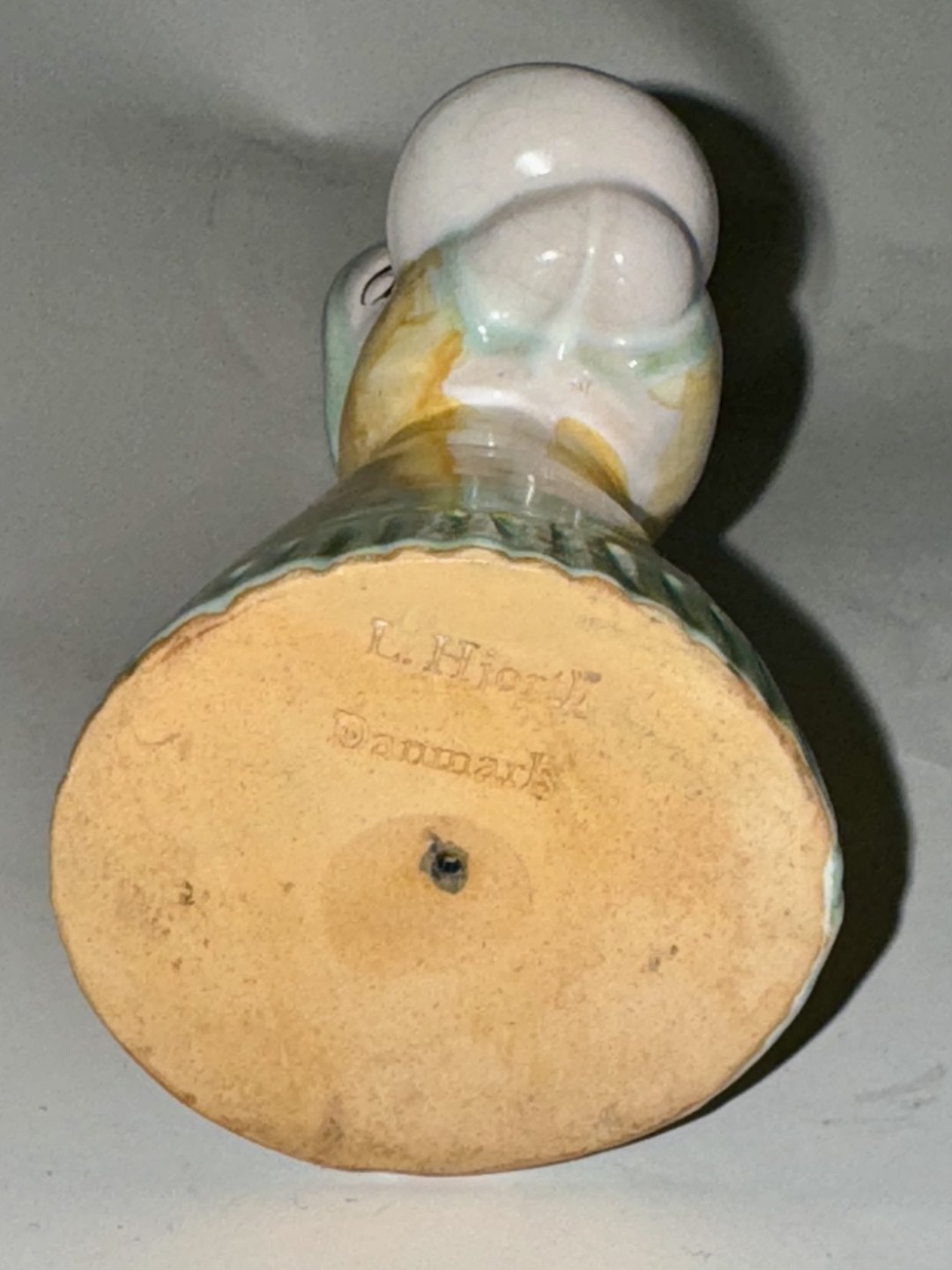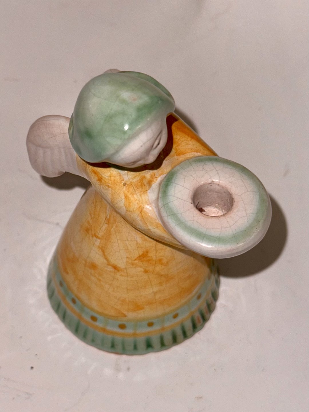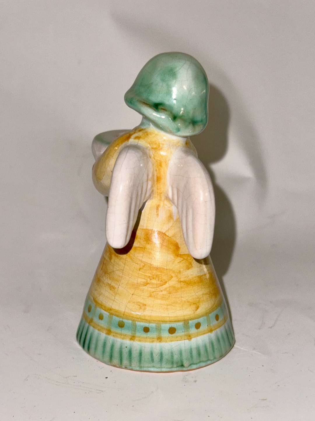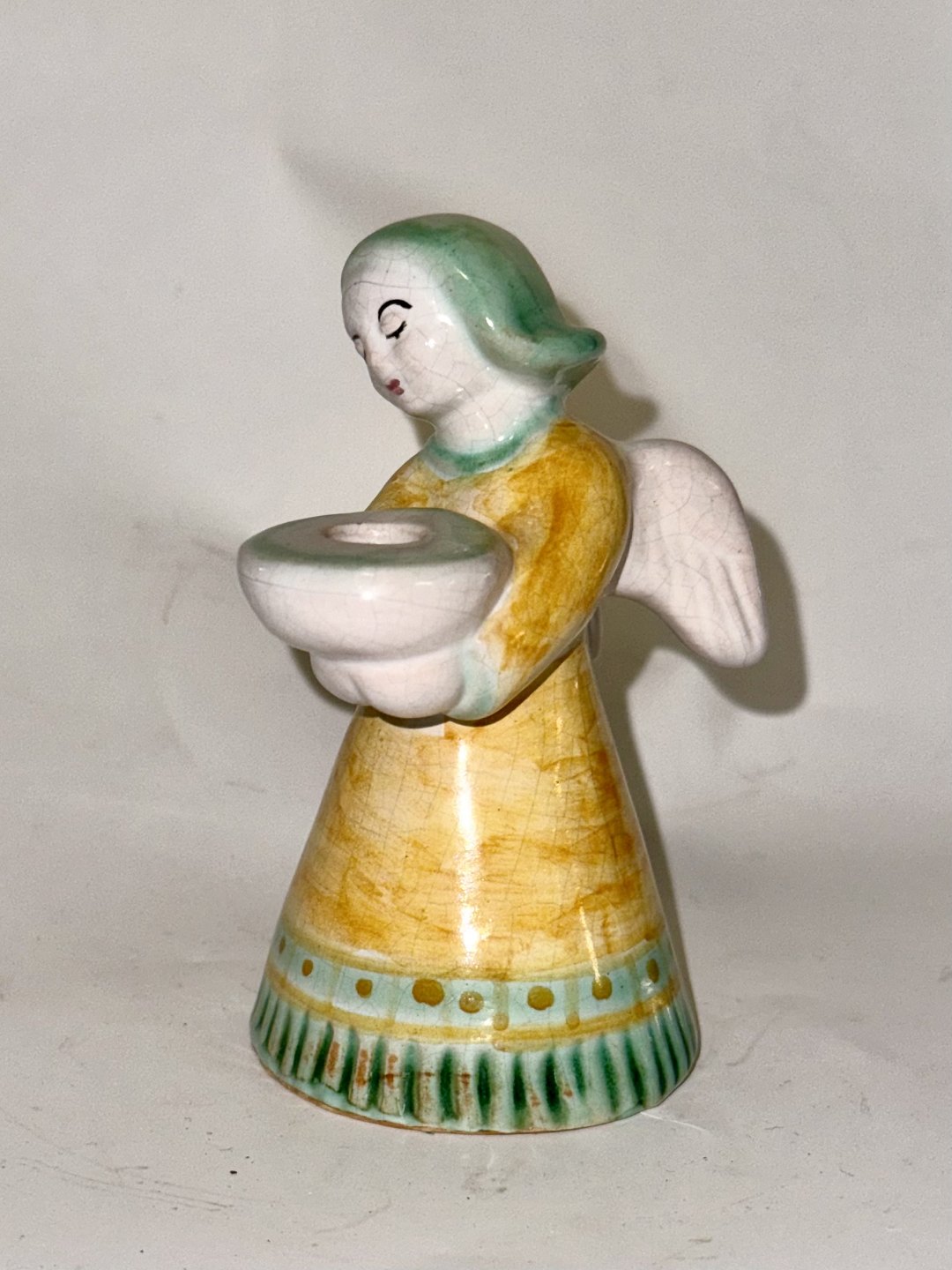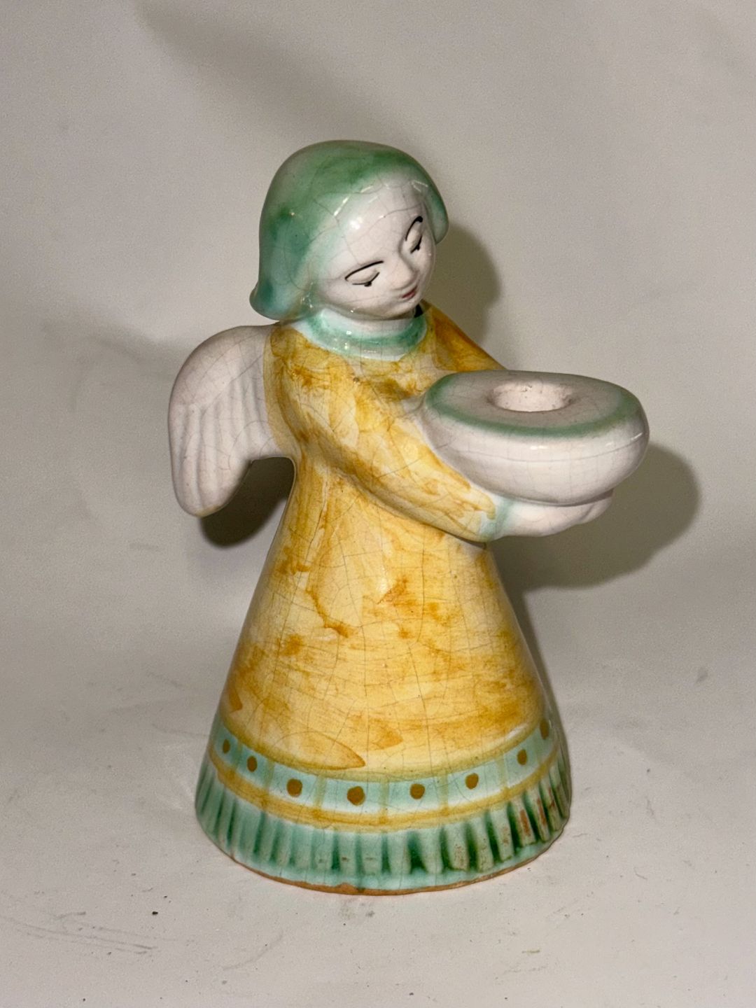 ANGEL IN A YELLOW DRESS: Figure of a painted angel in ceramic as a candle holder from the Bornholm pottery factory Lauritz Hjorth. The angel is wearing a yellow dress. In good condition. Factory mark on the bottom. H. 10 cm Dealer