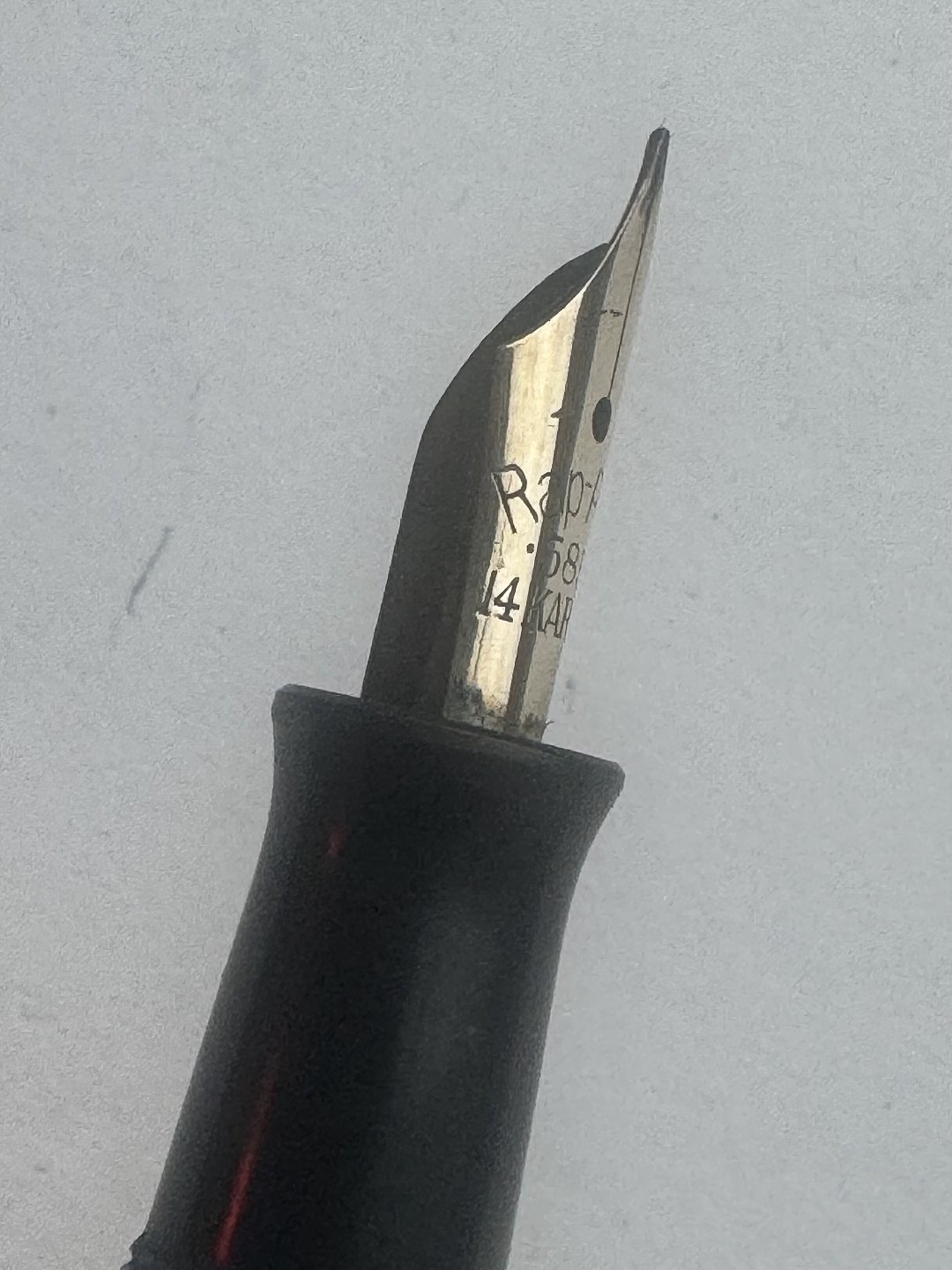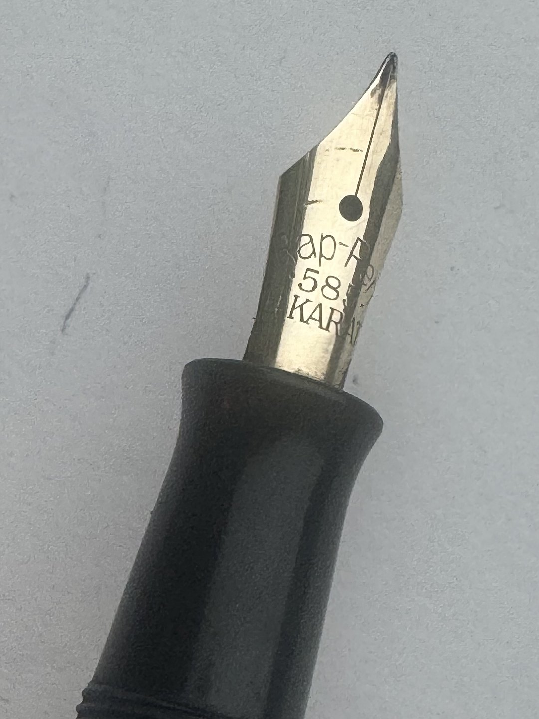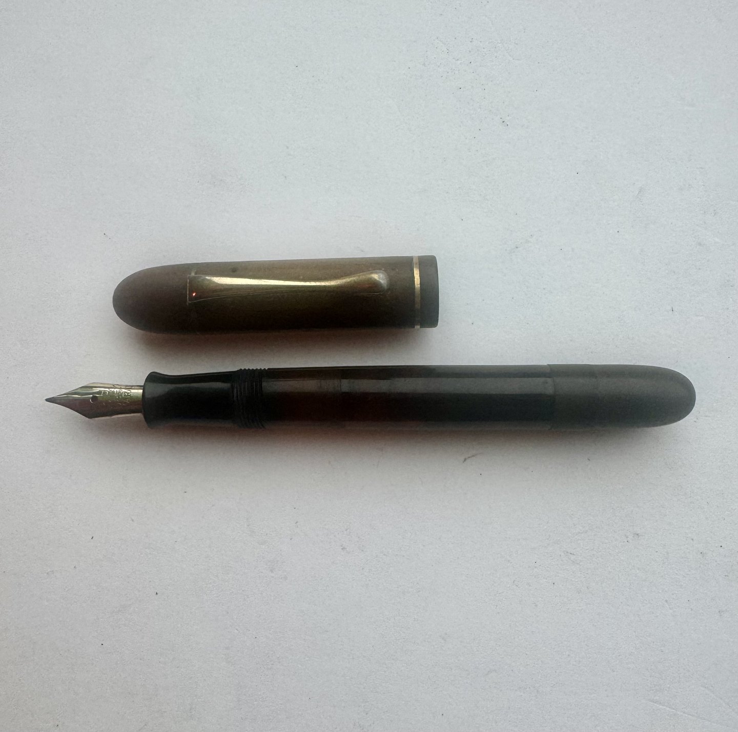Black Rappen fountain pen from the early 1930s. Piston ink refill with transparent ink window. The piston moves back and forth when the bottom screw is activated, but it cannot absorb ink, which is why it must be restored before it can function as a fountain pen again. The cap is discolored, which is why it is not quite the same color as the rest of the pen. Made by Pelikan in Germany, which the pen's design actually reveals. L 11.2 cm Dealer