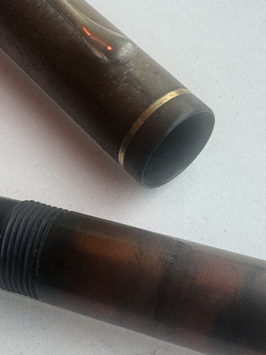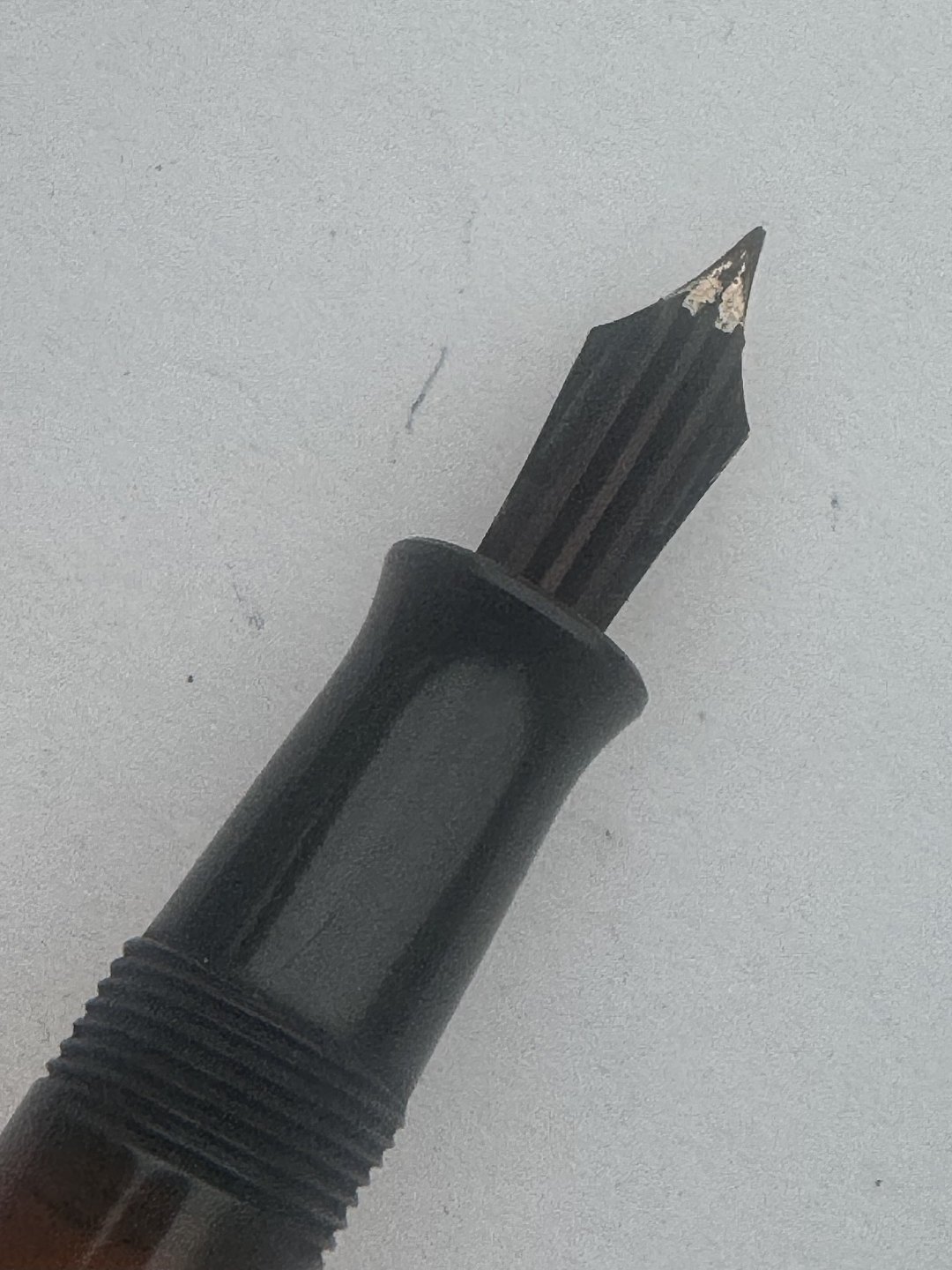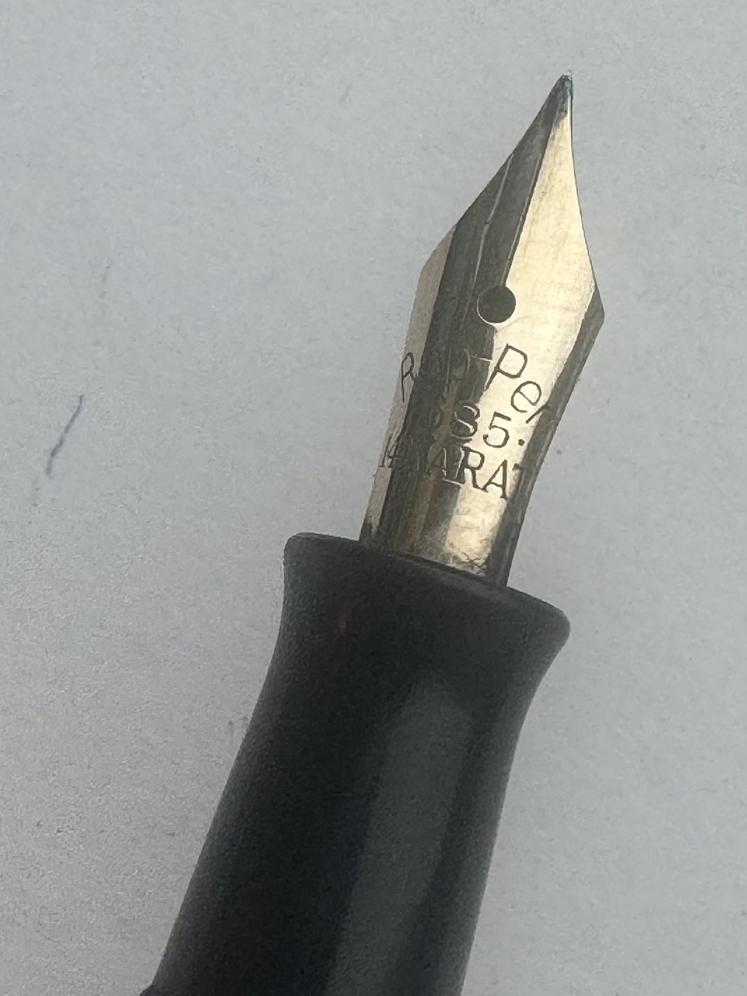 Black Rappen fountain pen from the early 1930s. Piston ink refill with transparent ink window. The piston moves back and forth when the bottom screw is activated, but it cannot absorb ink, which is why it must be restored before it can function as a fountain pen again. The cap is discolored, which is why it is not quite the same color as the rest of the pen. Made by Pelikan in Germany, which the pen's design actually reveals. L 11.2 cm Dealer