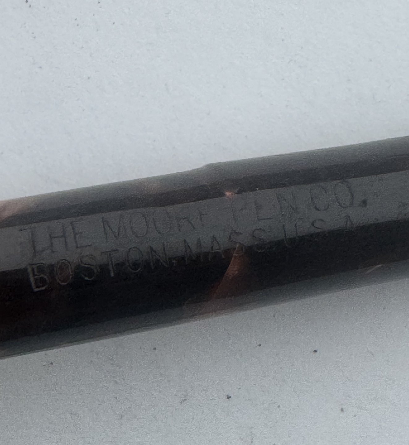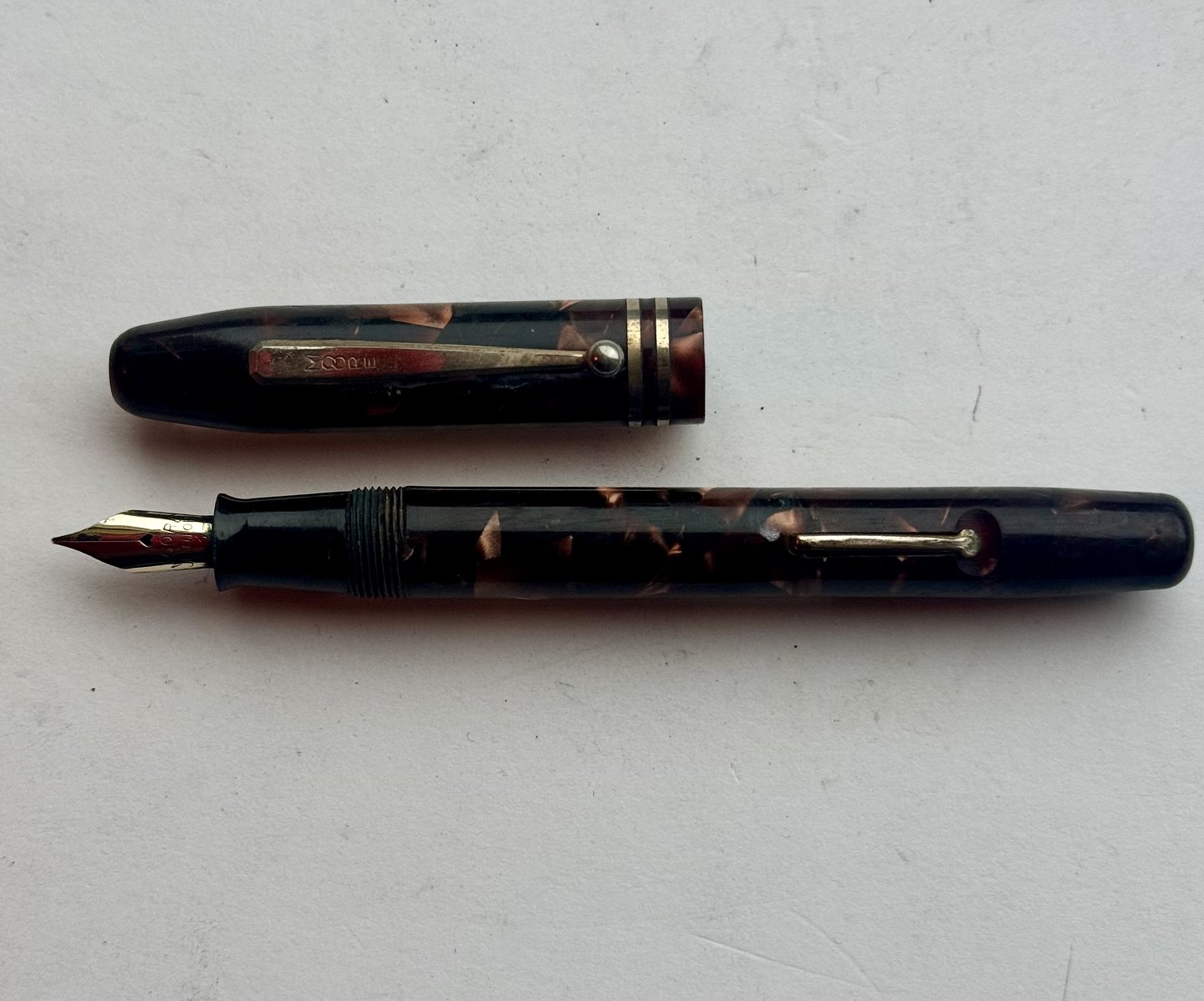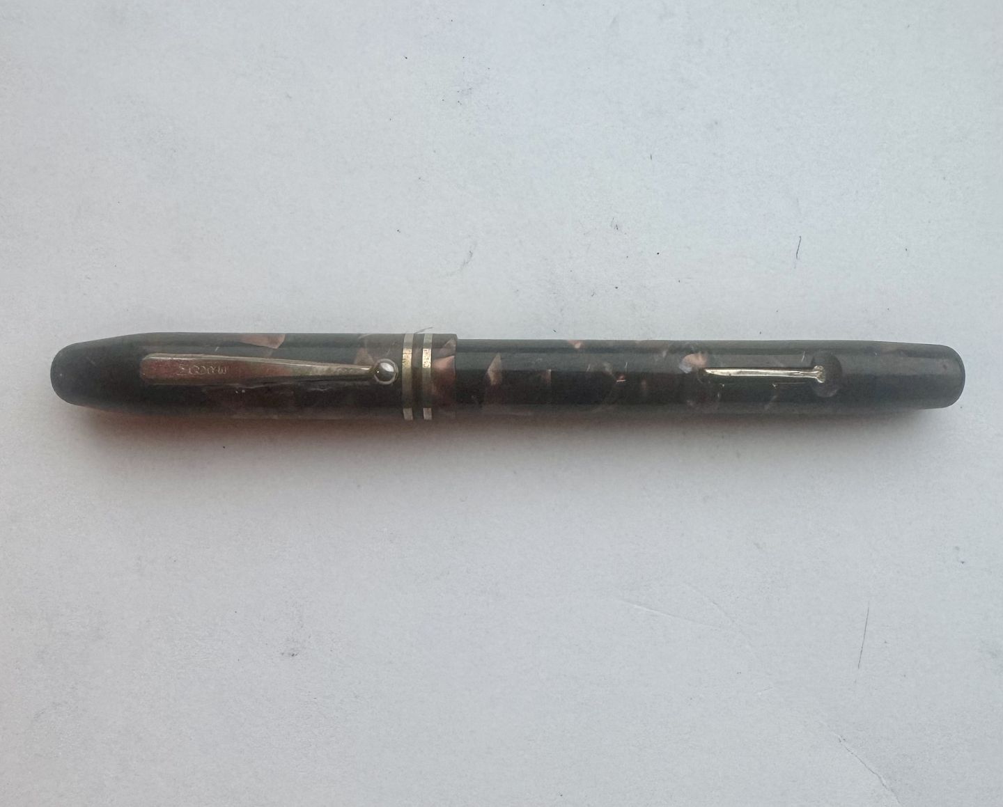 Green marbled fountain pen with lever filler from The Moore Pen Company. Made in the U.S.A. around 1940. Does not work. A new rubber sack must be inserted before it can absorb ink and write again. The fountain pen otherwise appears in good condition without damage or repairs. All parts are original and from the original period.