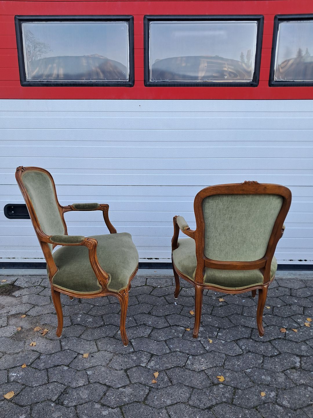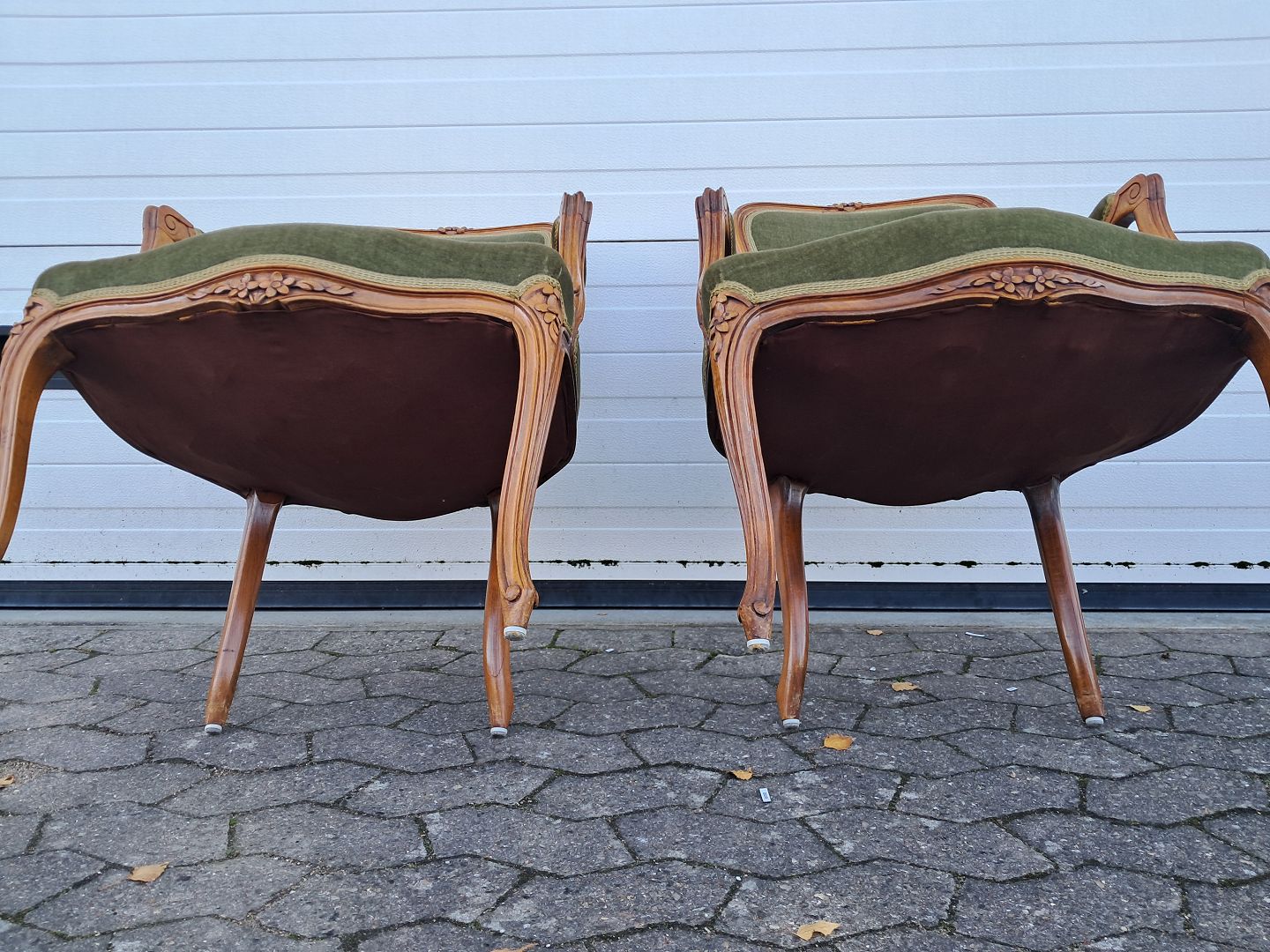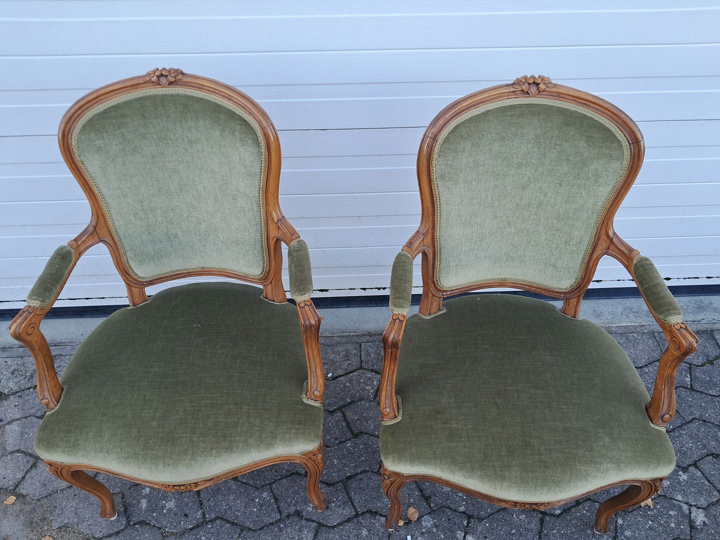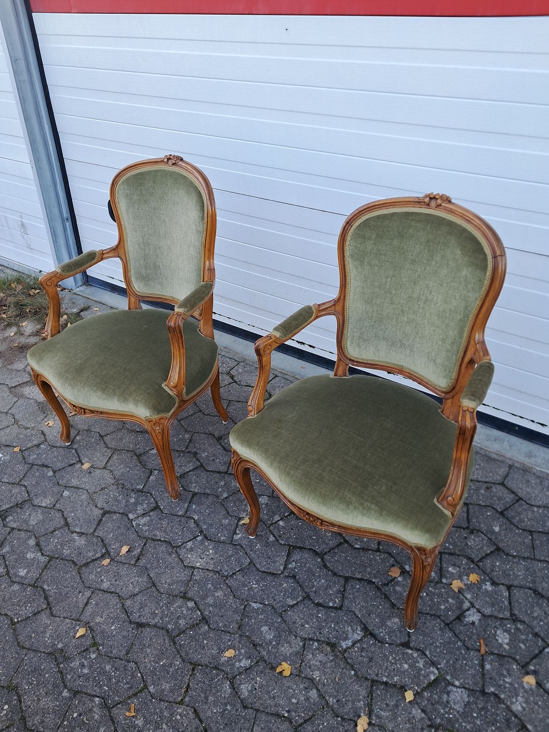 2 Rokokostole i massivt bøgetræ med velourbetræk, fra 1980erne.De har brugsspor.