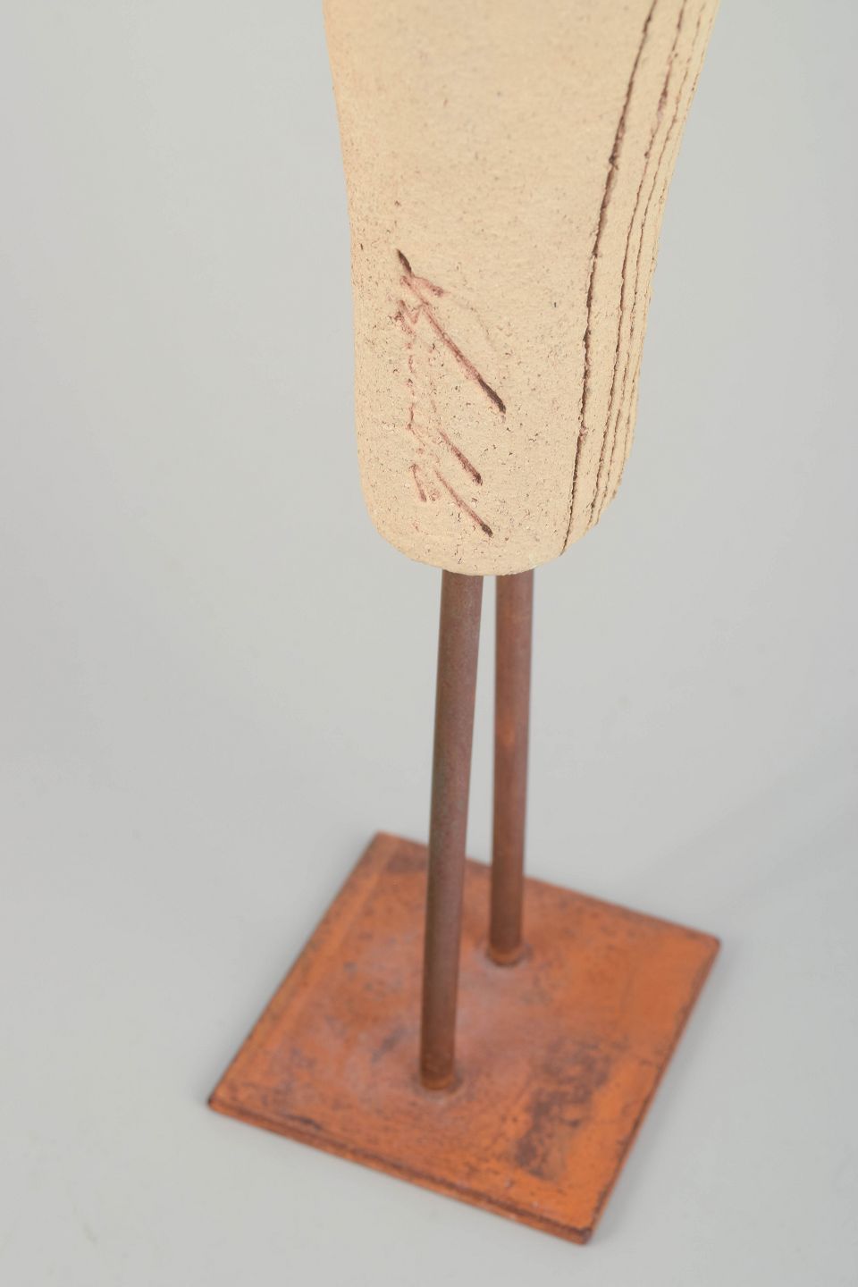 Elegant bird-shaped sculpture in hand-modelled stoneware with a light, slightly rough surface and incised linear decoration, mounted on metal legs with an iron base. The metallic-glazed beak provides a striking contrast to the matte body. Signed by the artist.