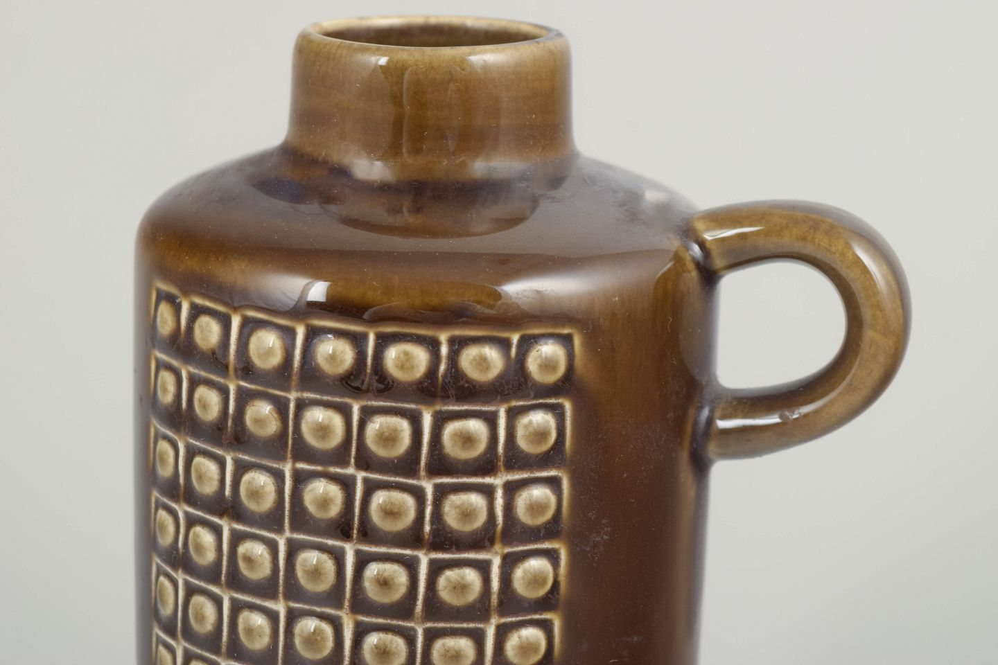 Elegant ceramic pitcher in brown glaze with a geometric relief pattern in a cubic design. The Kub series reflects Nylund’s modernist approach, emphasising function, structure and timeless aesthetics.