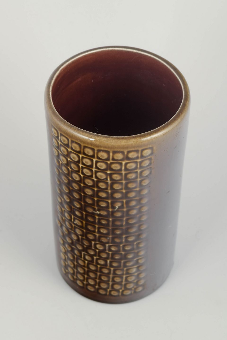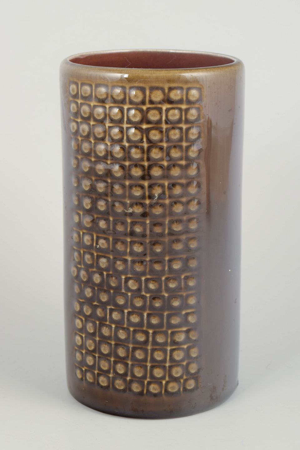 Cylindrical stoneware vase with characteristic grid relief and brown glaze with golden hues. A classic example of Nylund’s modernist design language from the 1960s.
