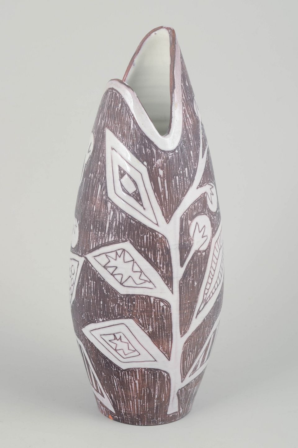 Handmade ceramic vase with a distinctive asymmetrical form and incised graphic decoration beneath a brown and white glaze. A characteristic example of Swedish studio pottery from the 1960s, marked by strong artistic individuality.