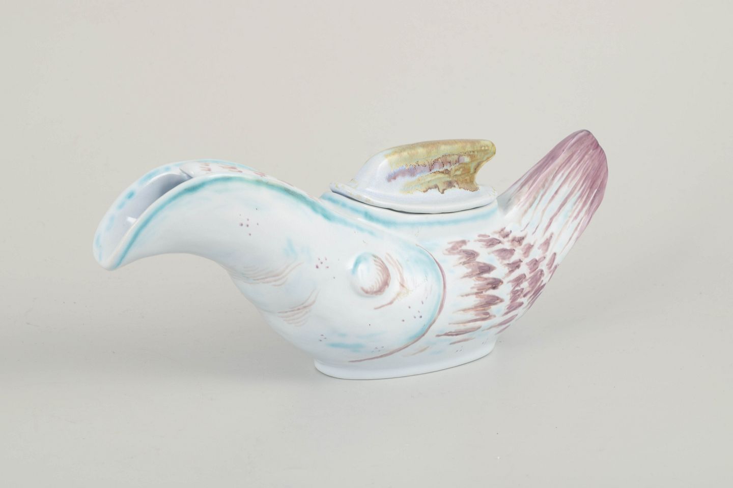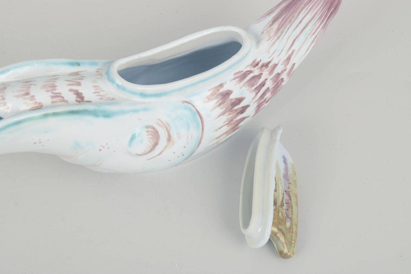 Figurative sauce bowl shaped as a bird, executed in faience with hand-painted decoration in light blue, pink and golden tones. A charming example of Aluminia’s playful mid-century design language.