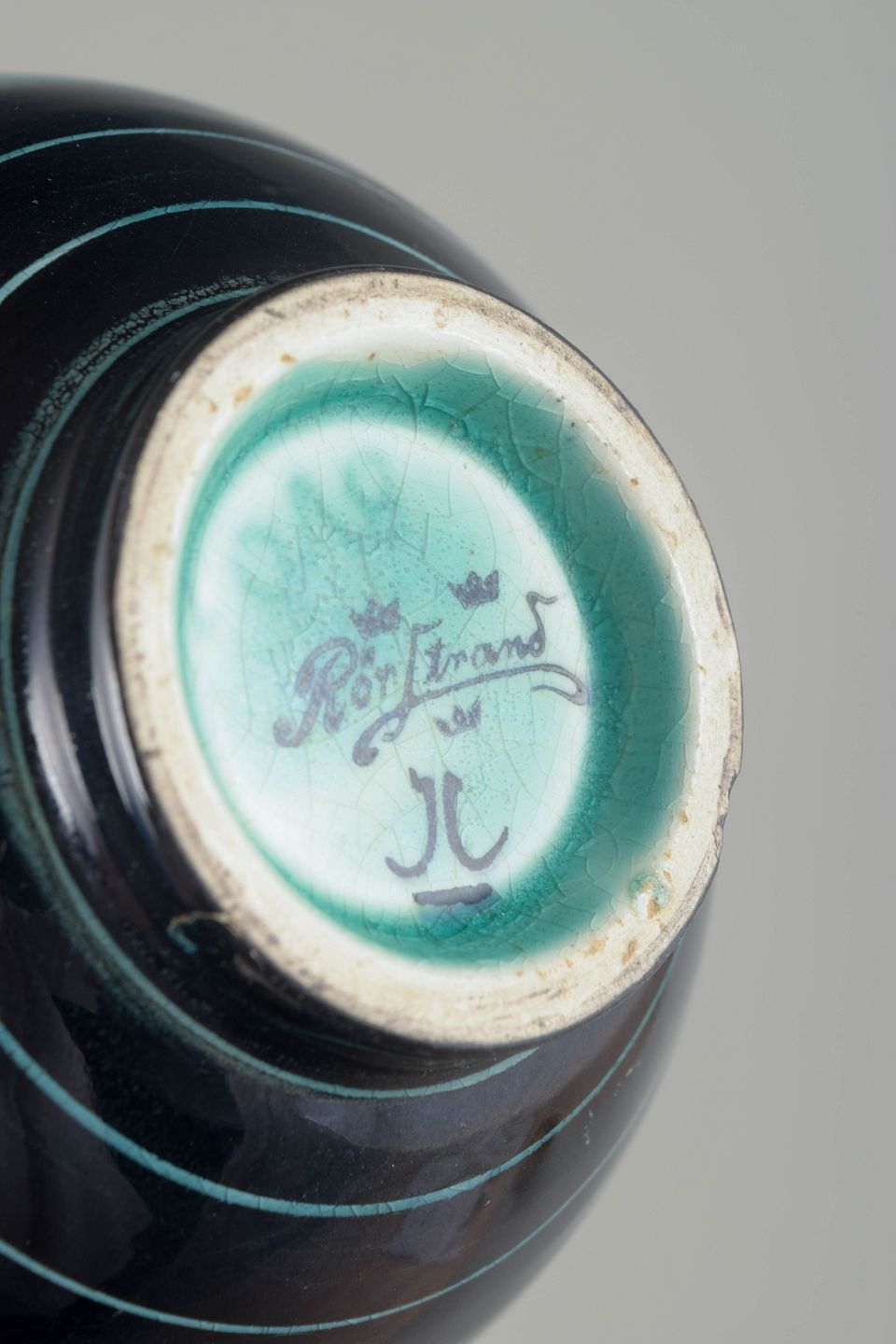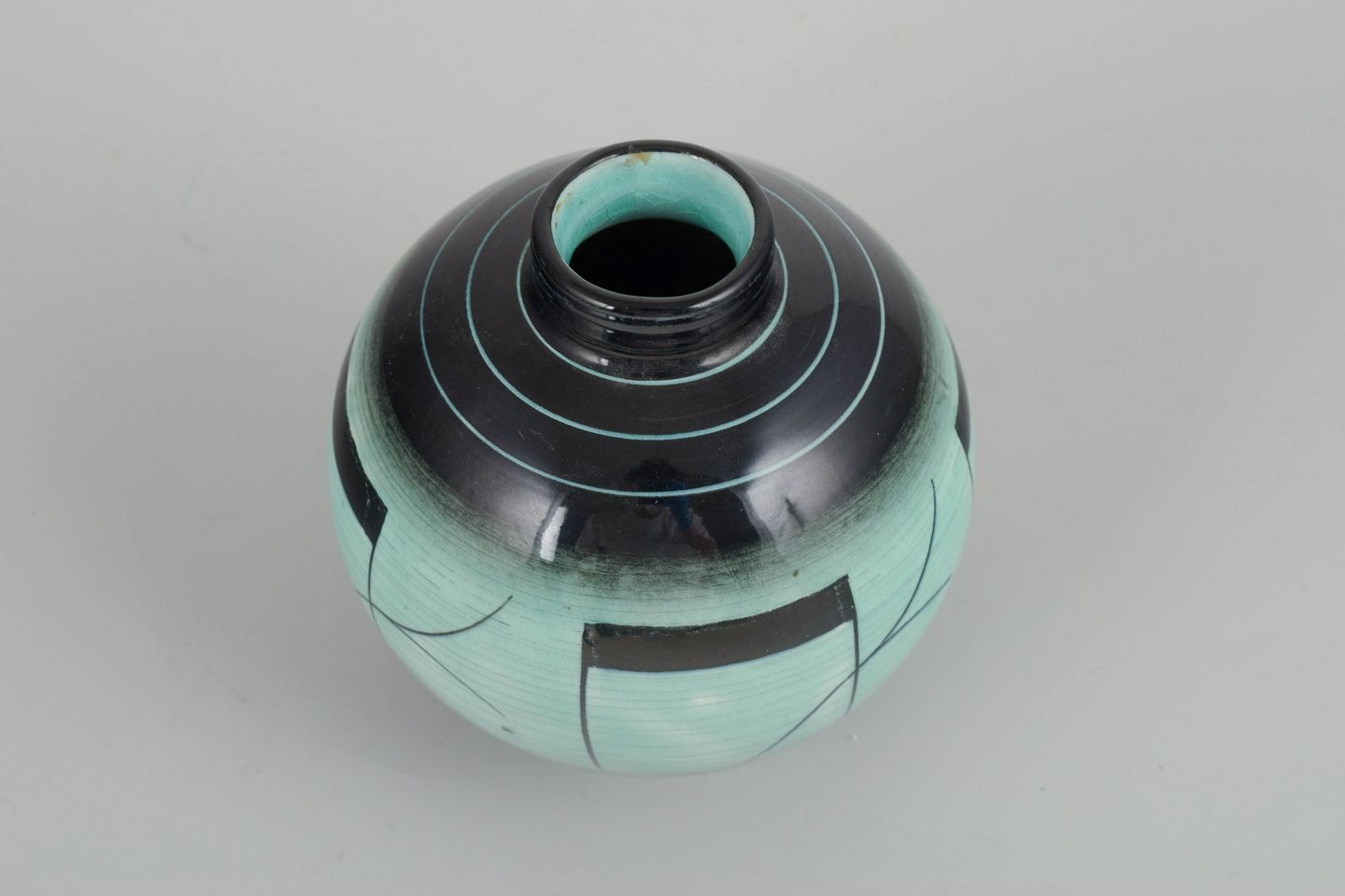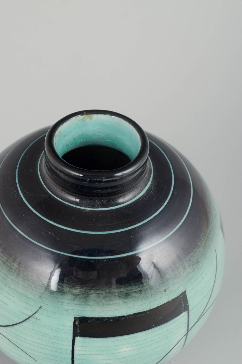Art Deco vase in glazed ceramic with a rounded form and turquoise and black geometric decoration. An elegant example of Rörstrand’s 1930s functionalist design language.