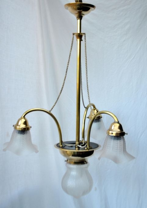 Danish Art Nouveau lamp in brass with four domes, approx. 1910. Center dome onion-shaped in frosted glass. 3 ruffled frosted lamp glasses in each light arm. With three hanging chains. H.: 80 cm. Dia.: 50 cm. All domes from Funen Glassworks. Fantastic condition. Provenance: Samsø.Item number: 28526