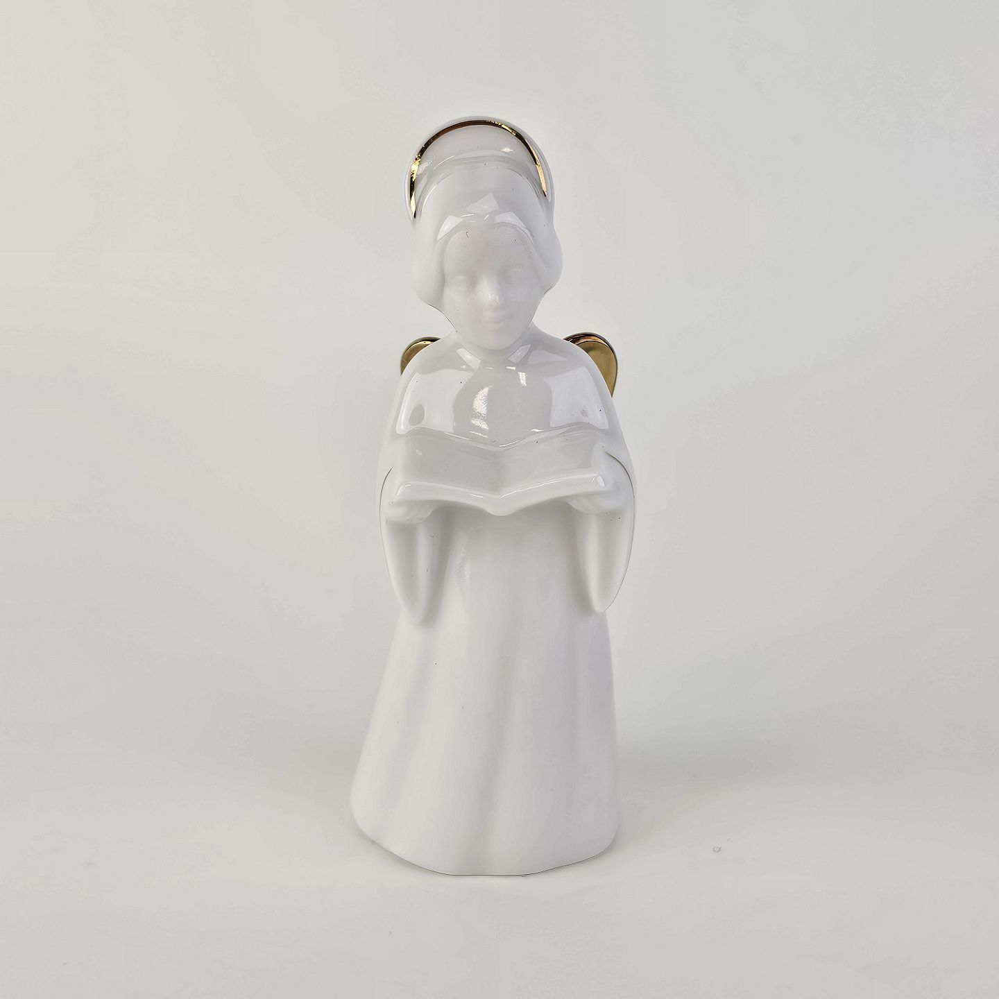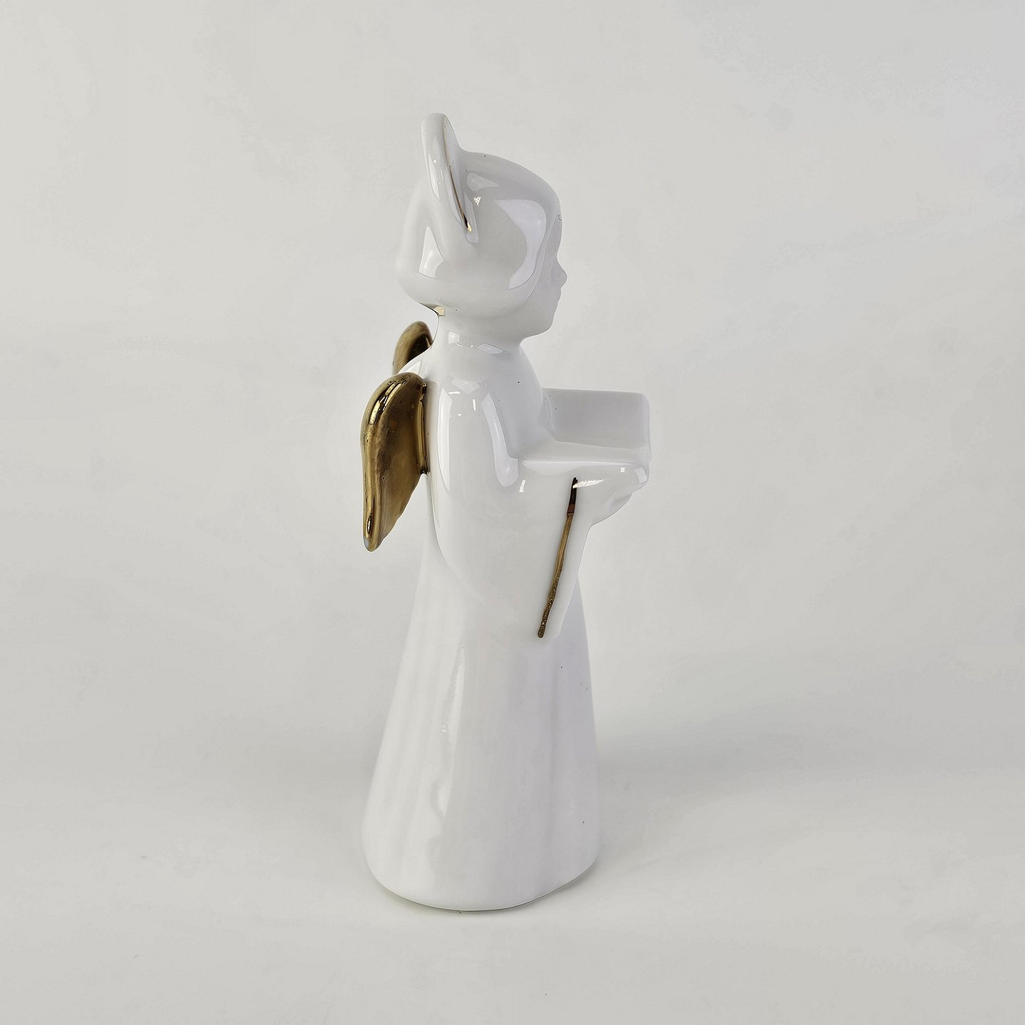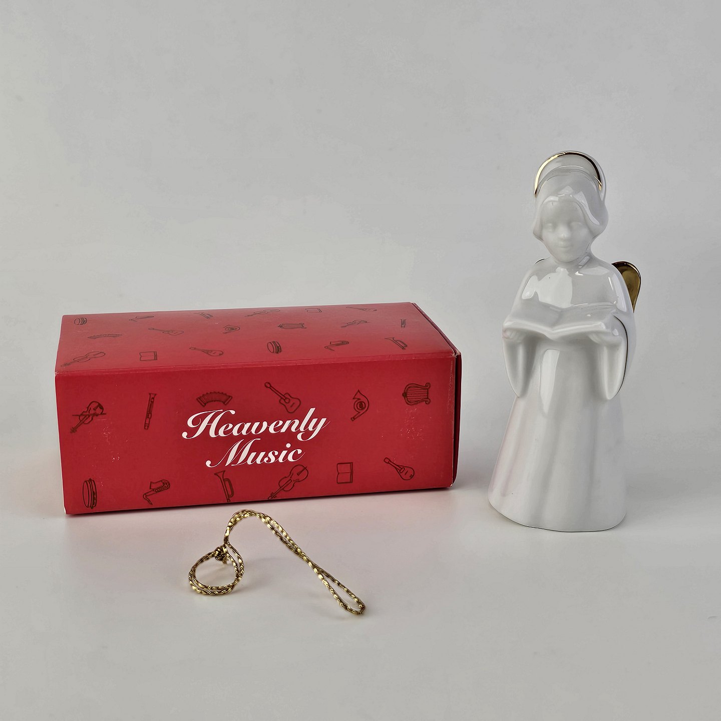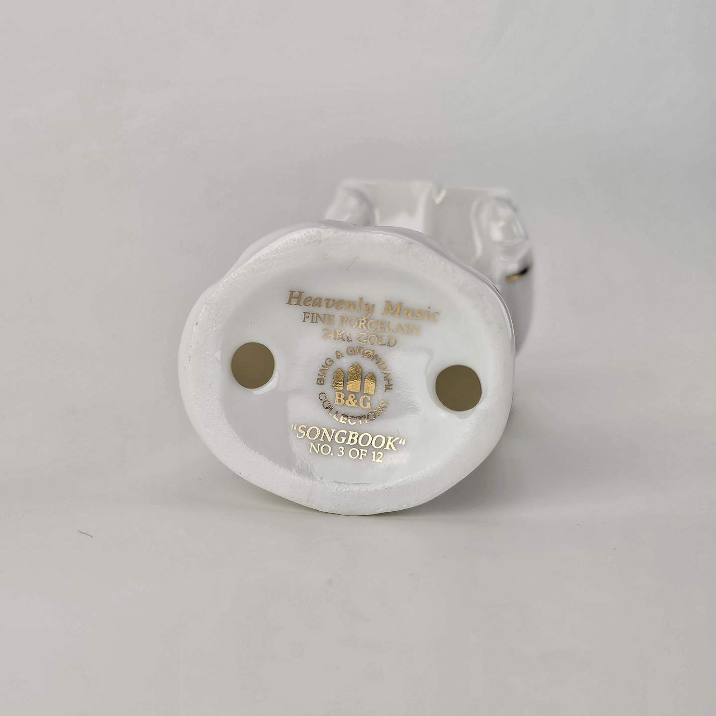 Figur med motiv af en engel med en sandbog. Figuren er i hvidt porcelæn med forgyldte vinger og detaljer i 24 karat guld. 3 af 12 i serien Heavenly Music med titlen Songbook