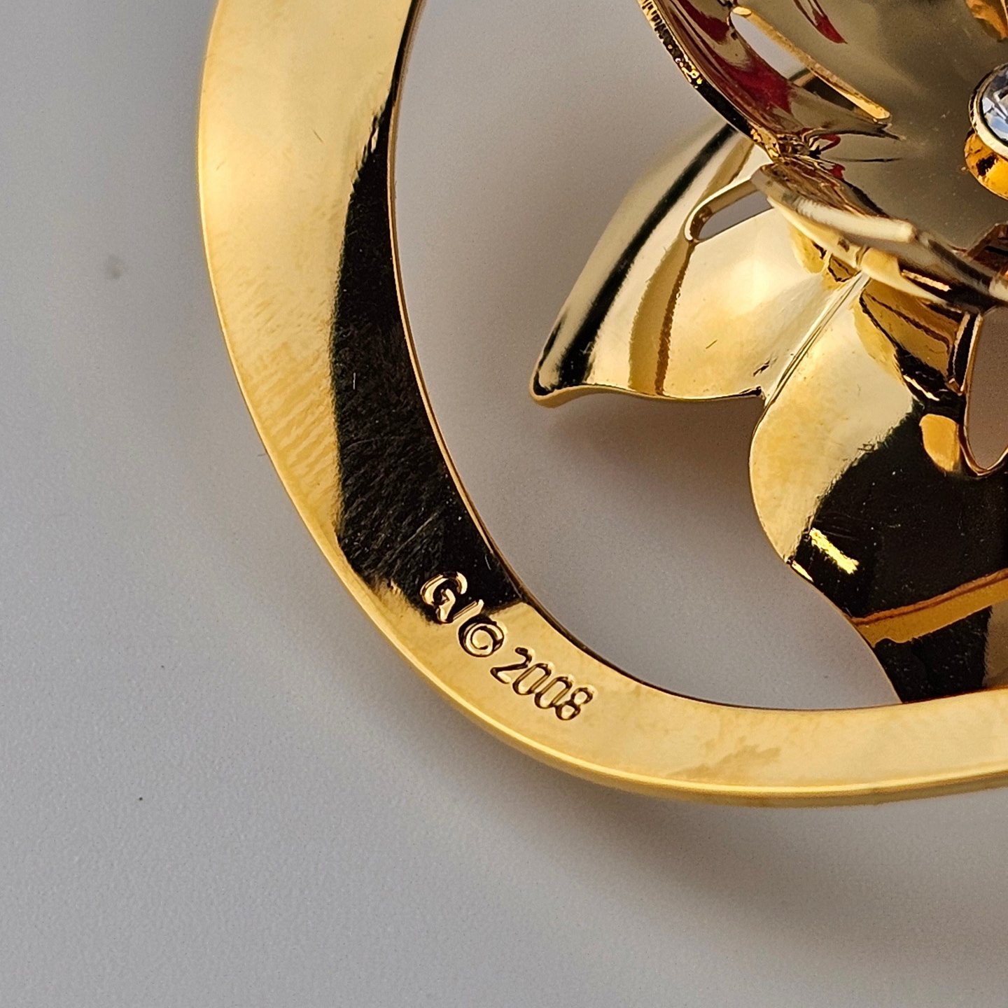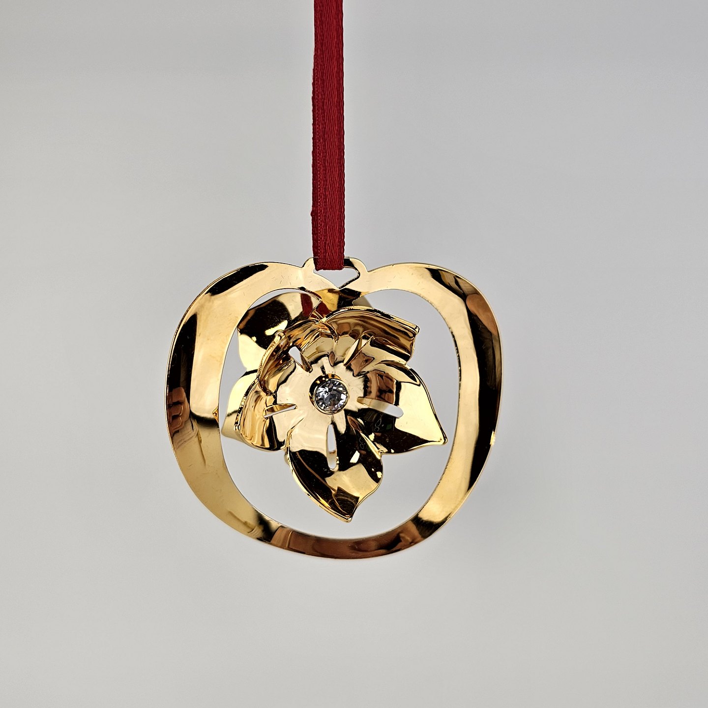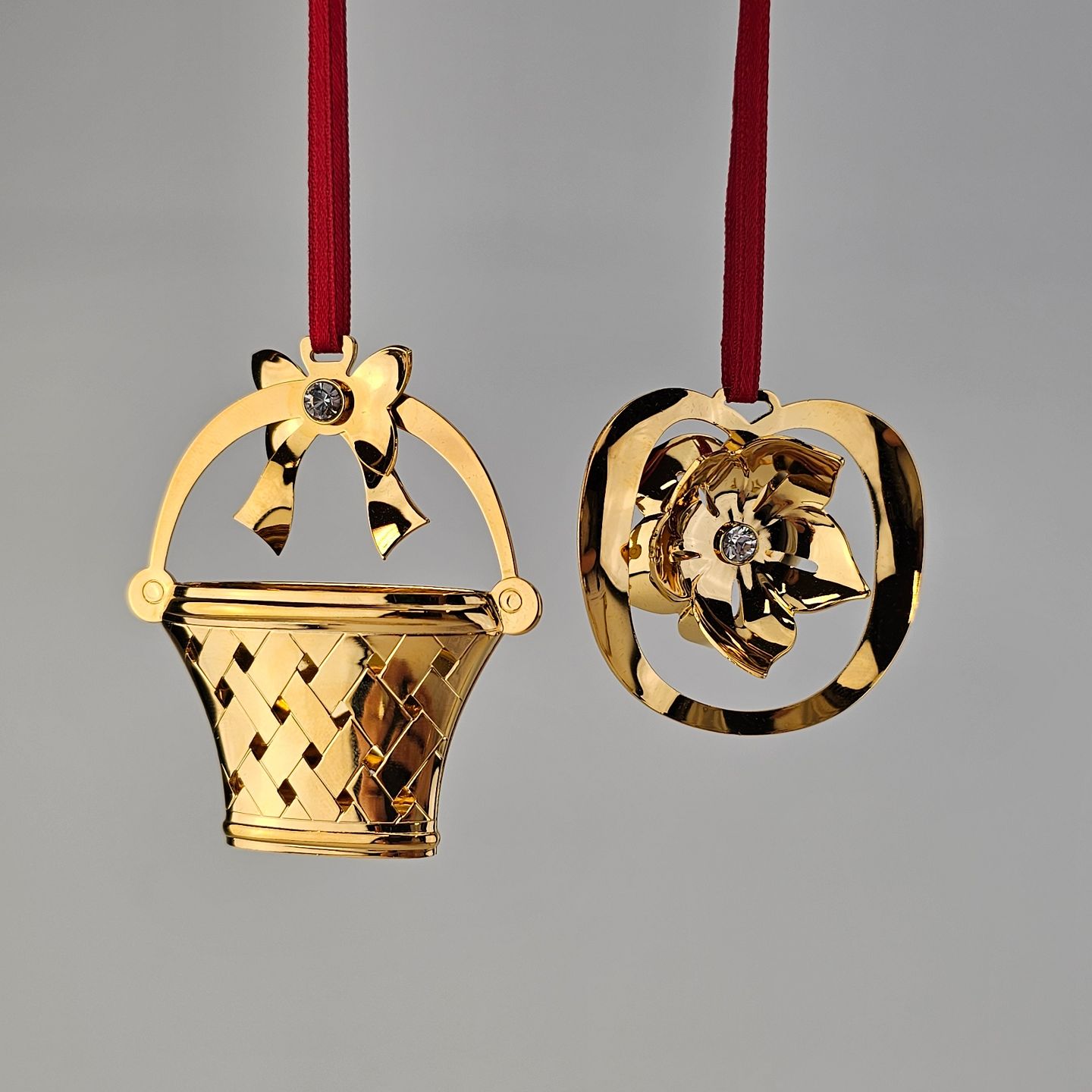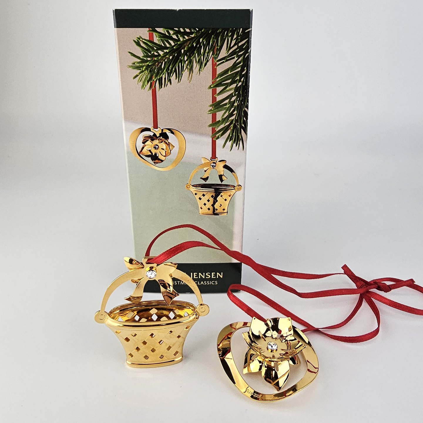 To juleornamenter til ophæng med form af en kurv og en julerose i messing forgyldt med 24 karat guldÅrets julepynt 2008, kommer i original kasse