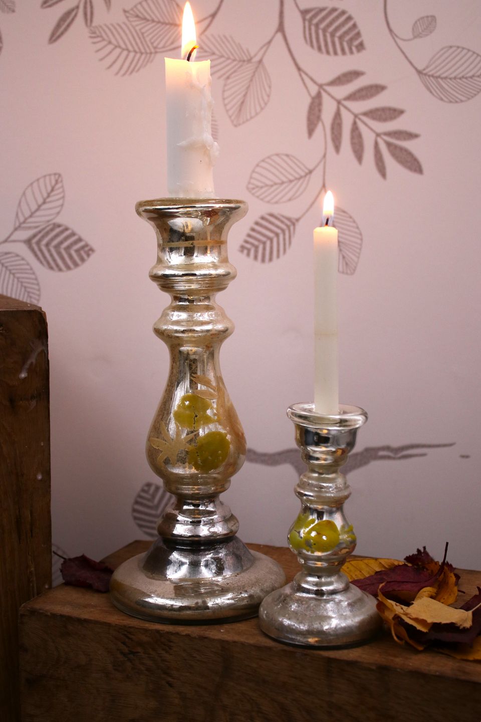 Antique French miniature 19th century candlestick in Mercury silver glass with remnants of painted floral motif and with a fine patina.(for a small Christmas candle) Height: 11cm.