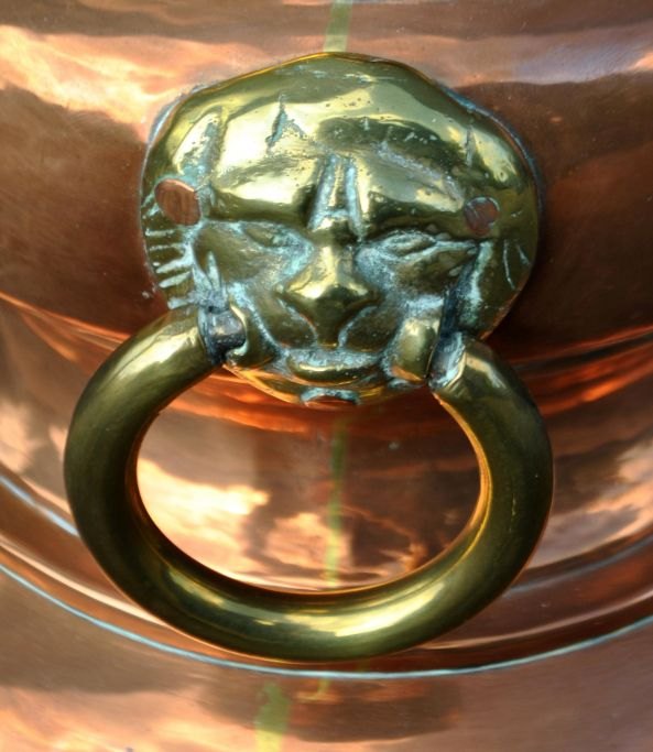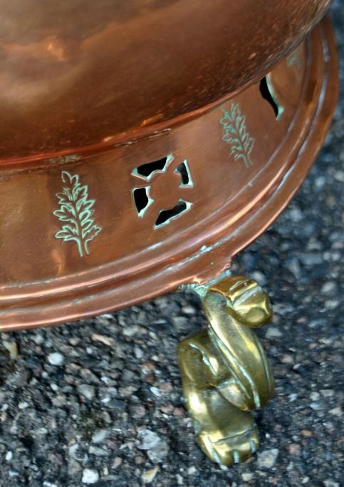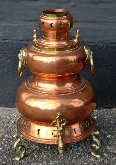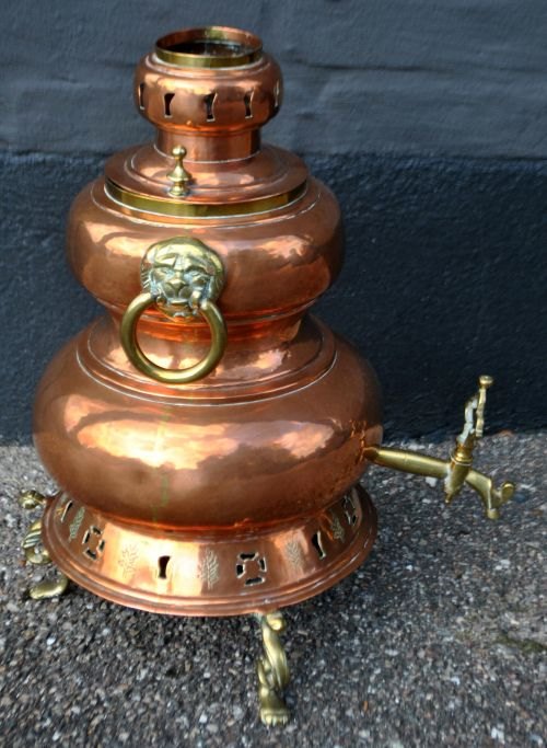 Tea maker in copper, baroque, 18th century. Denmark. Legs, handle and tap in brass. Decorated with lion's head and lion's feet. Tin-plated inside. H: 41 cm. Dia: 23.5 cm.Item number: 28361