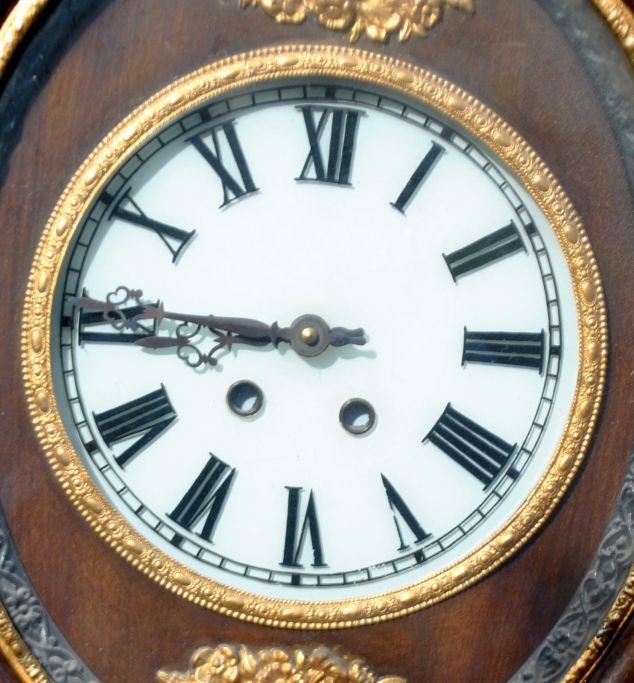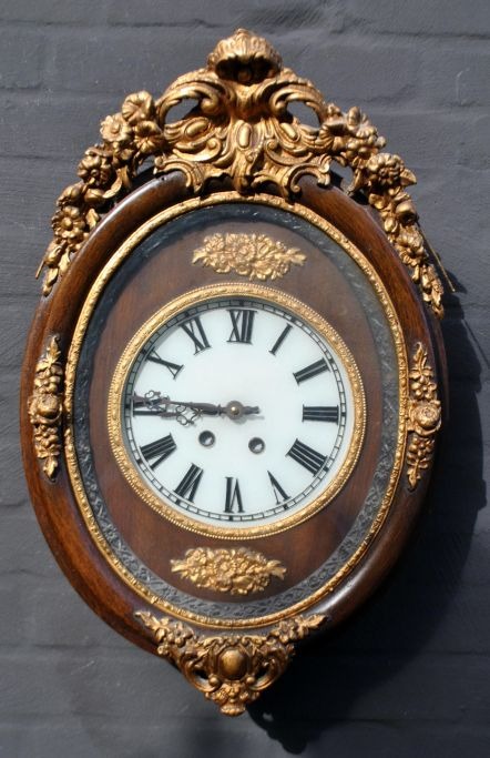 Wall clock, 19th century. Brown painted case with gilded decorations in the form of rocailles and flowers. White glass disc with Roman numerals. H.: 60 cm. W.: 37 cm.NB: Pendulum missing.