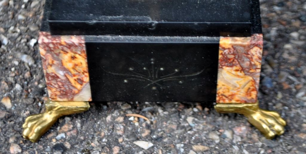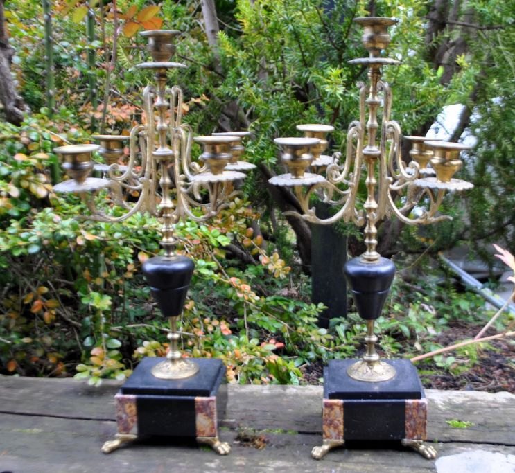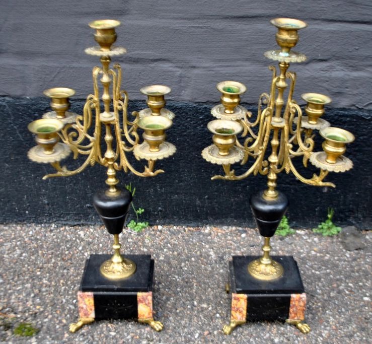 A pair of French 5-armed candelabra, 19th century. Brass and black marble/mottled marble. H.: 41 cm.Item number: 28400