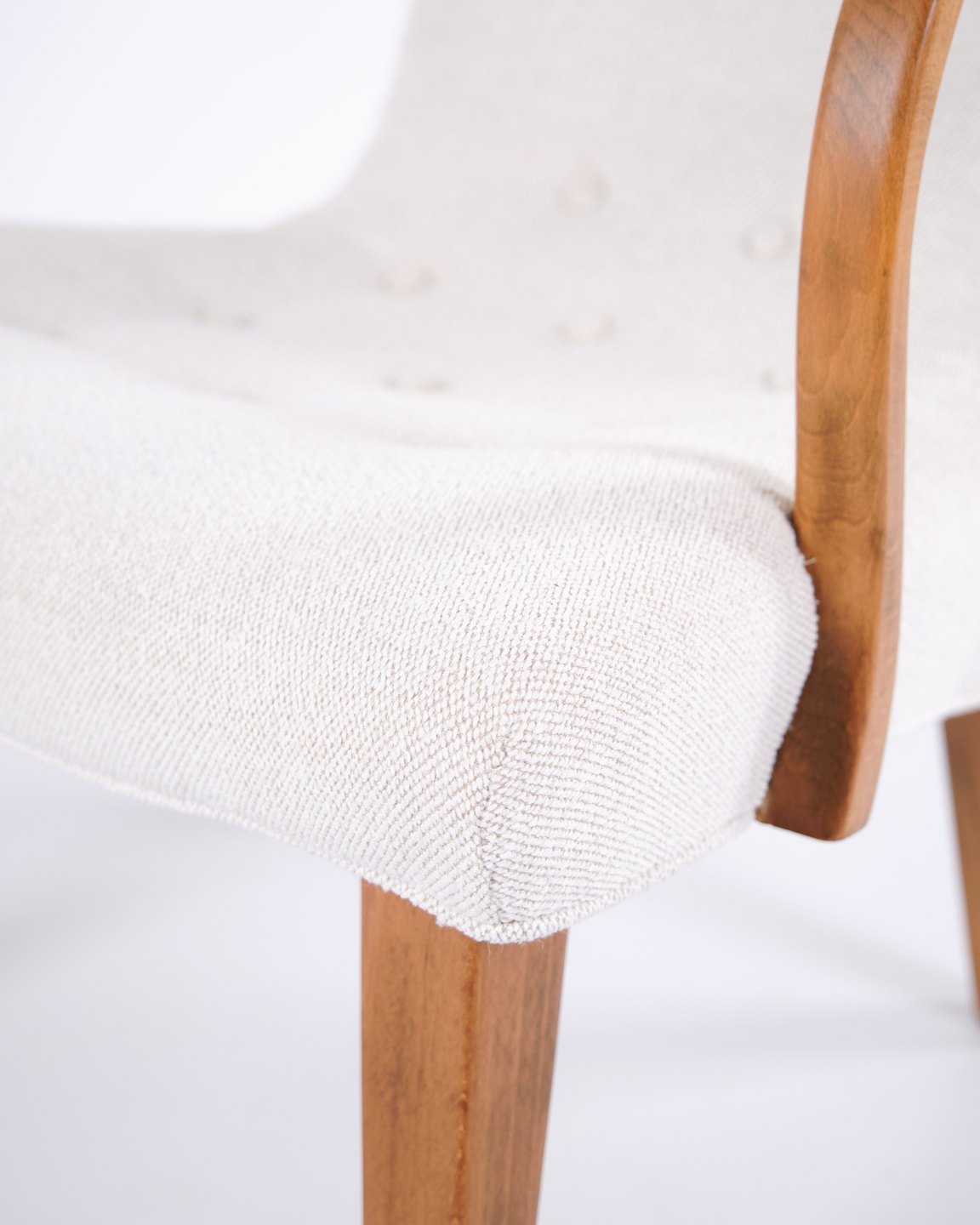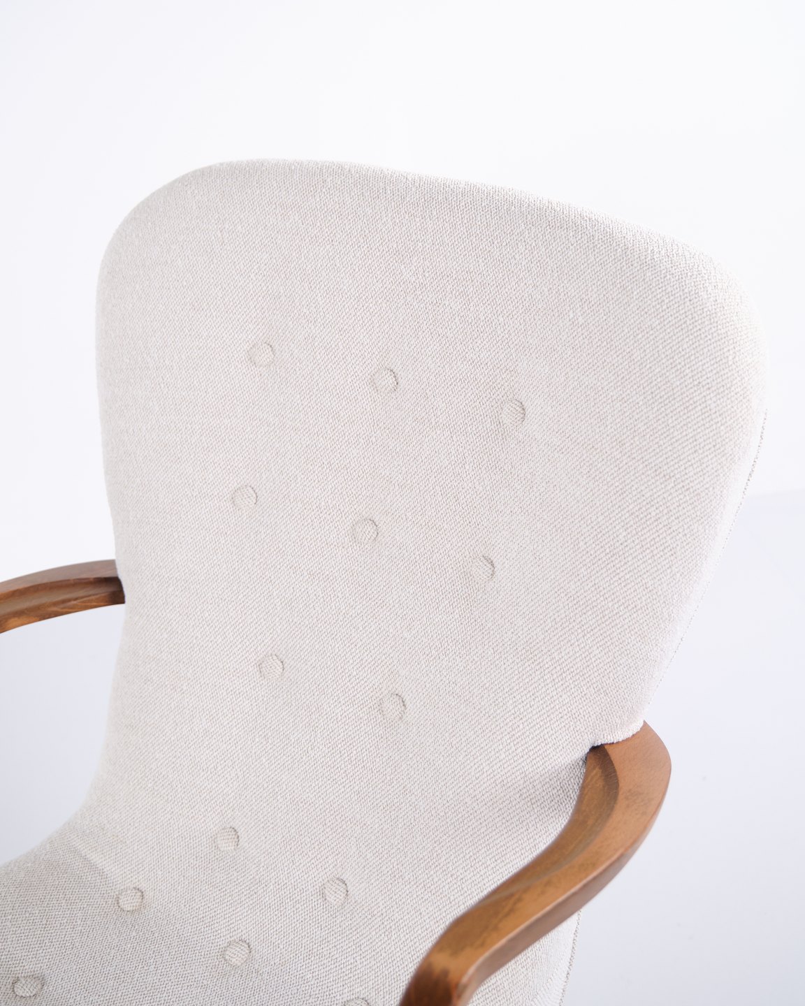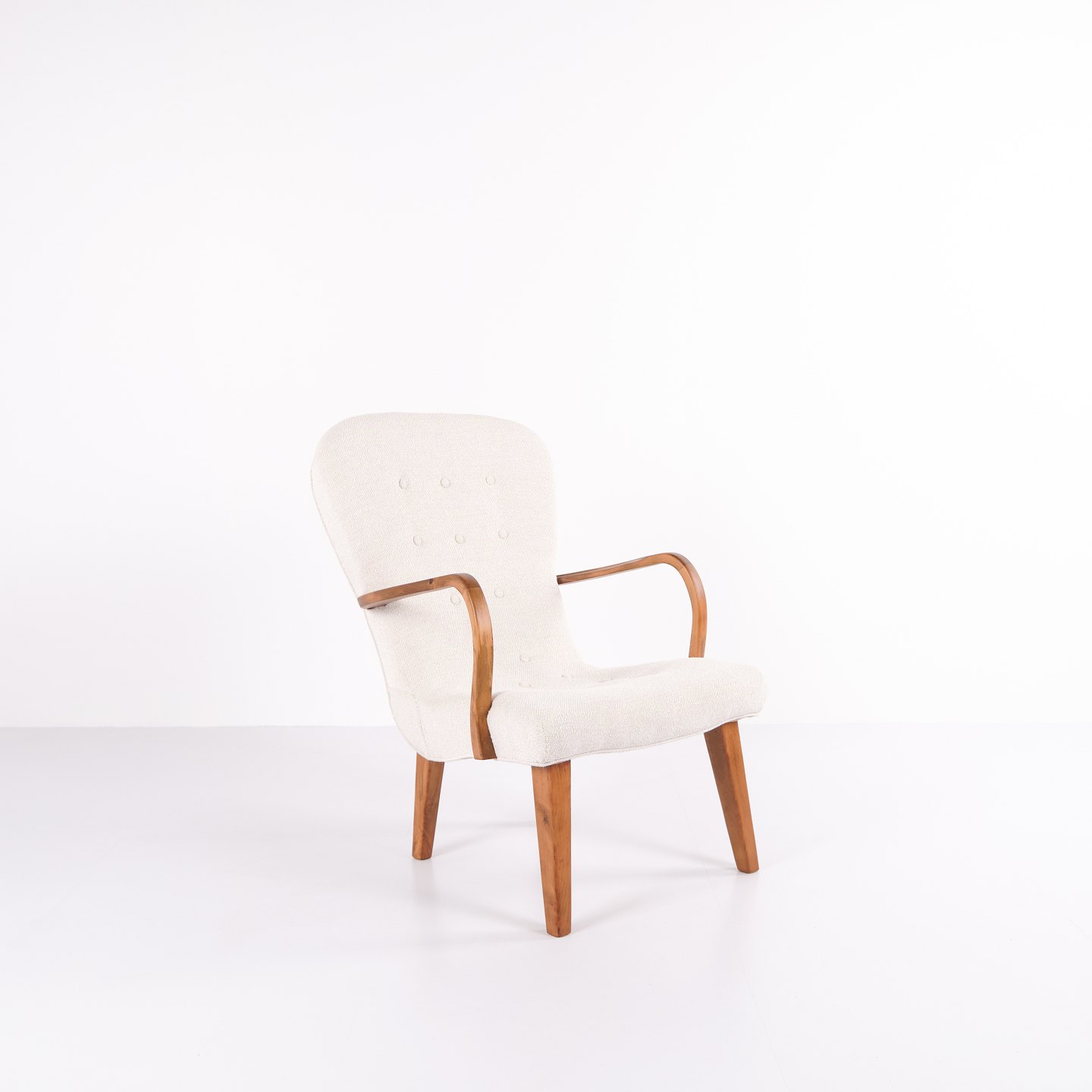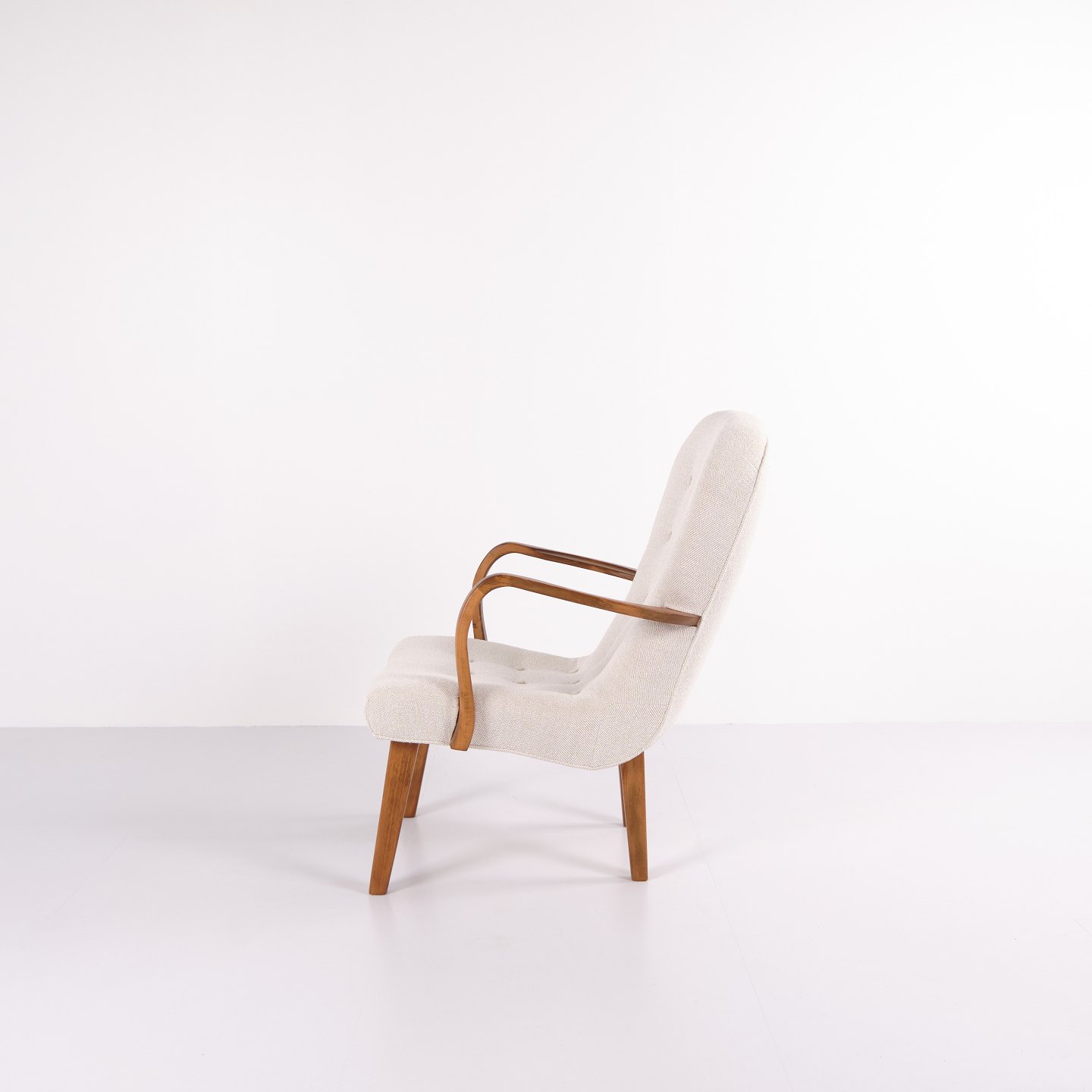 Classic armchair from the 1940s, upholstered in light fabric and made in a period-typical, rounded design. The chair has an elegant, upright back and slightly curved armrests.— Origin: Denmark