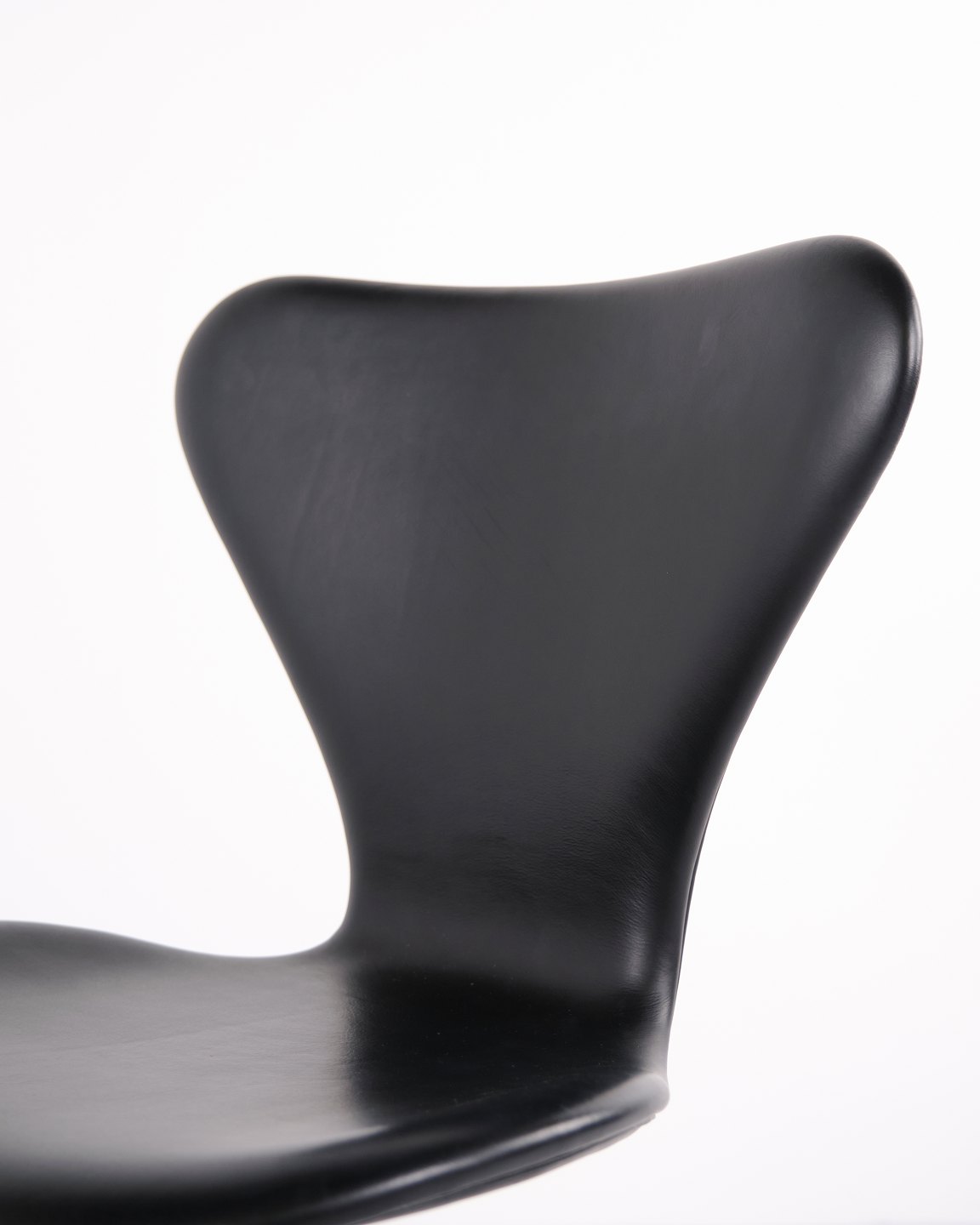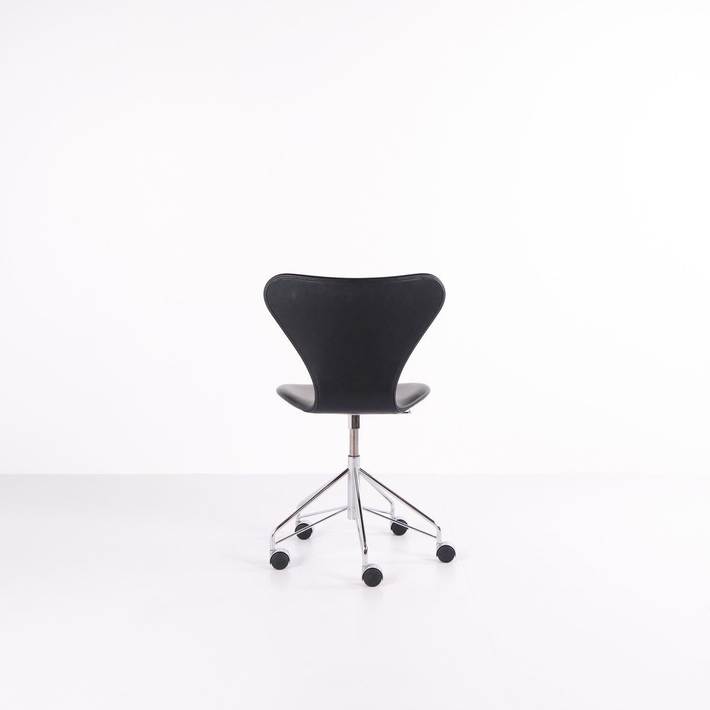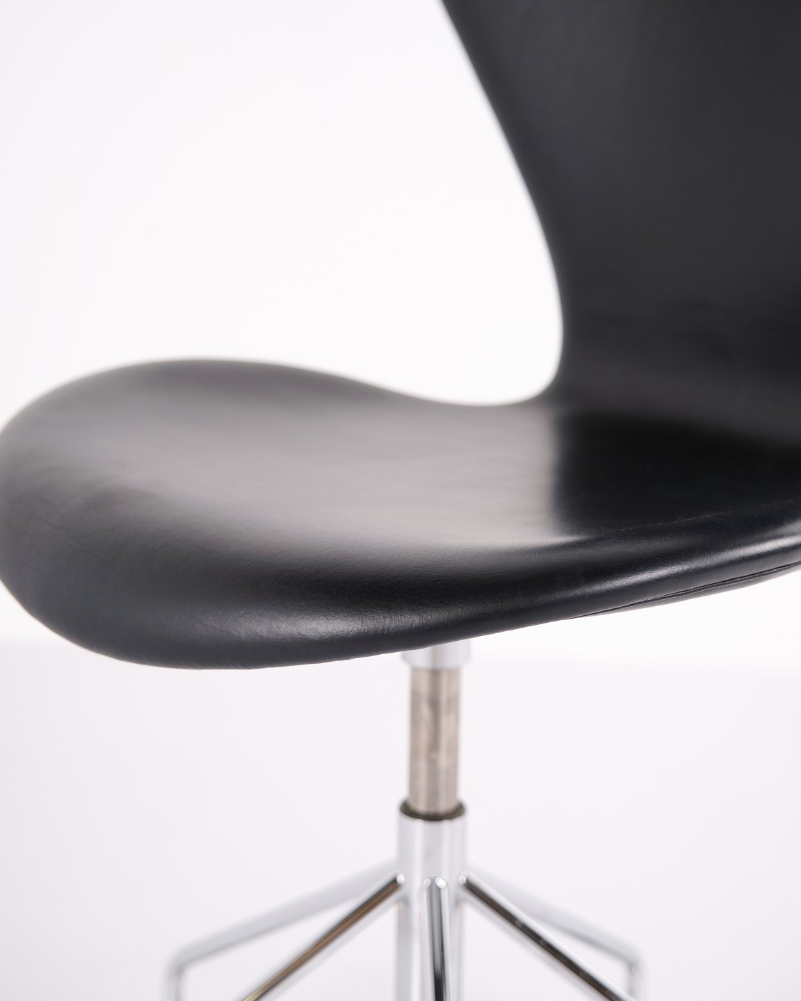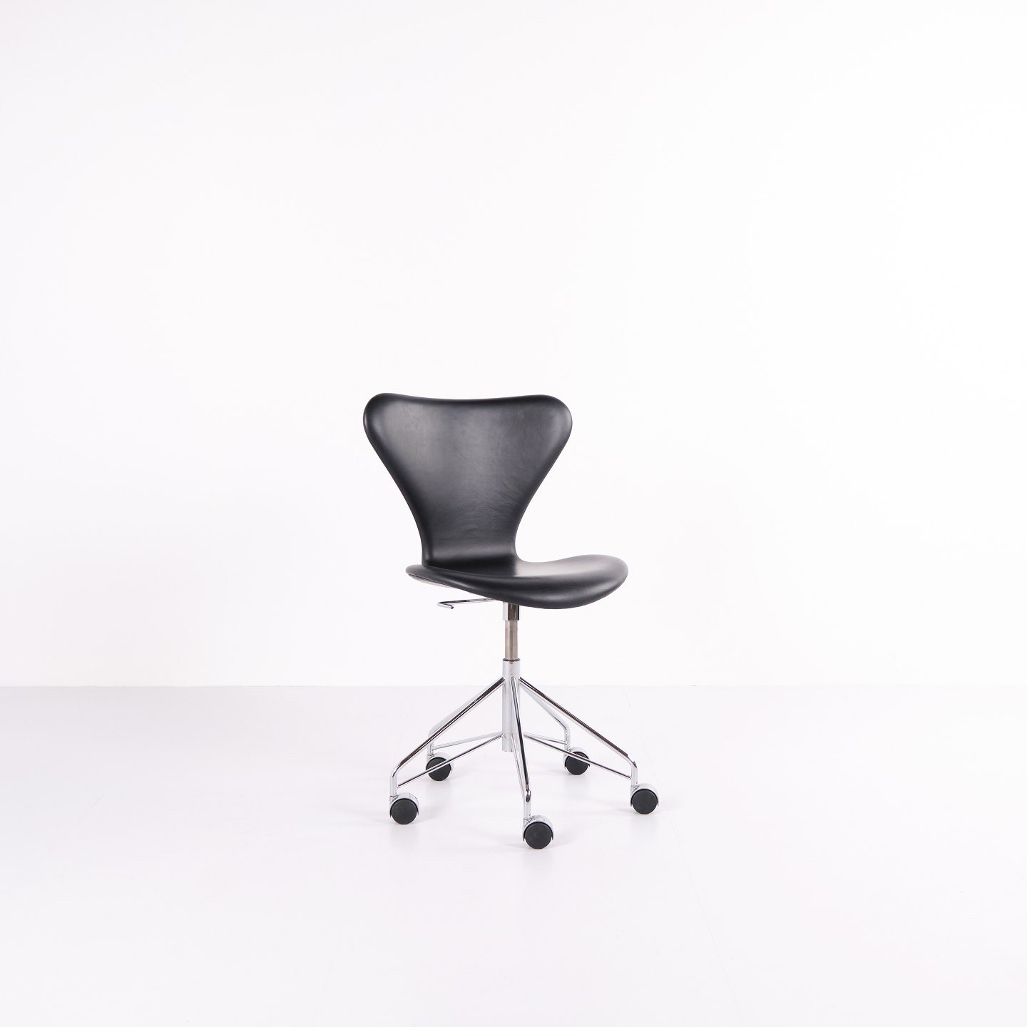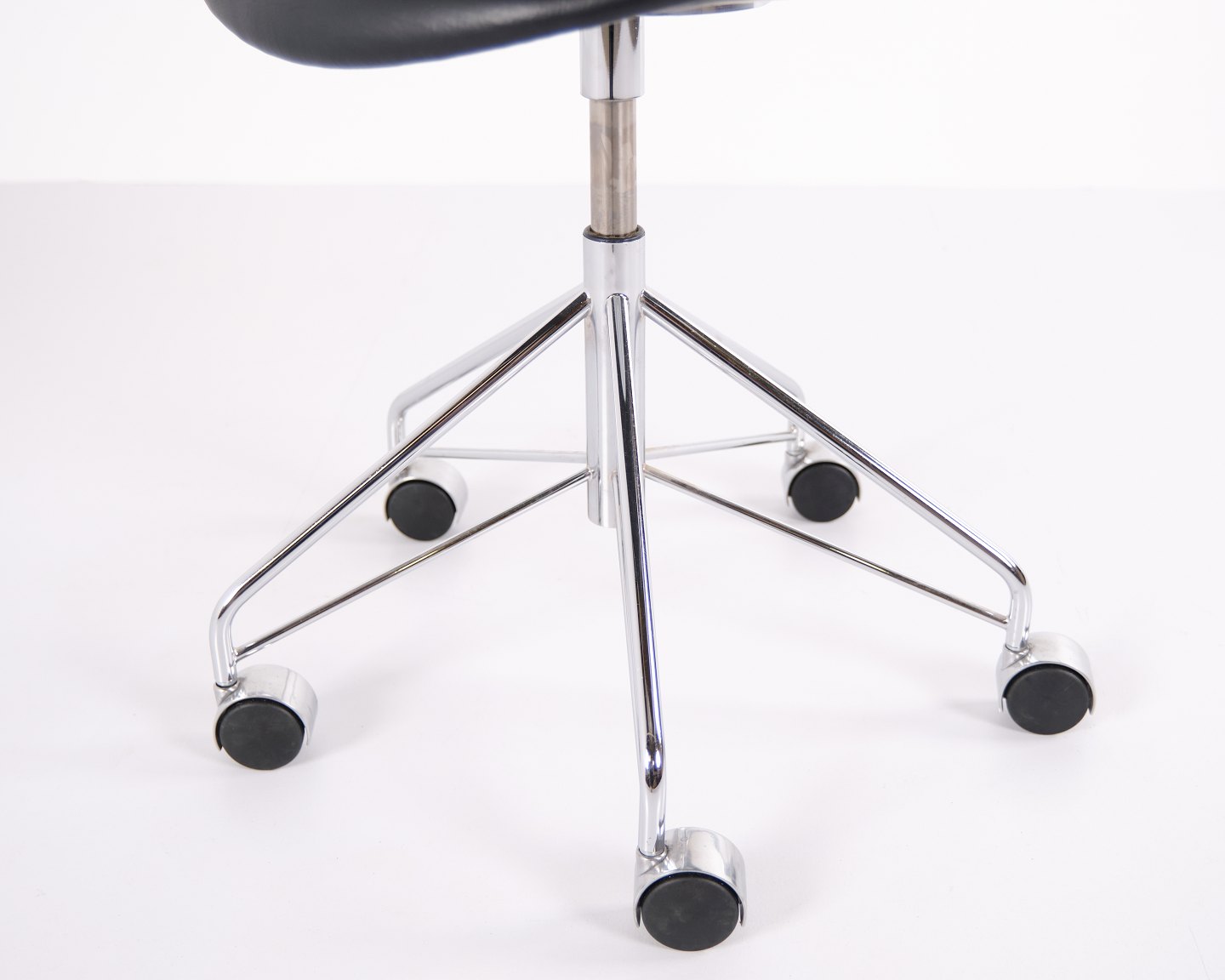 Arne Jacobsen Syver office chair, model 3117, for Fritz Hansen. In black leather and chrome frame with wheels. Classic Danish design.— Origin: Denmark