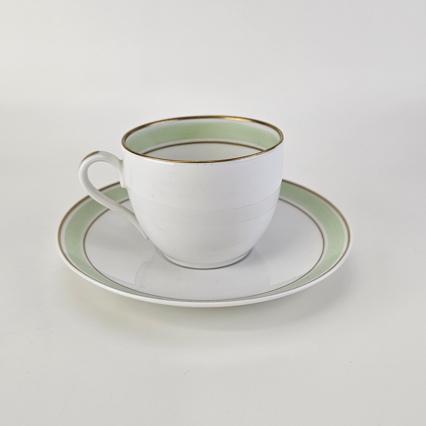 Glat hvidt porcelæn med lysegrøn bord og guldkant