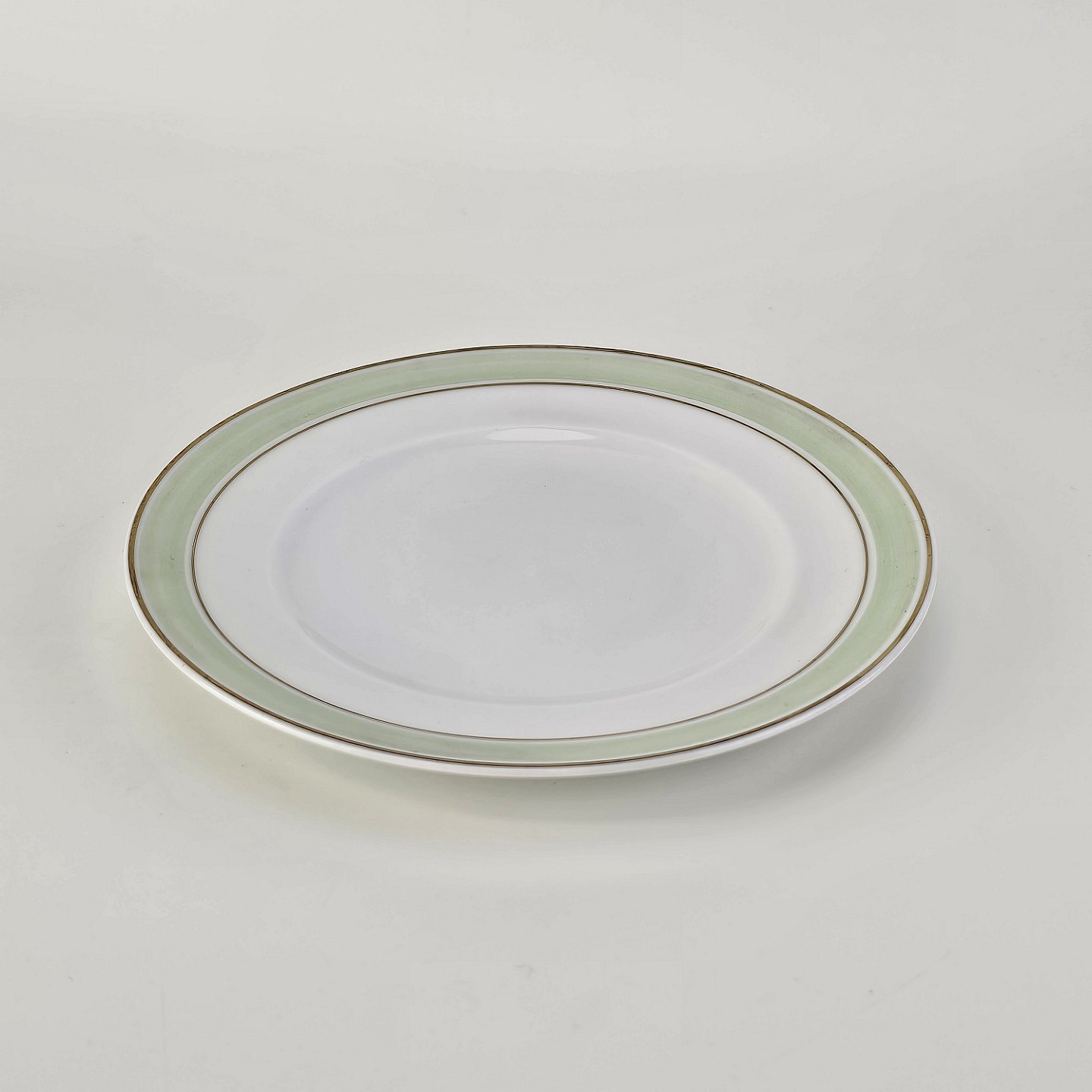 Glat hvidt porcelæn med lysegrøn bord og guldkant