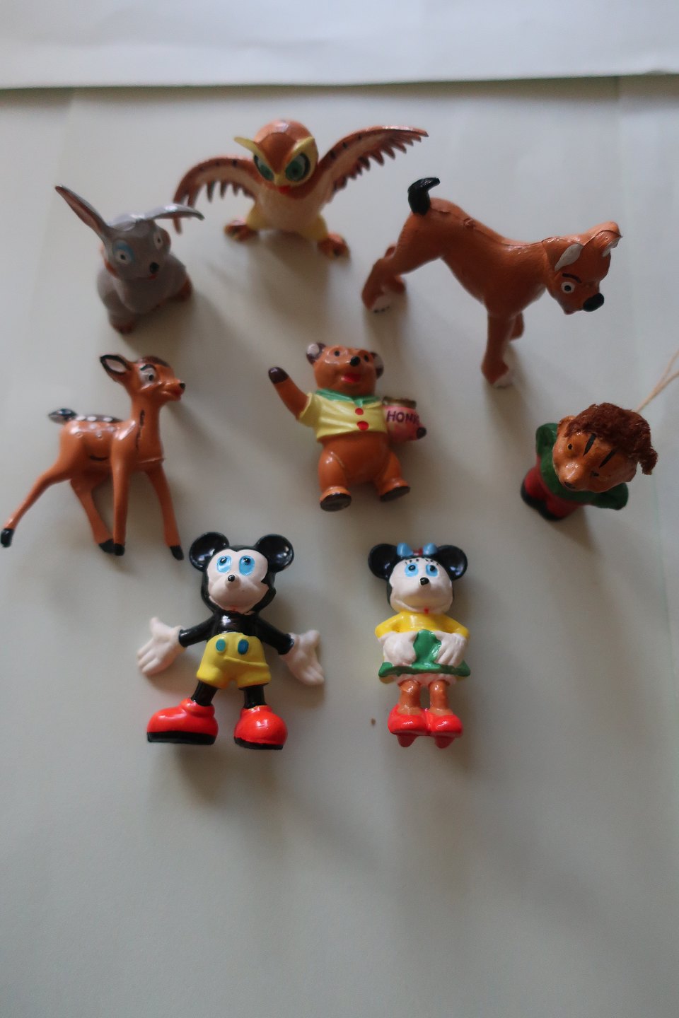 A collection of Disney figures made of plastic, - many of them with a logo-stamp
