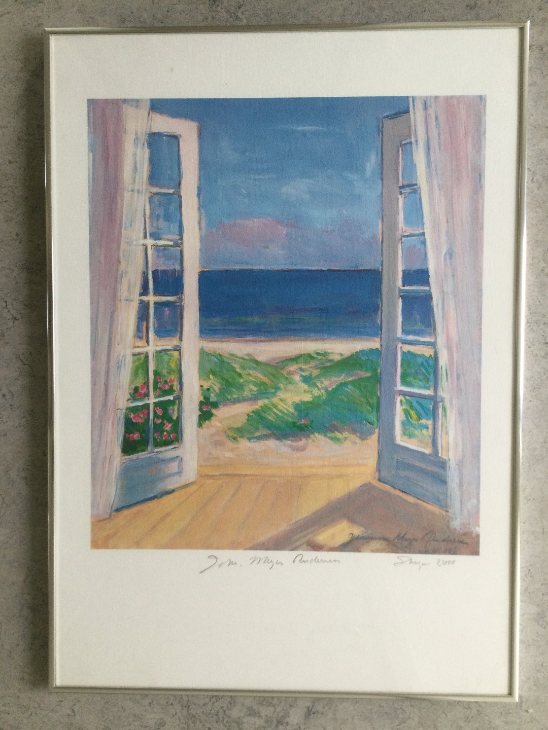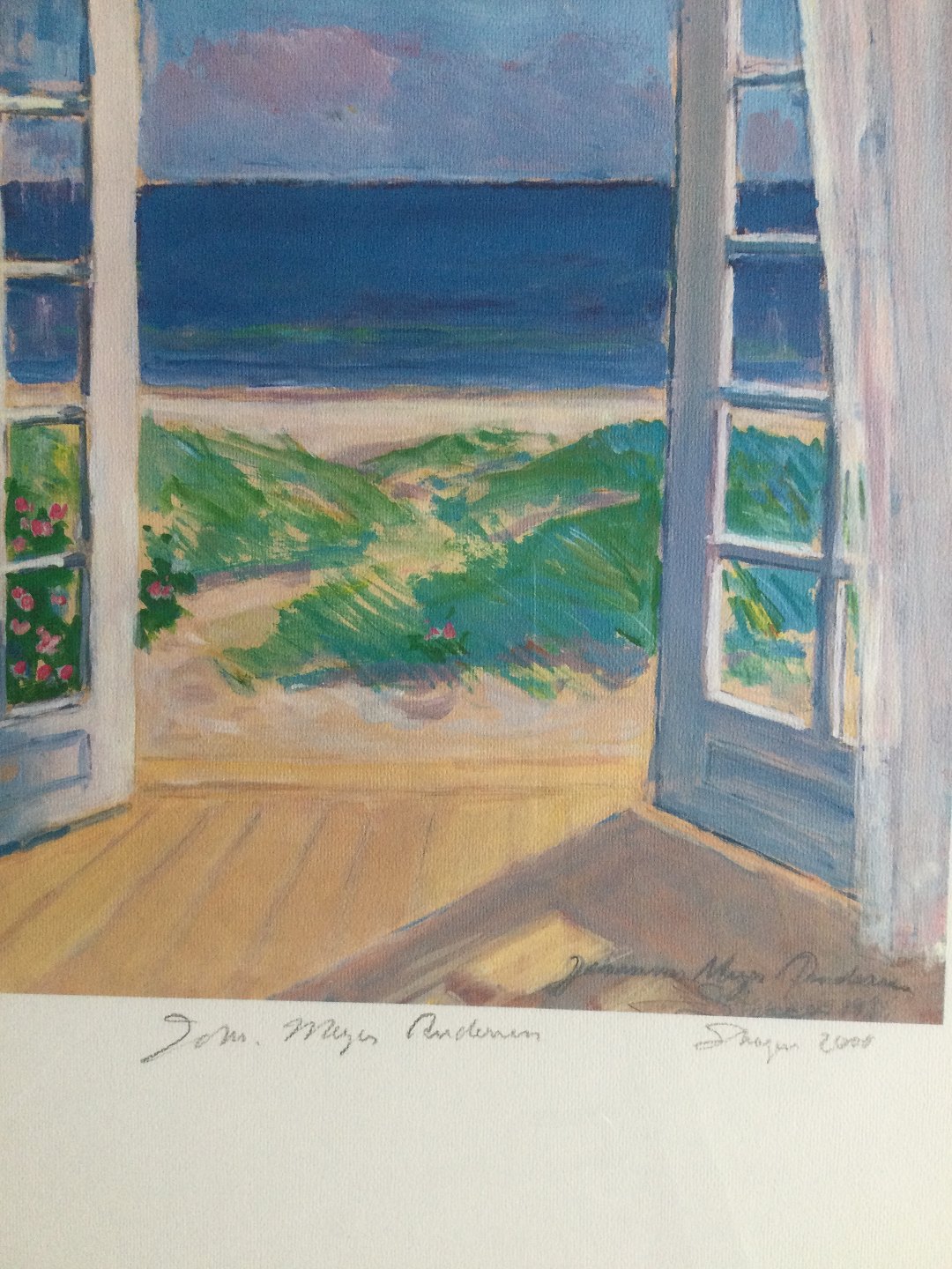 Johannes Meyer Andersen (1918-2005):Parti med åben havedør mod havet, Skagen 1985.