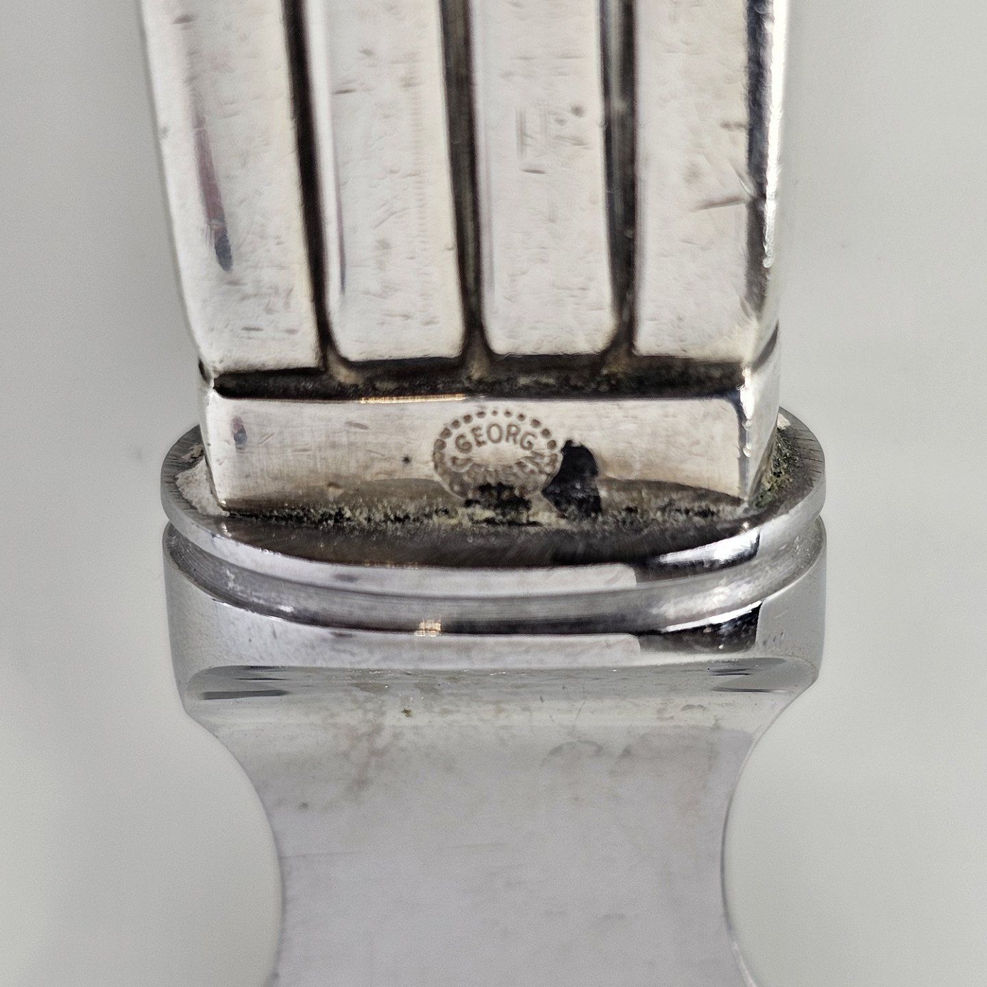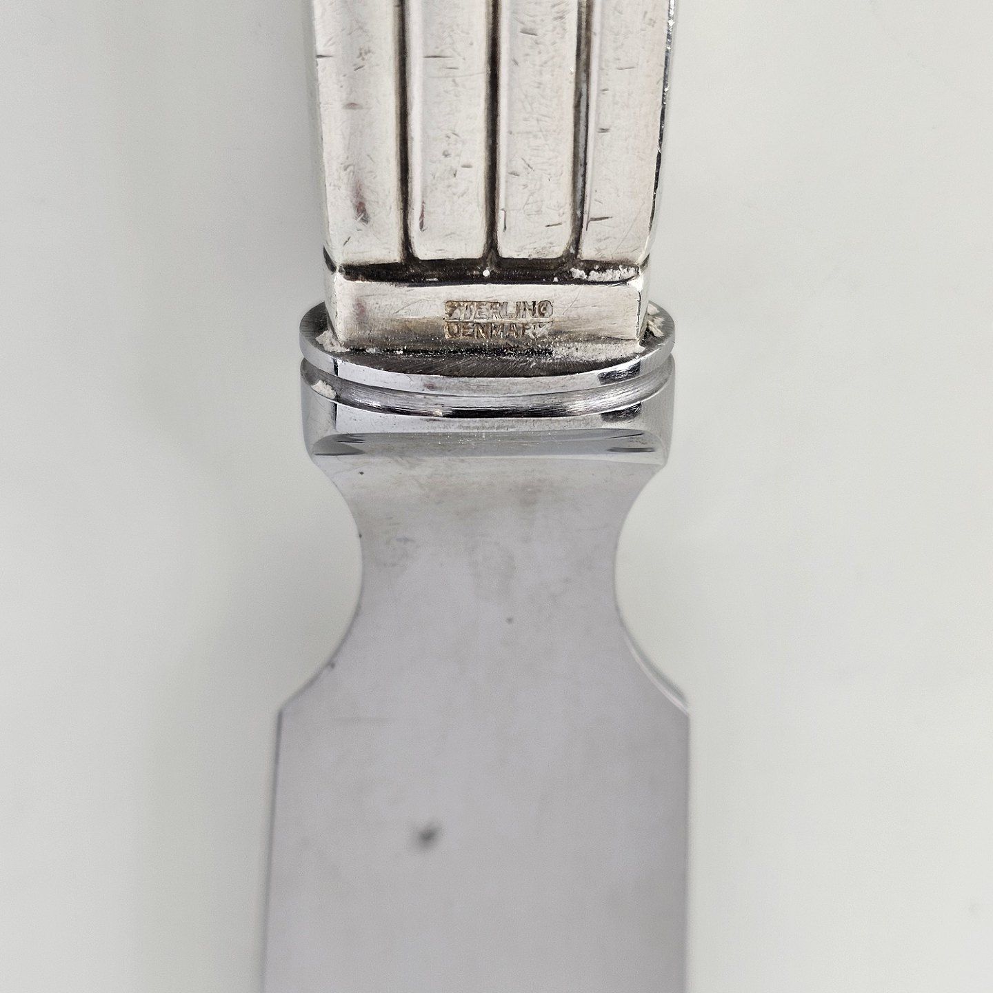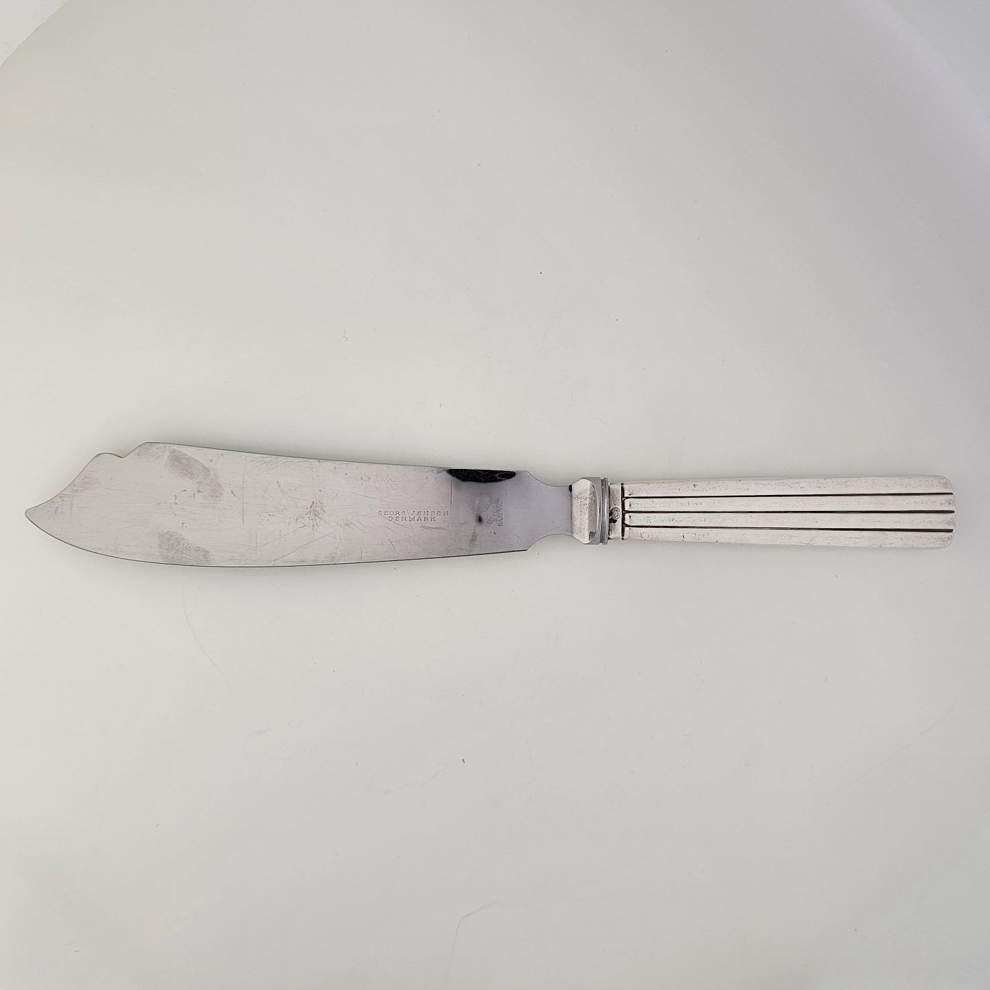 Bernadotte lagkagekniv i sterling sølv, med rustfrit stål skaft dekoreret med striberFormgiver Sigvard Bernadotte (1939)