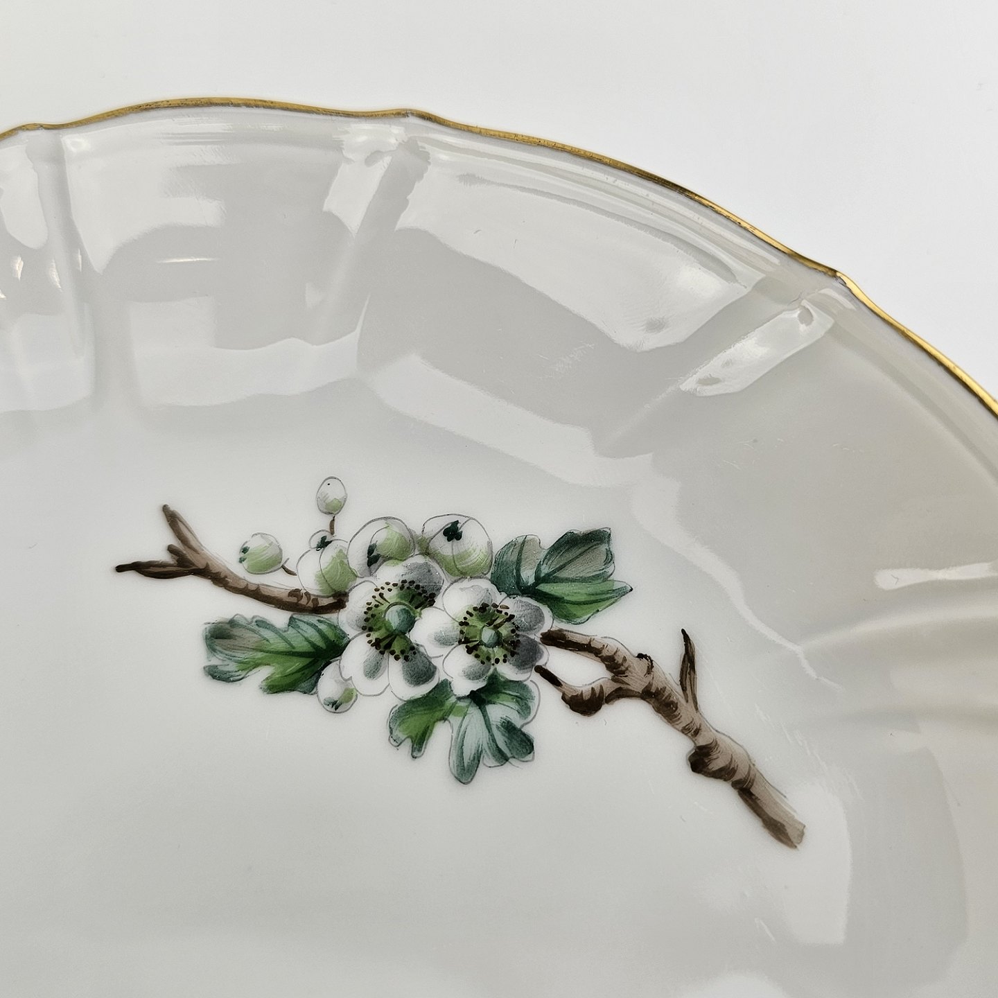 Eremitage er porcelæn dekoreret med hvidtjørn og guldkant