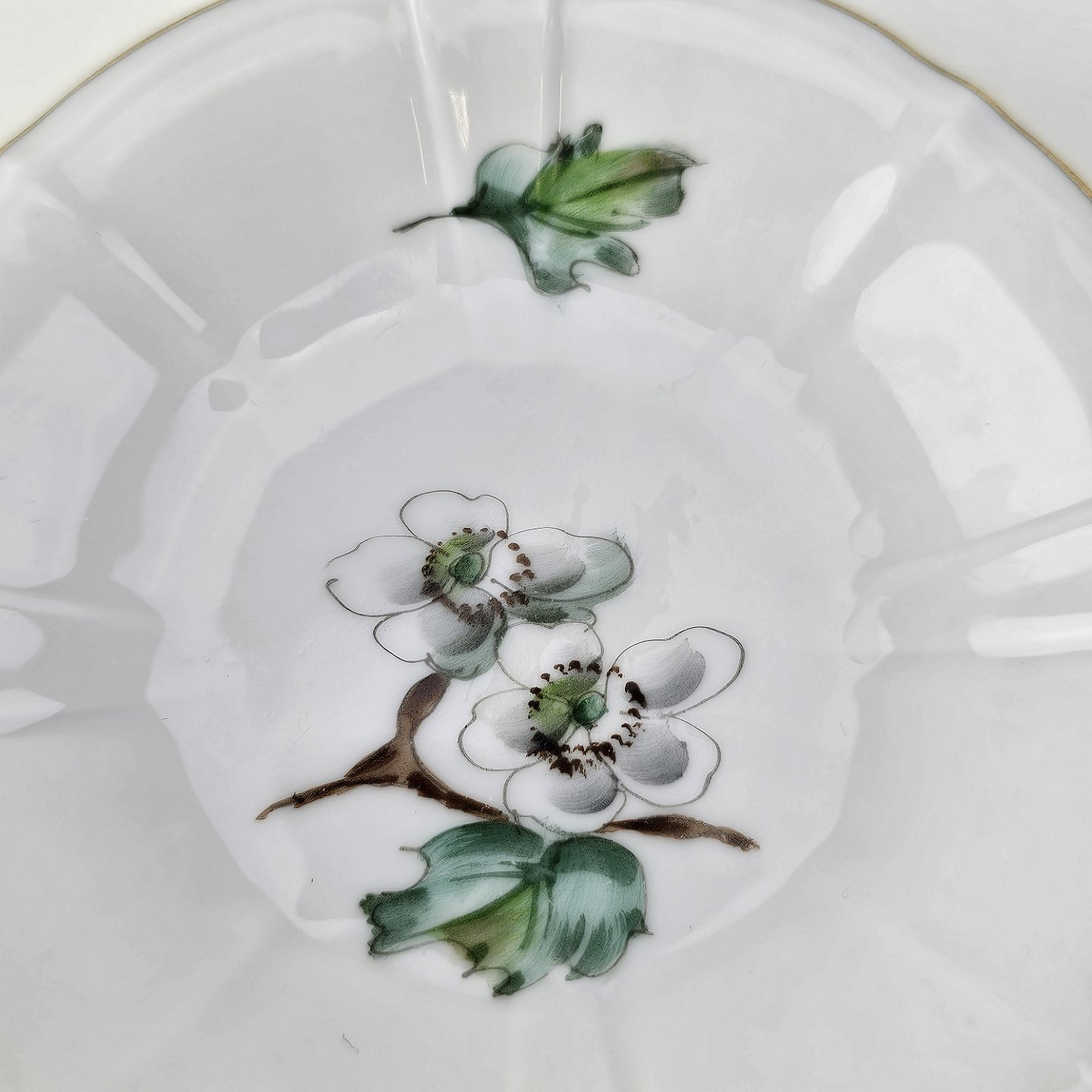 Eremitage er porcelæn dekoreret med hvidtjørn og guldkant