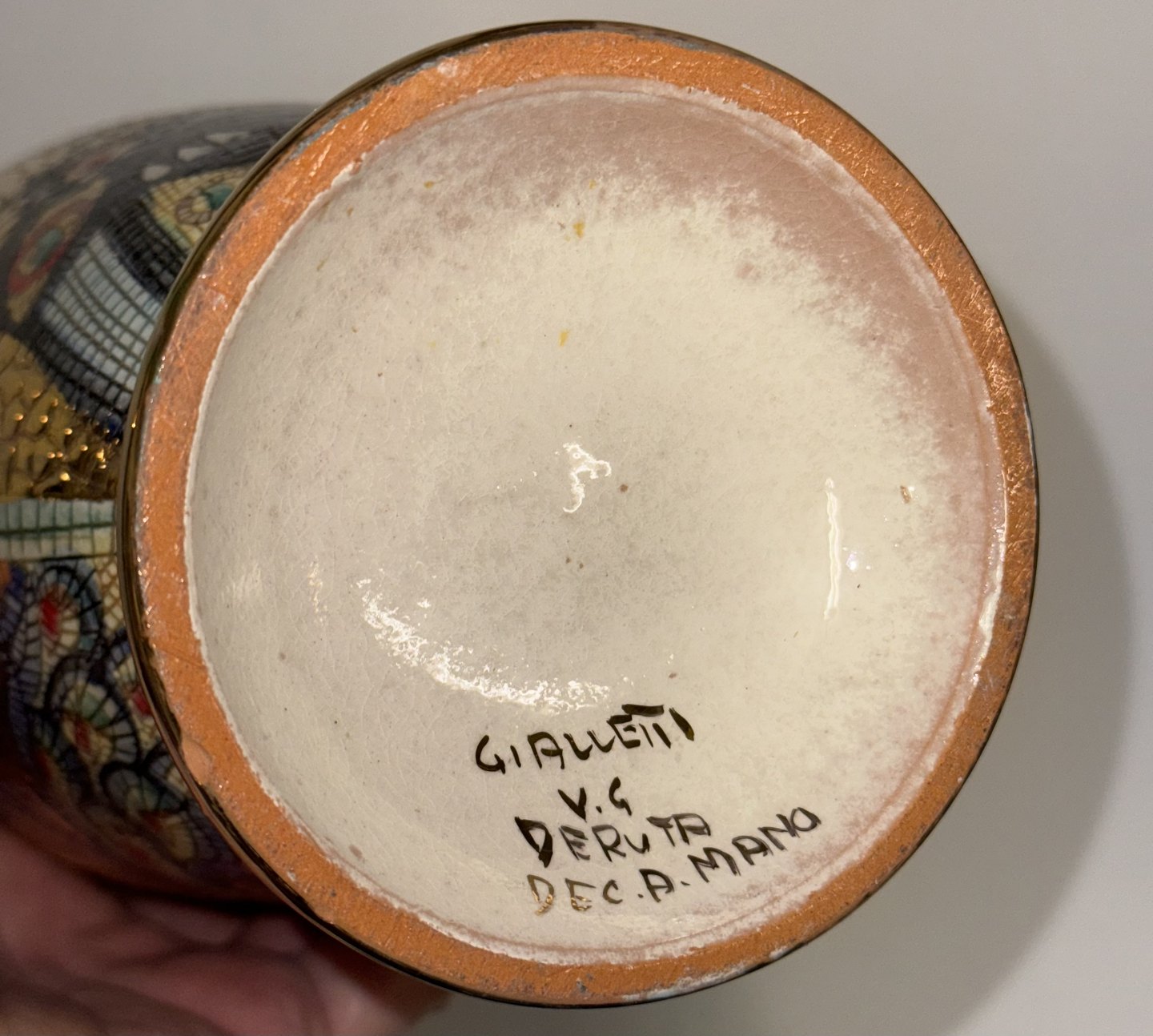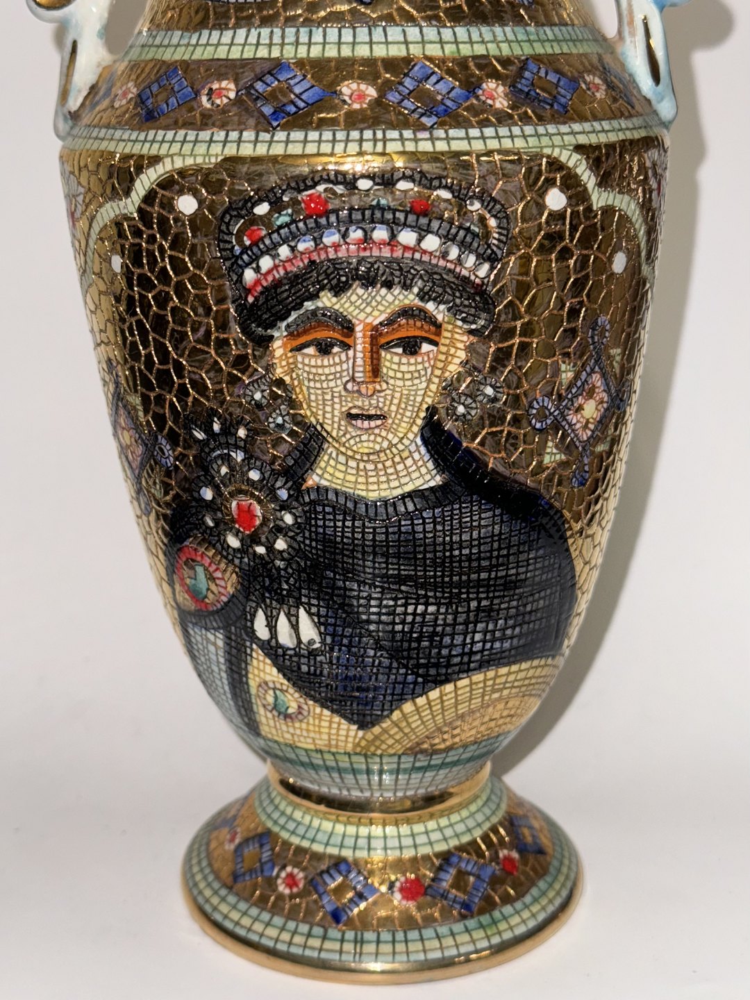 Deruta mosaic jar with handle and lid in majolica made in Umbria, Italy. Motif depicting Empress Theodora, Emperor Justinian's Byzantine wife from the sixth century, later canonized by the Eastern Orthodox Church as Saint Theodora. The mosaic design is engraved by hand, directly on the vase, instead of small attached pieces. On the back a motif With a colourful peacock. The item has a very colorful expression with a metallic surface. Appears in good condition. Factory mark on the bottom. H. 33.5 cm including lid. Dealer