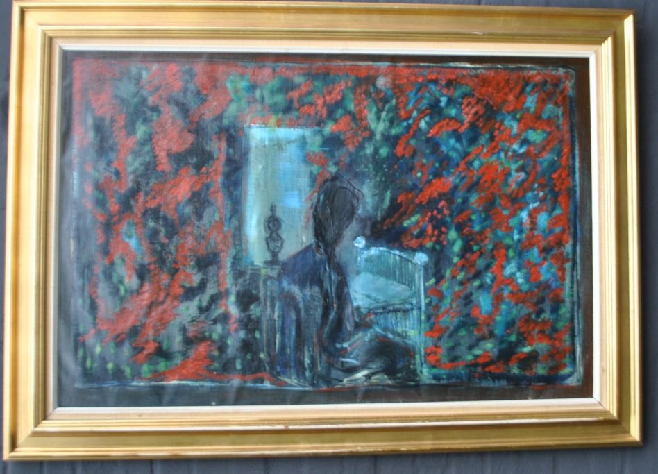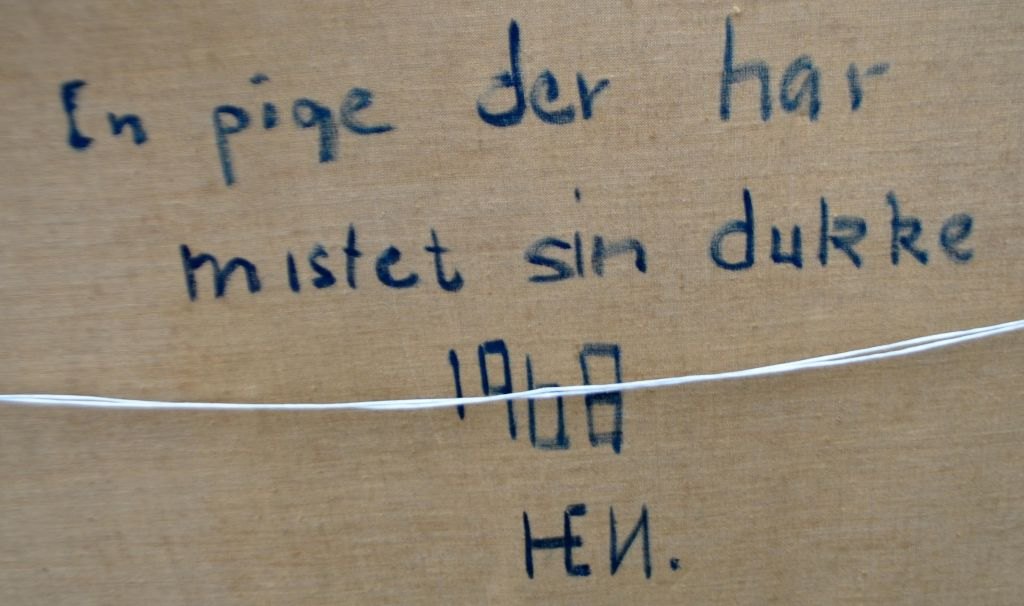 Danish artist (20th century): A girl who has lost her doll. Oil on canvas. Verso text and monogram 1968. 66 x 100 cm. Framed: 85 x 120 cm. Given as a gift to art dealer Hans Erik Nielsen, Aarhus. Presumably a work by Kaj Christensen.Item number: 28539