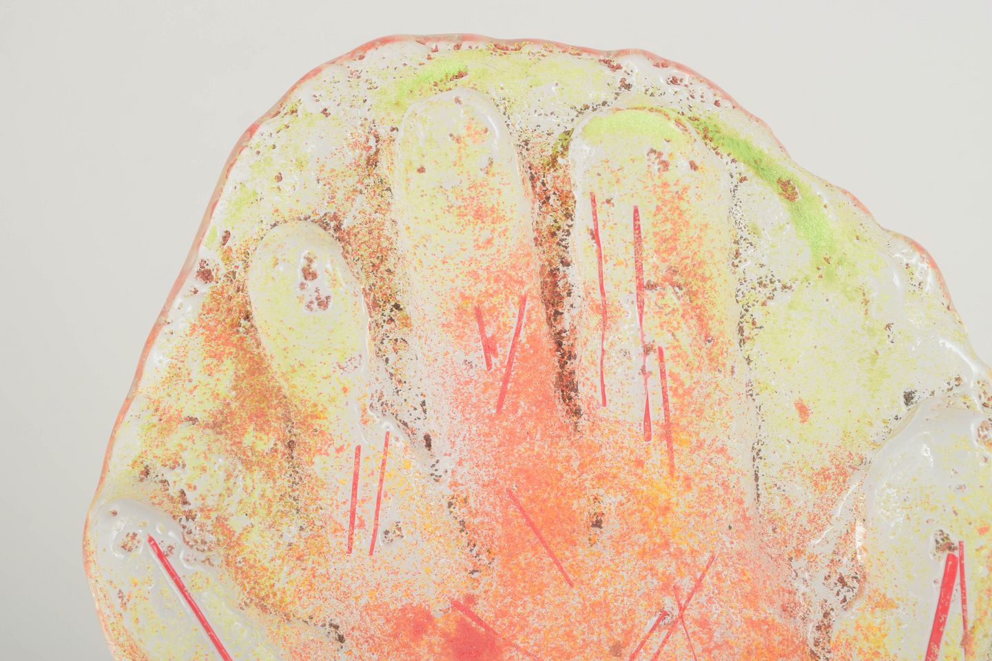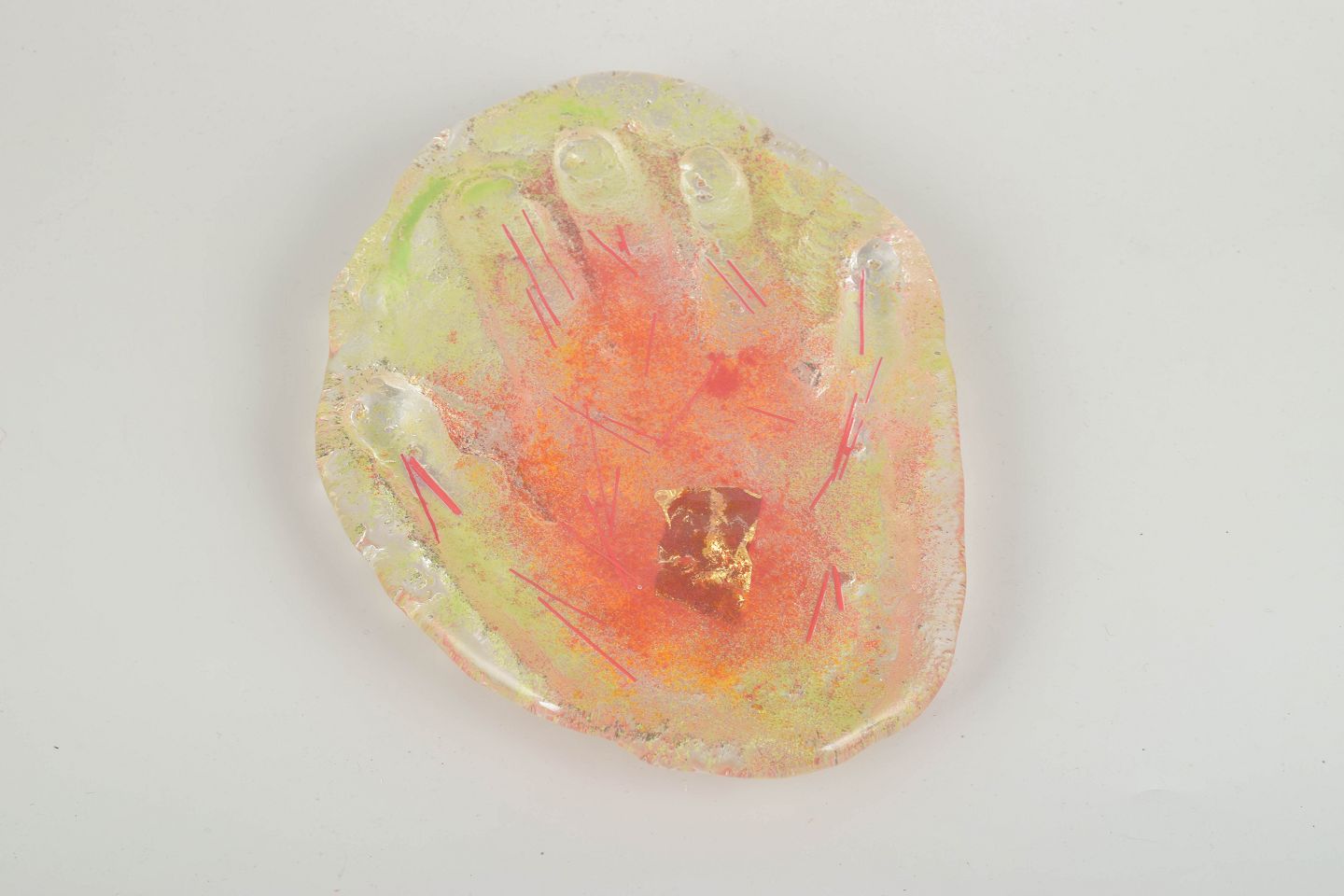 Hand-shaped glass relief in the form of an open palm, rendered in translucent tones of orange, yellow, and pink with embedded gold leaf. An expressive piece that unites symbolism and vibrant colour, showcasing Ekegren’s hallmark exploration of light, texture, and materiality.