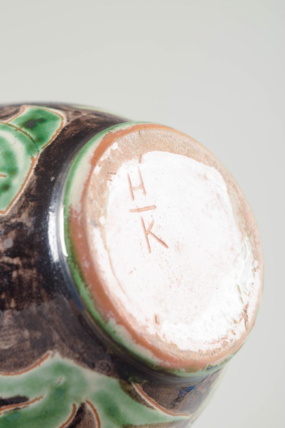 Humlebæk Keramik was a Danish ceramic workshop active during the mid-20th century, known for hand-thrown and hand-decorated works in colourful glazes. The production included both utilitarian and decorative pieces featuring figurative motifs, often inspired by the sea and nature. The workshop’s aesthetic aligns with the Danish folk-ceramic tradition, emphasising craftsmanship and individuality.