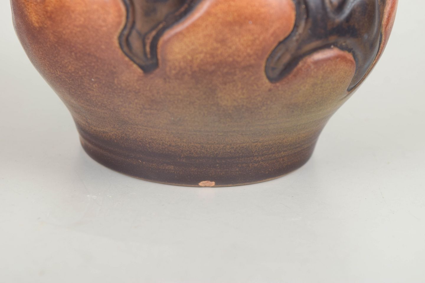 Ipsens Enke vase, model 509, ca. 1910/20s.Art Nouveau vase in glazed ceramic with characteristic sculptural relief decoration in dark brown glaze over a warm golden-orange base. An elegant and classic design from the period, clearly inspired by organic forms found in nature.